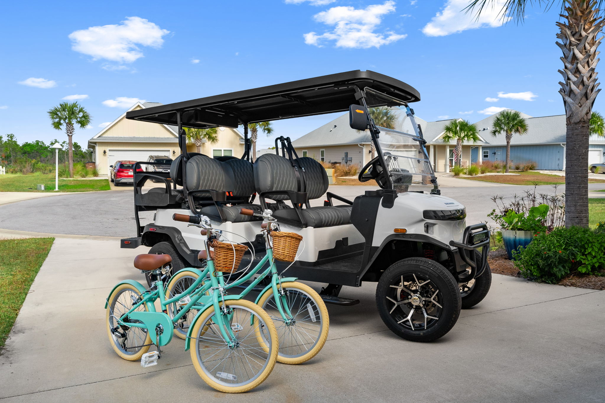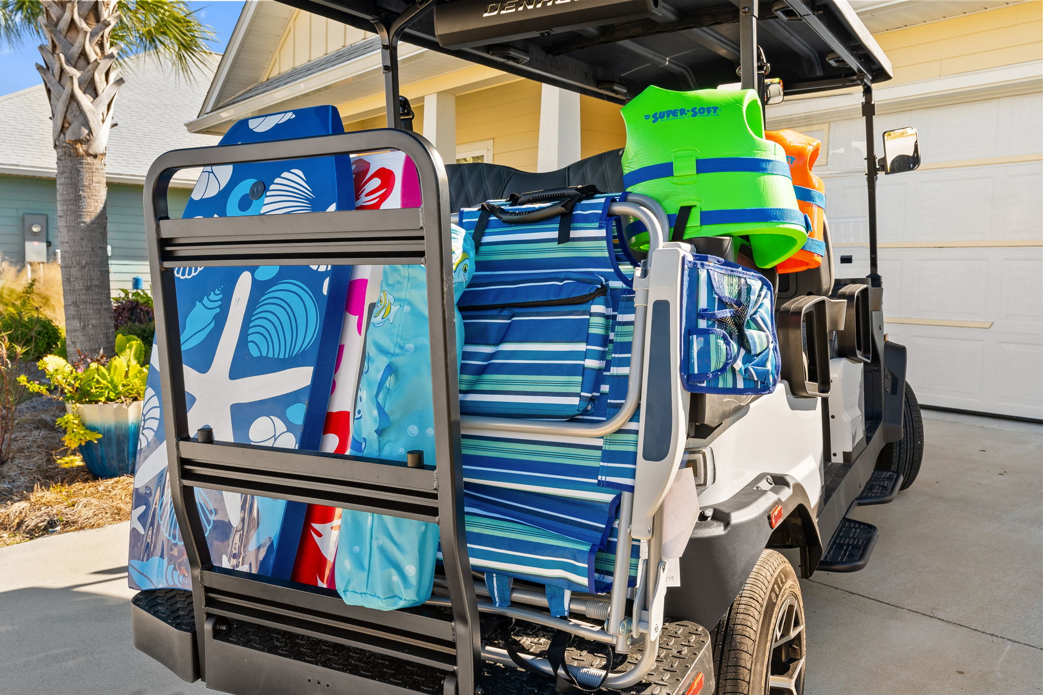 Garage stocked with beach gear, bicycles, golf cart, and games