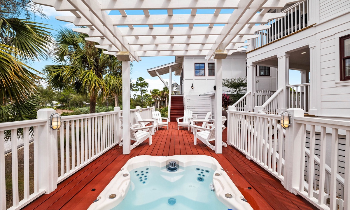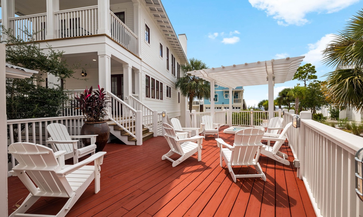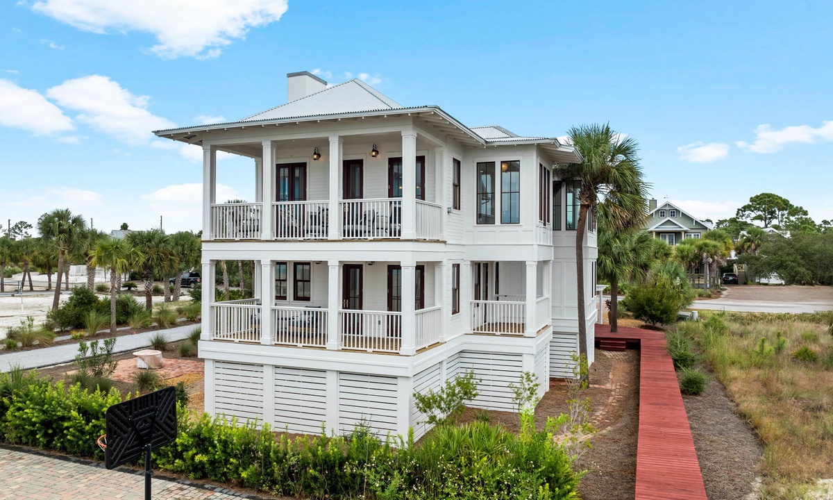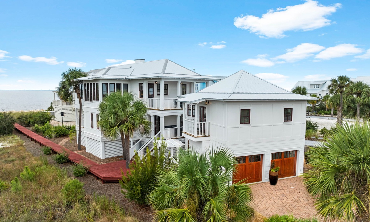 Each spacious bedroom comes with its own private balcony and outdoor seating—ideal for sipping your morning coffee or catching a quiet sunset. The main home also features a private hot tub, outdoor shower, and cozy fire pit—perfect for nights under the stars. Access the beach in no time with the home's own private beach boardwalk.
