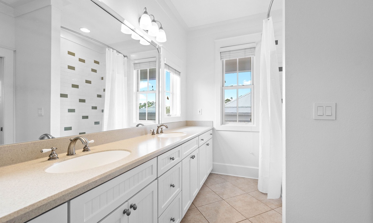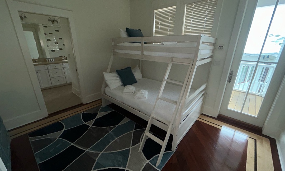 1 Twin over Full Bunk bed room with semi-private bathroom with tub/shower combo
