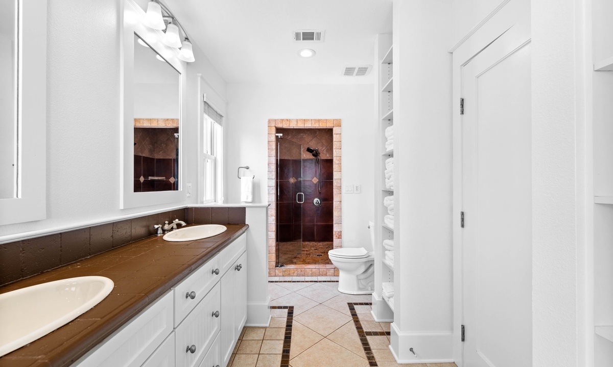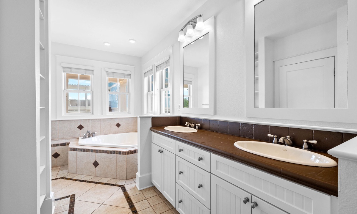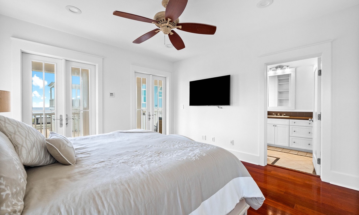 1 King Master bedroom with en suite bathroom with walk in shower and garden tub
