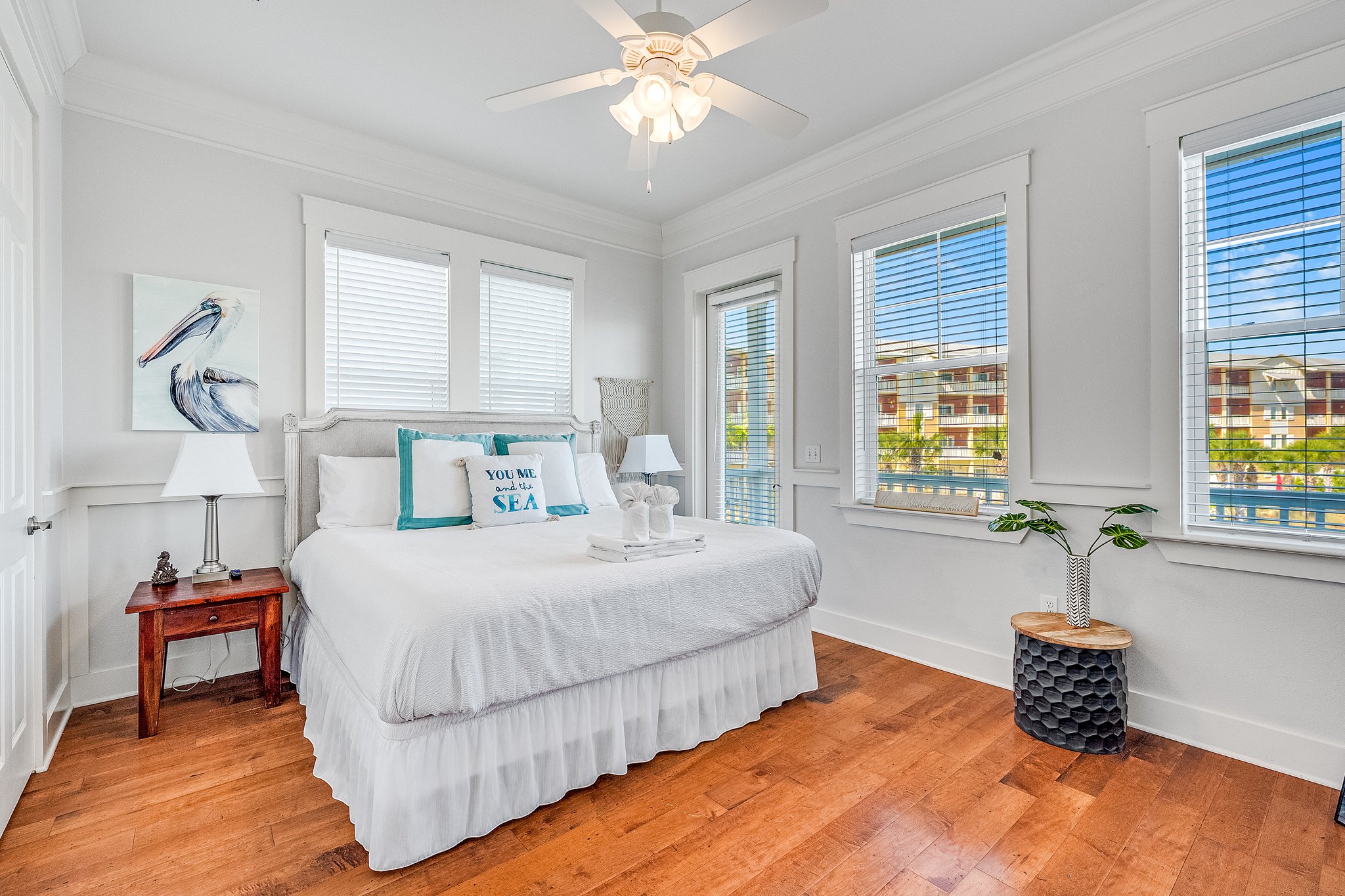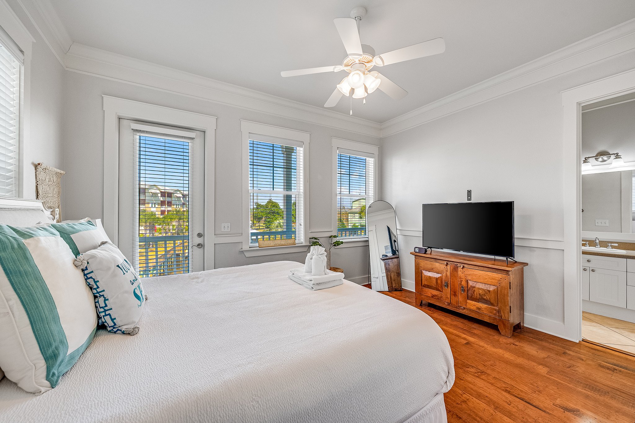 Bedroom 1: TV, King Bed, ensuite bathroom and balcony with canal/pool view