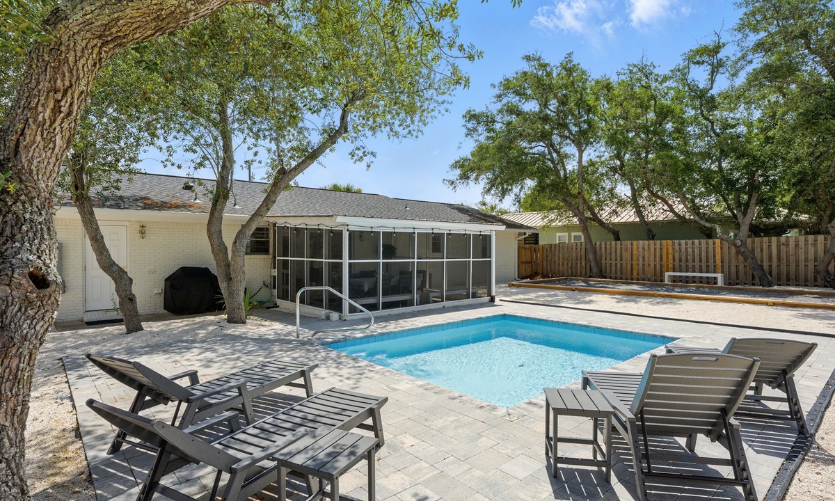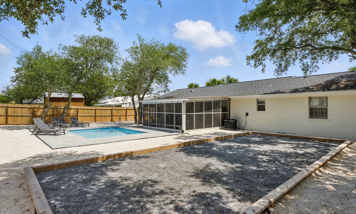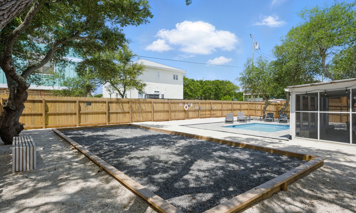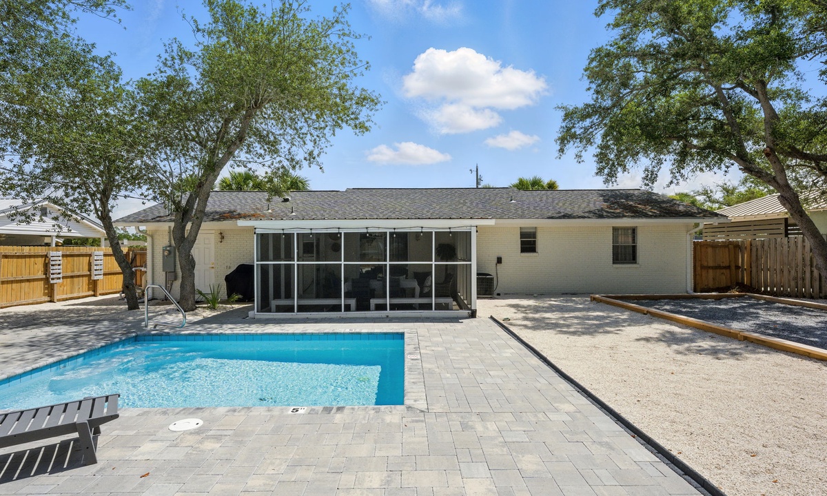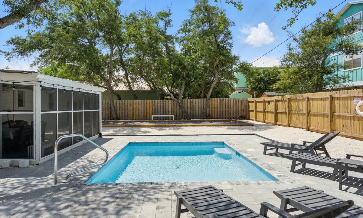 Imagine starting your day with a cup of coffee on the screened-in patio, taking in the salty breeze before heading out for beach adventures. After a day in the sun, come back and cool off in your own private pool — or challenge the crew to a friendly game of bocce ball in the backyard court!
