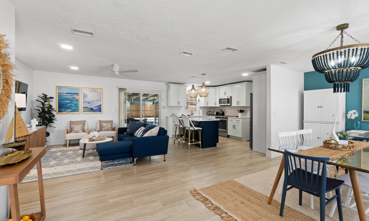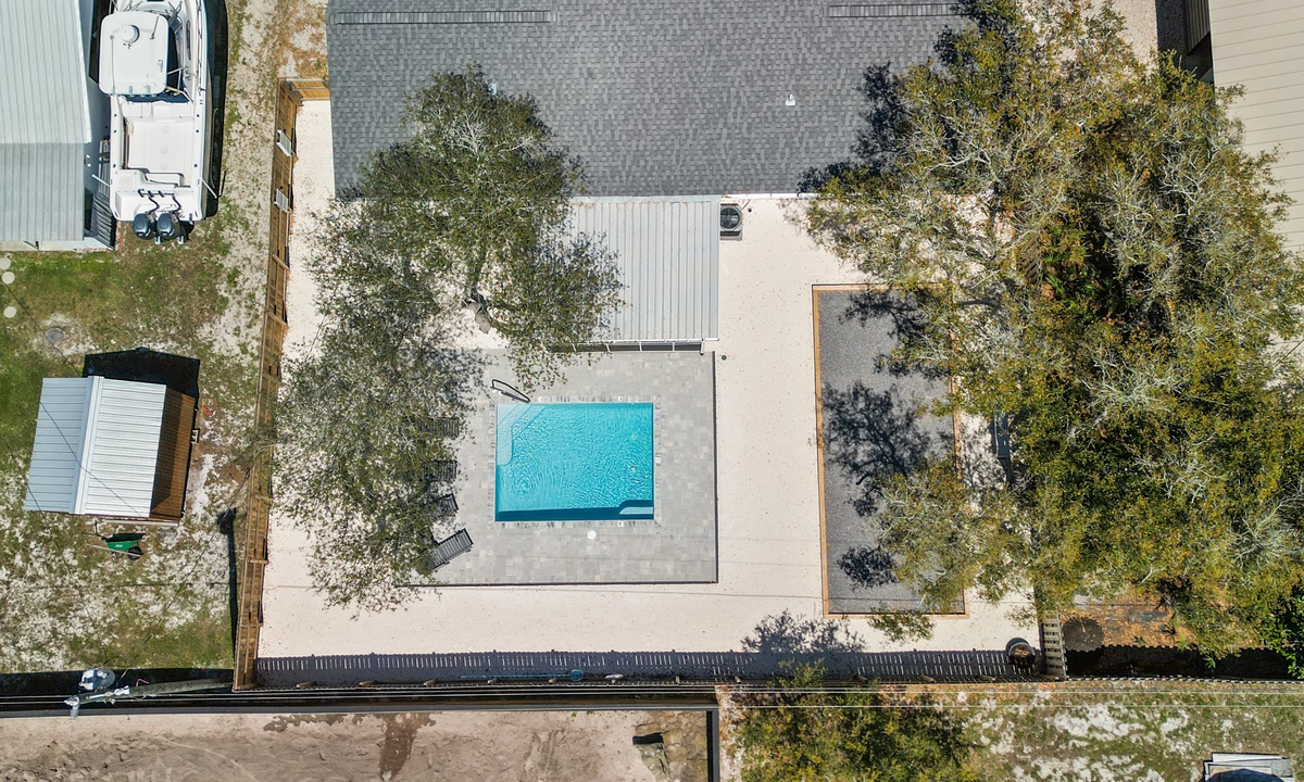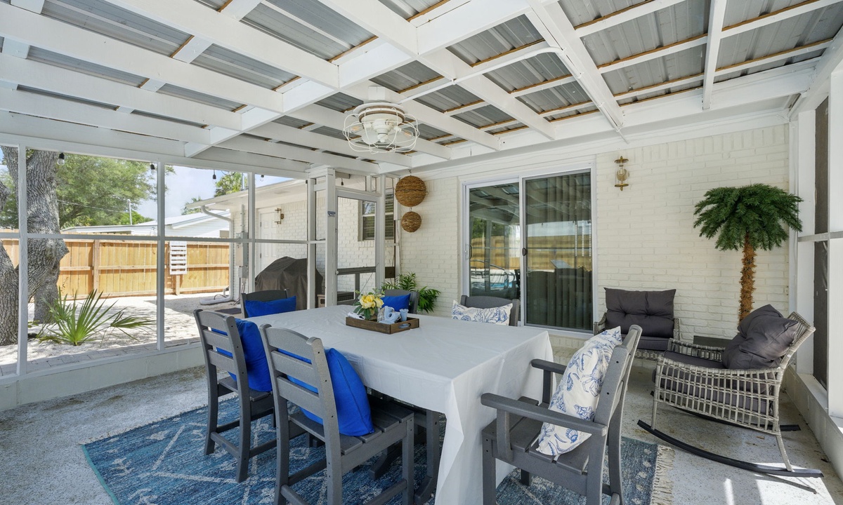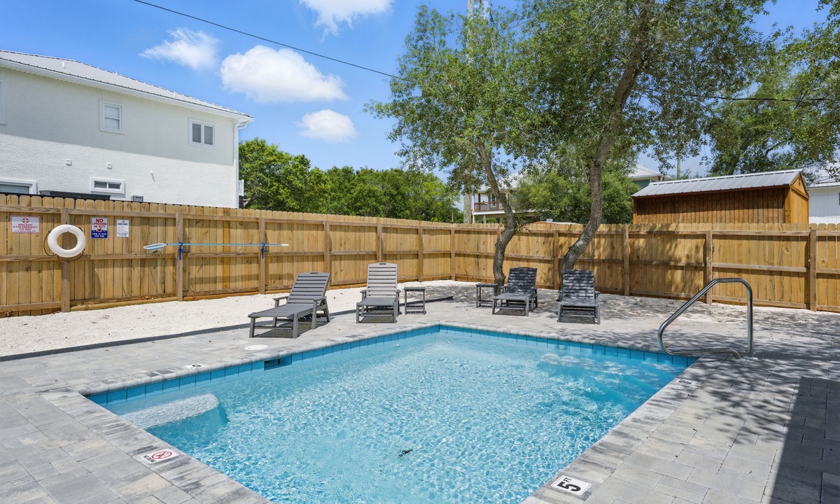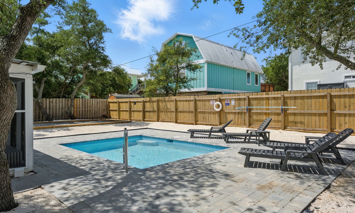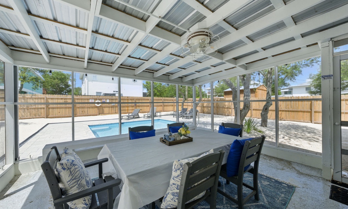Imagine starting your day with a cup of coffee on the screened-in patio, taking in the salty breeze before heading out for beach adventures. After a day in the sun, come back and cool off in your own private pool — or challenge the crew to a friendly game of bocce ball in the backyard court!