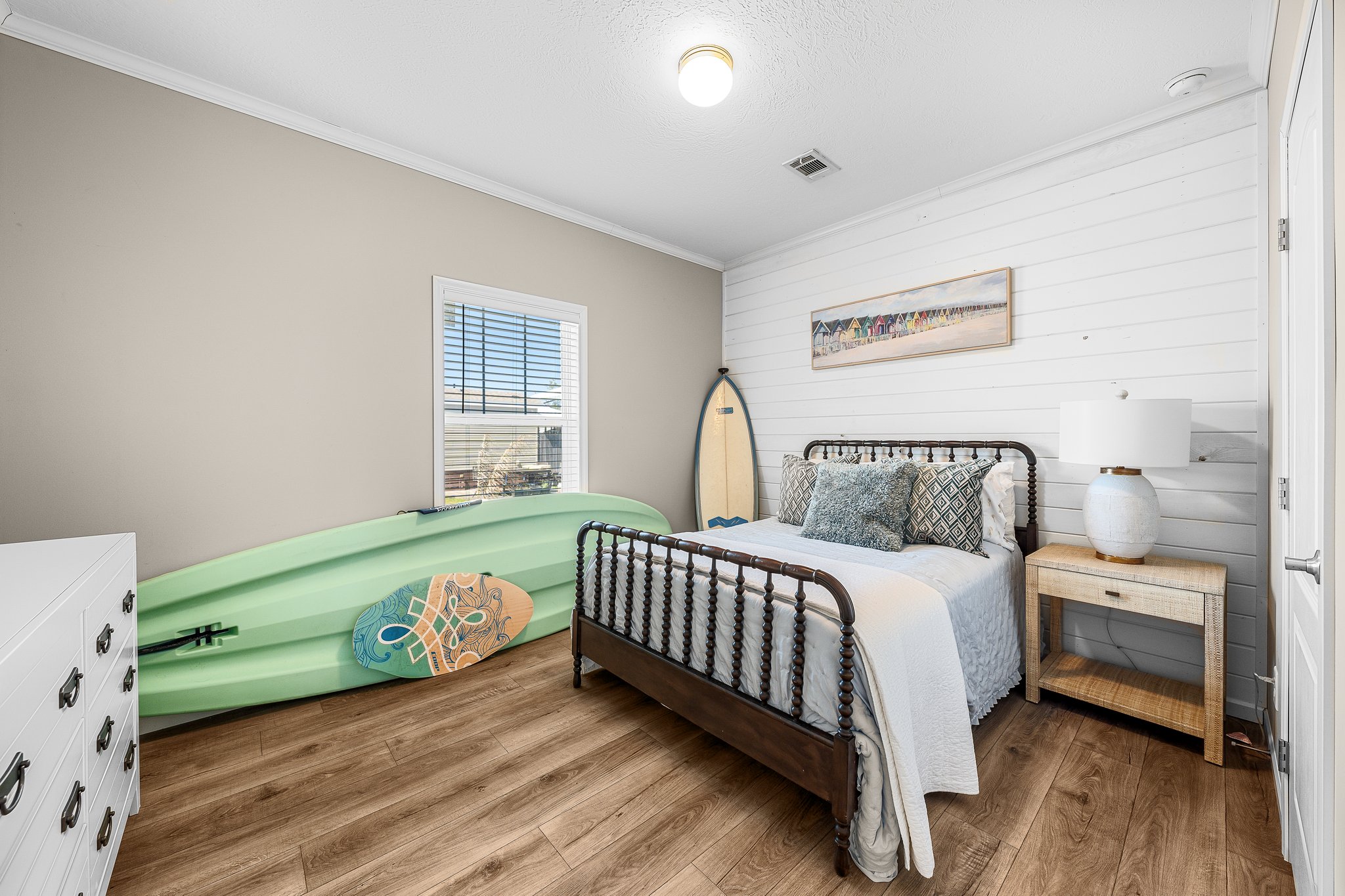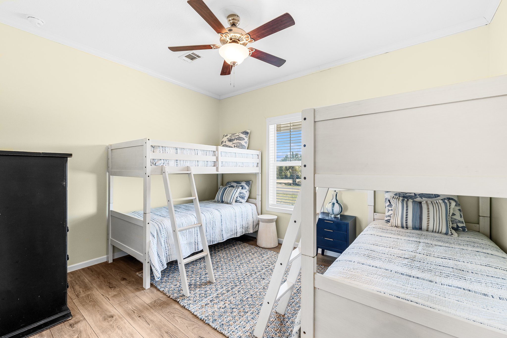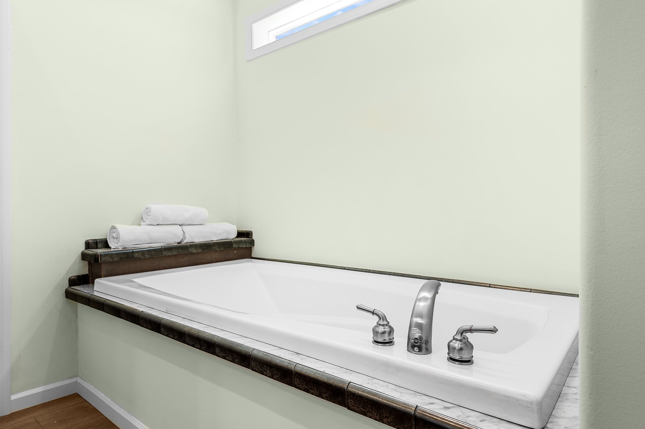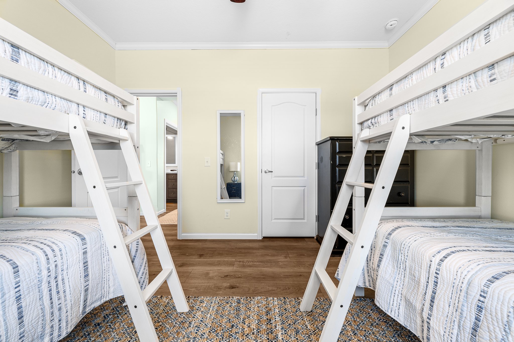 The spacious master bedroom offers a peaceful escape with a king bed and a private en suite bathroom featuring a double vanity, walk-in shower, and a relaxing soaking tub—ideal after a day at the beach. Additional sleeping includes a bunk room with two twin-over-twin bunks and a bedroom with a full bed, comfortably accommodating families and groups.