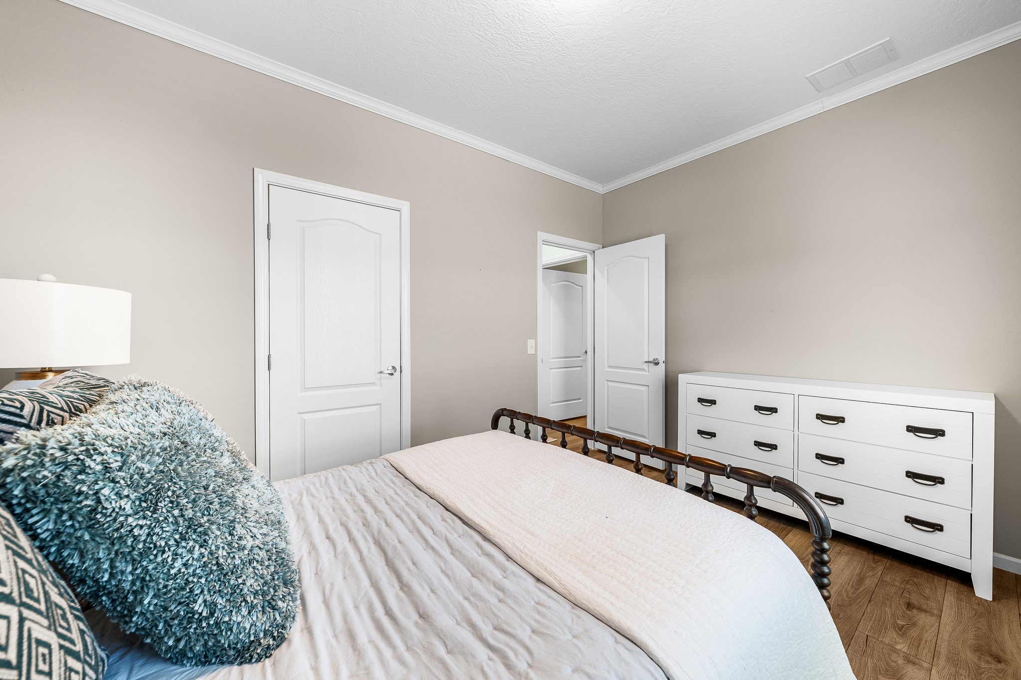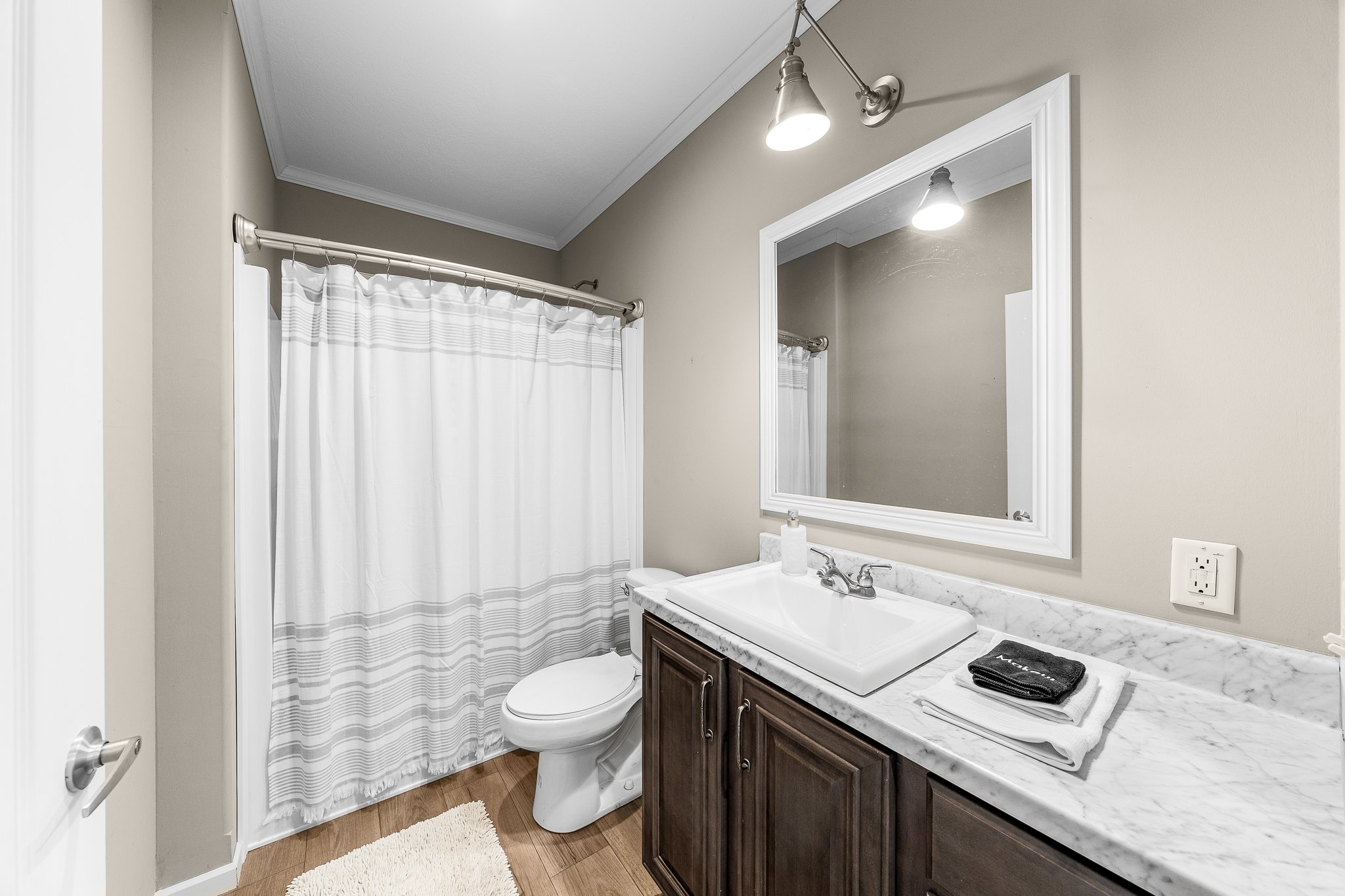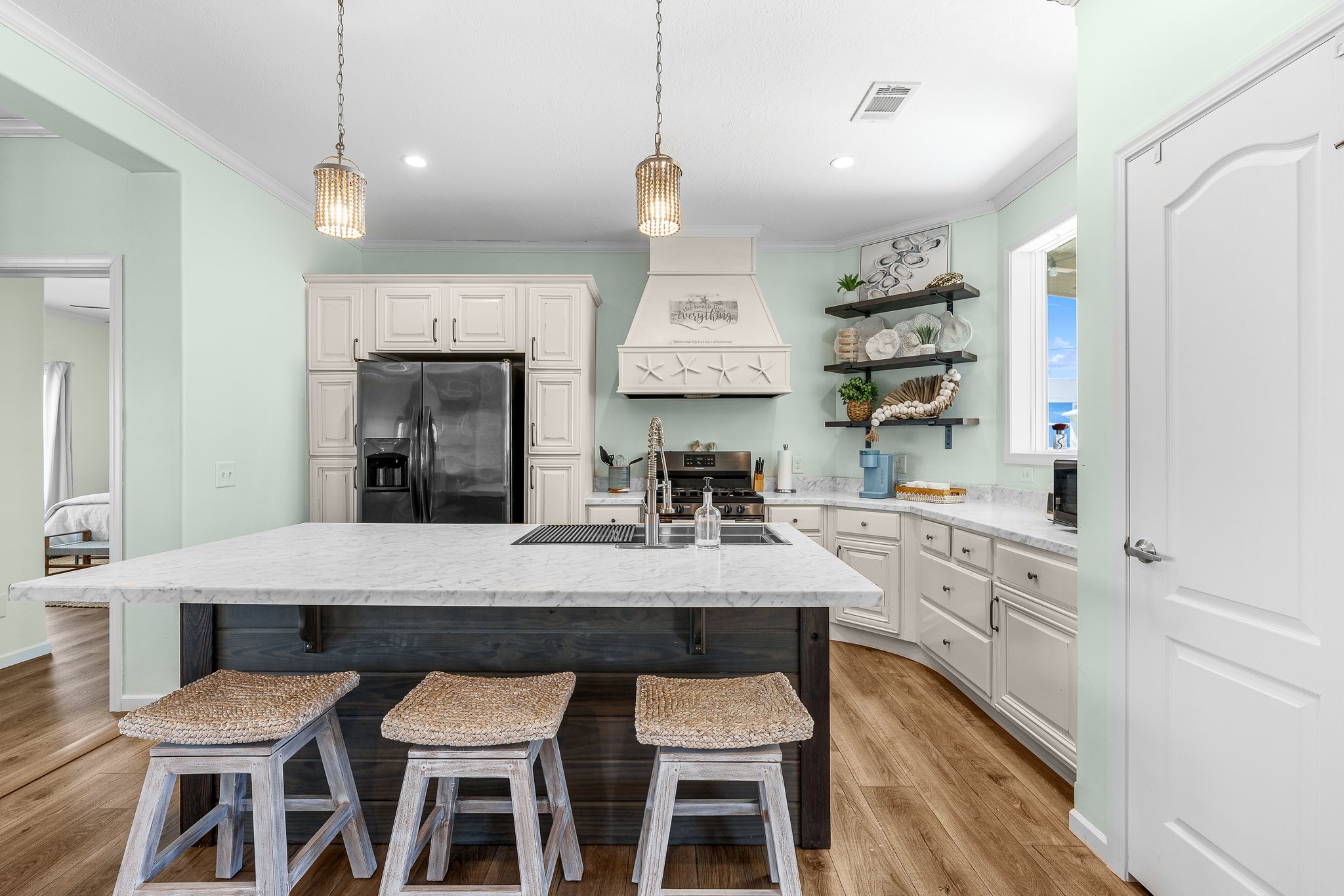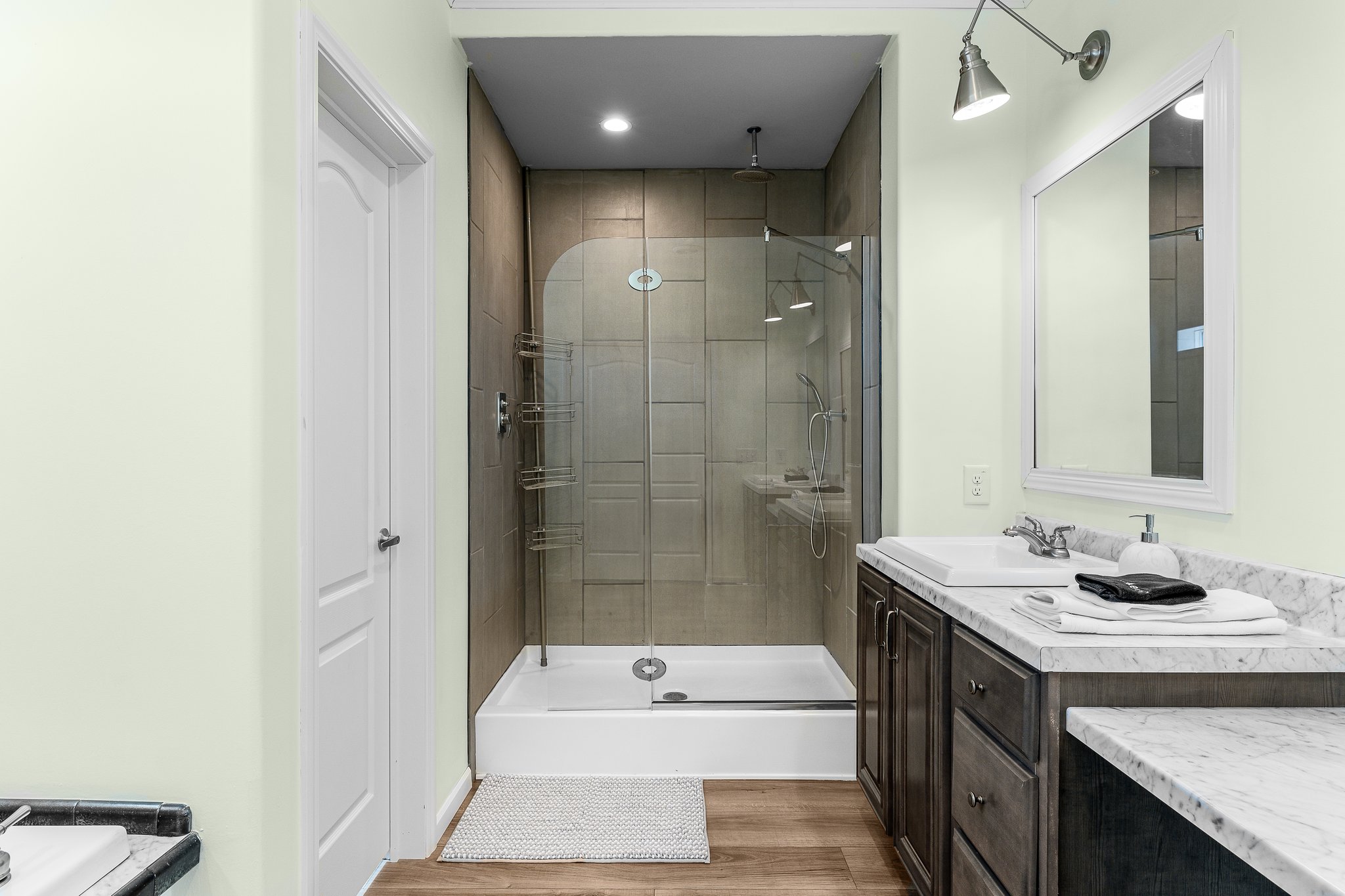 The spacious master bedroom offers a peaceful escape with a king bed and a private en suite bathroom featuring a double vanity, walk-in shower, and a relaxing soaking tub—ideal after a day at the beach. Additional sleeping includes a bunk room with two twin-over-twin bunks and a bedroom with a full bed, comfortably accommodating families and groups.