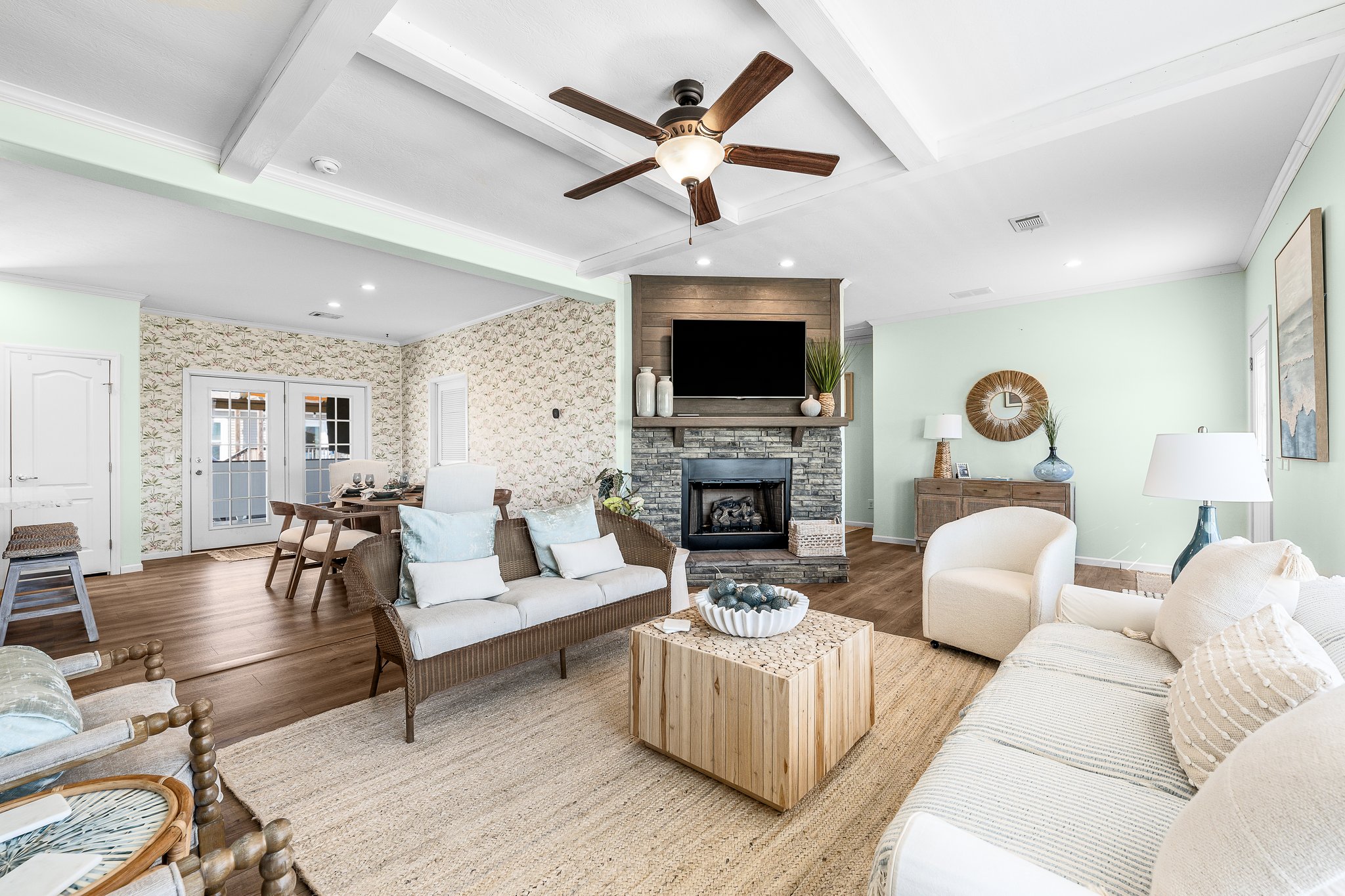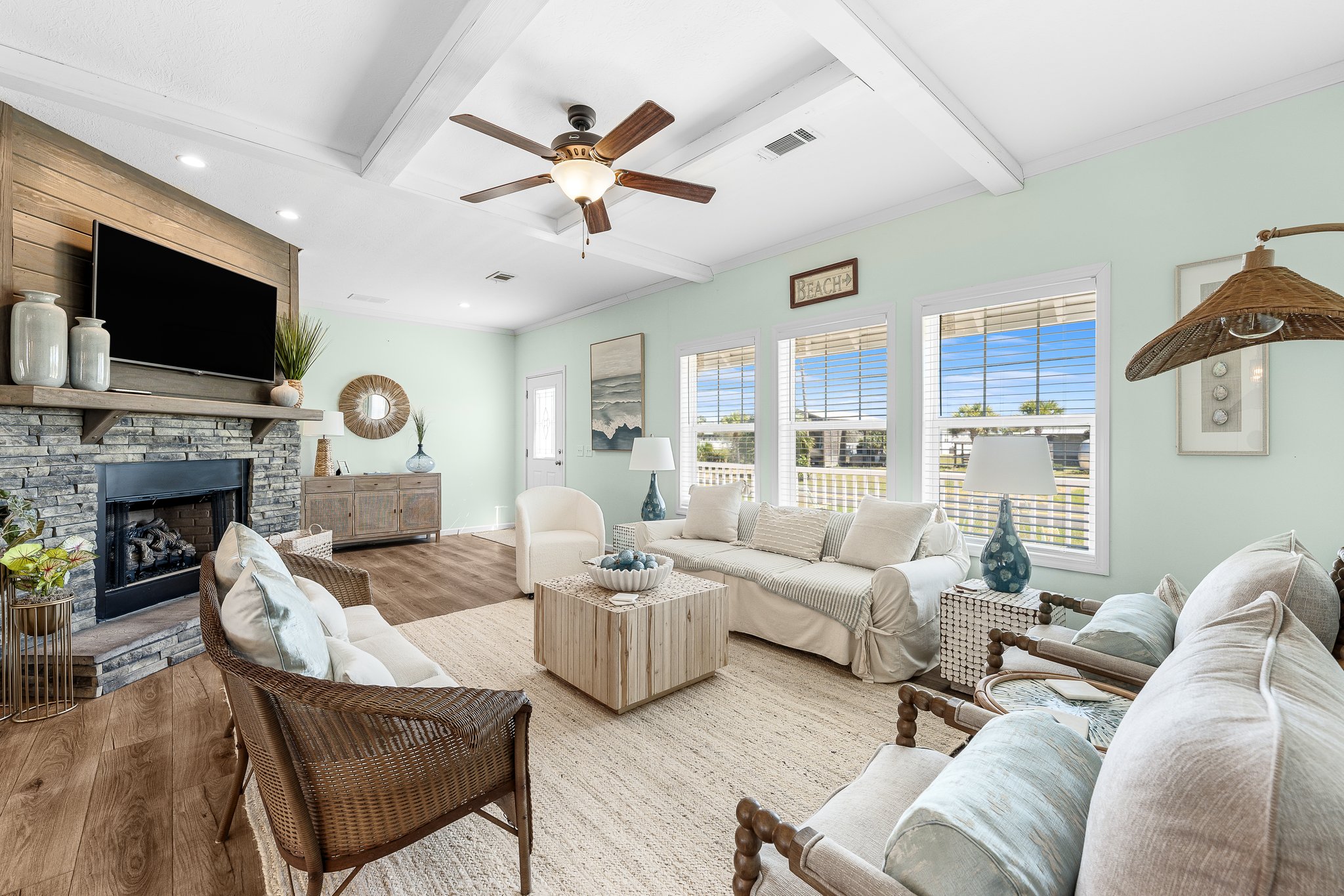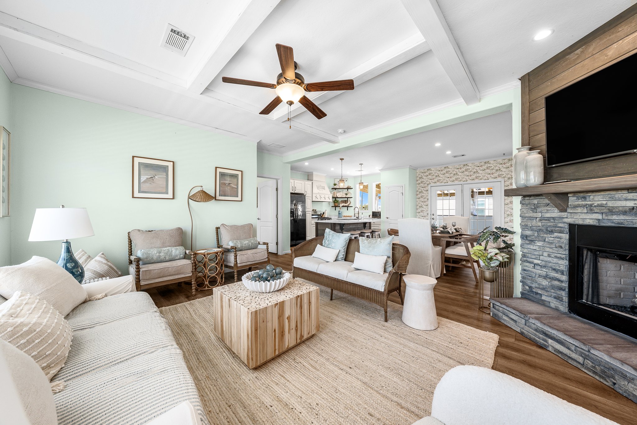 The home features a cozy living space with a gas fireplace, perfect for cooler evenings or relaxing after a sunset stroll on the beach.