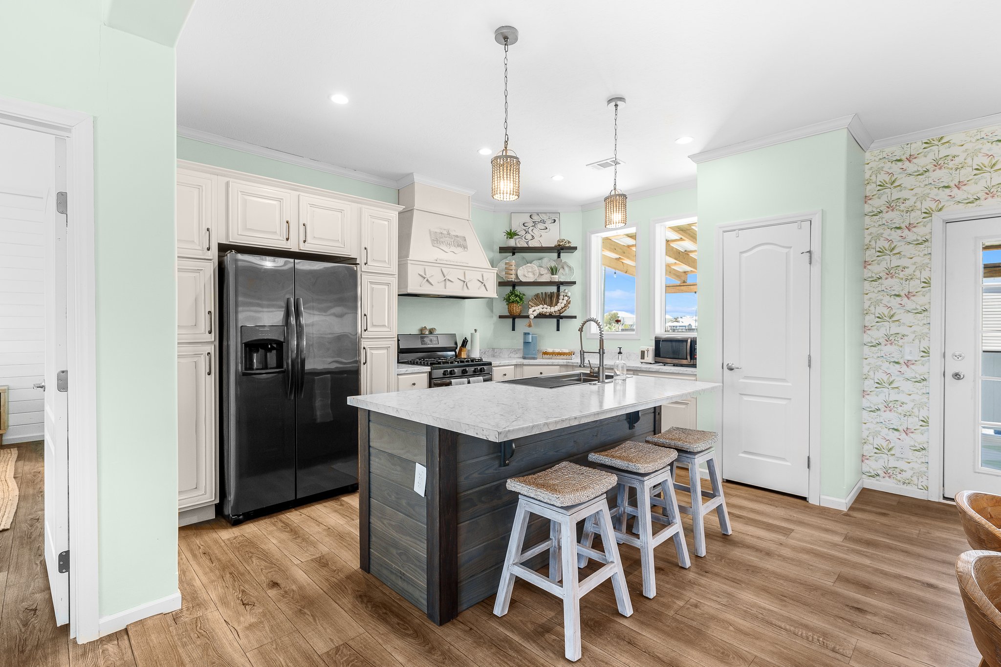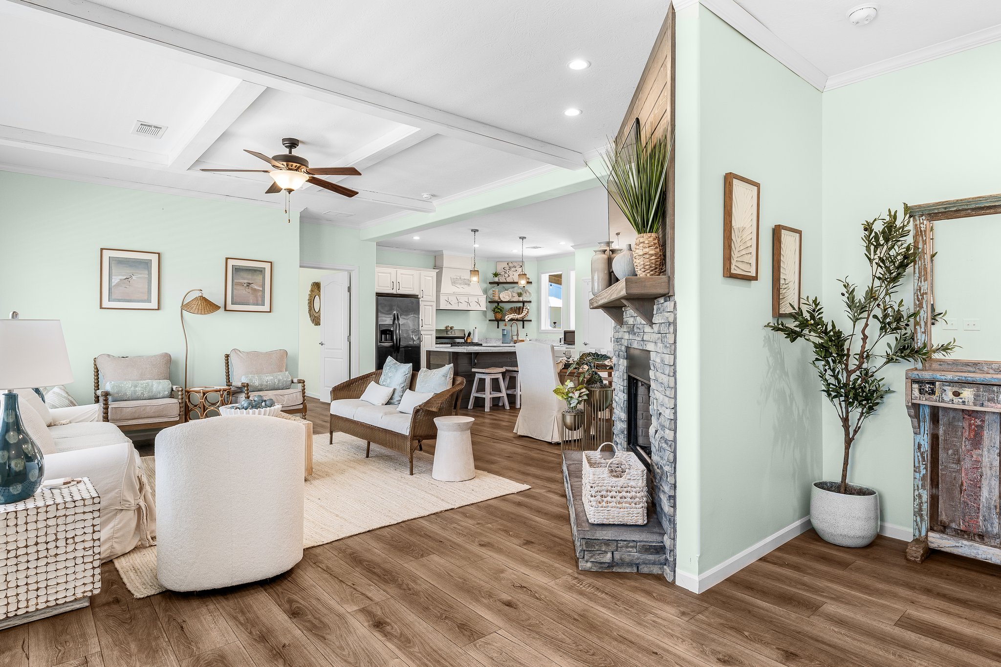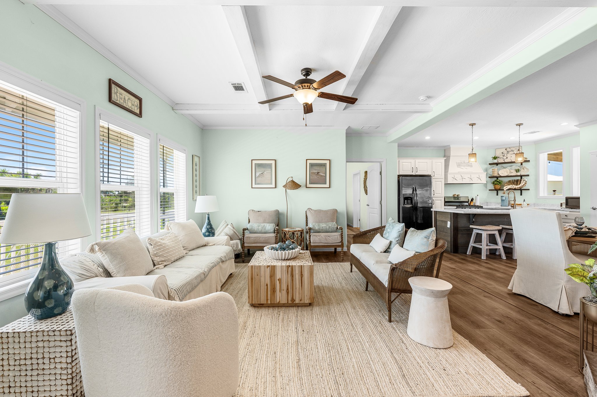 The home features a cozy living space with a gas fireplace, perfect for cooler evenings or relaxing after a sunset stroll on the beach.