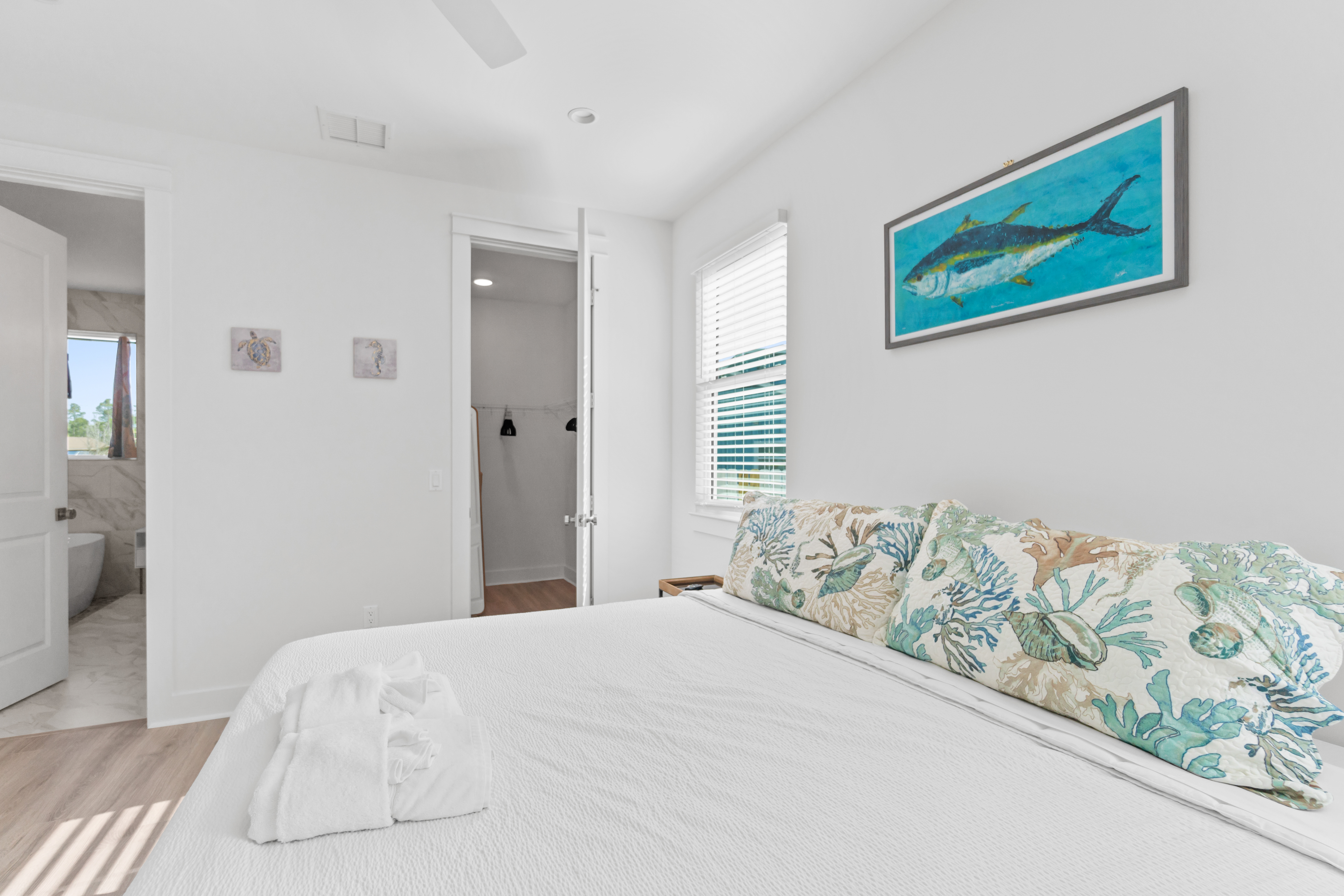 Bedroom 1: King with ensuite bathroom with walk in shower, garden tub, his and her vanity, and private toilet room.