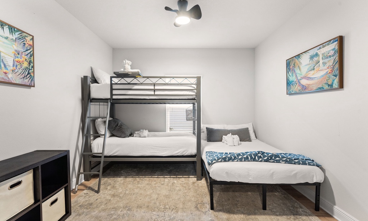 Bunk room with a full bed + twin-over-twin—a favorite for kids and teens