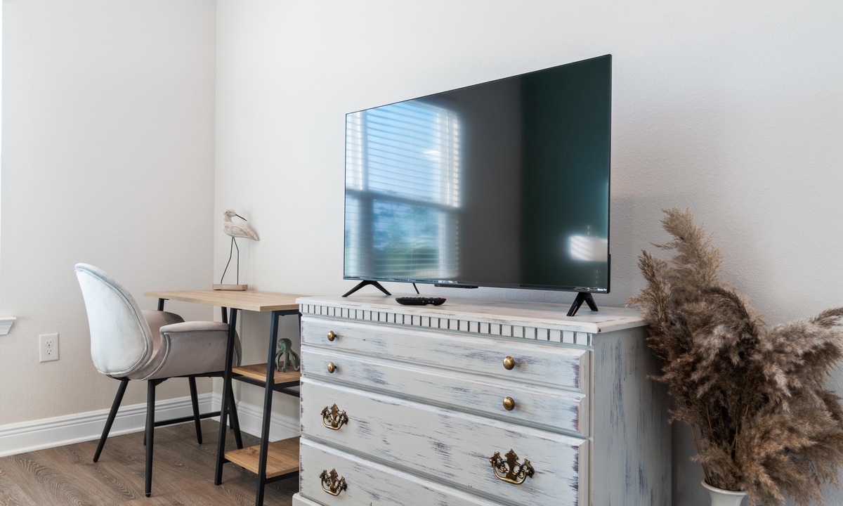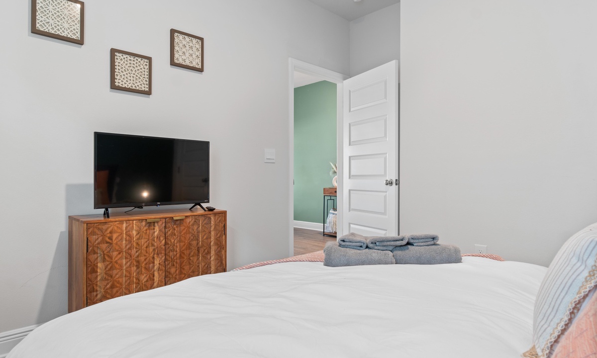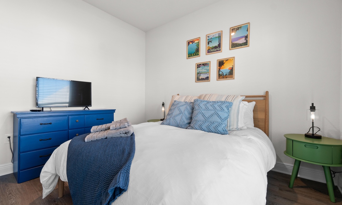 -Bedroom 2: Sleeps 2- Queen bed with smart Roku TV (please log into your own apps and remember to log out upon checkout), closet, and dresser.