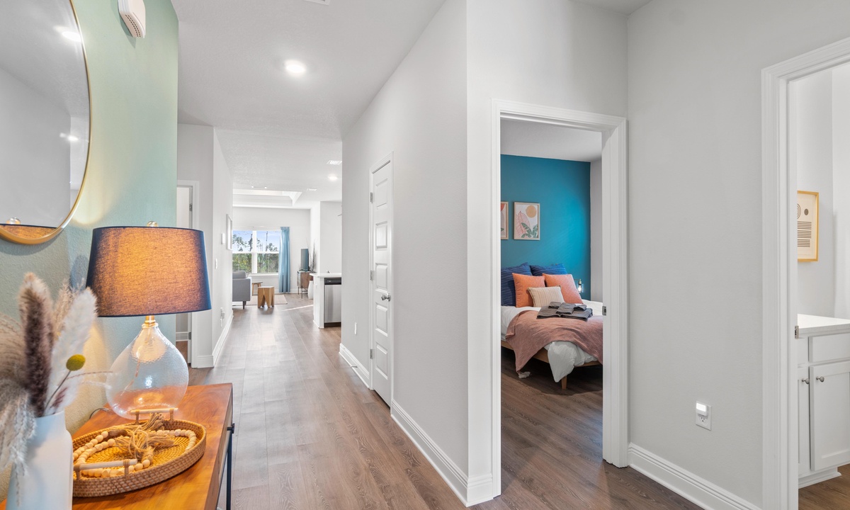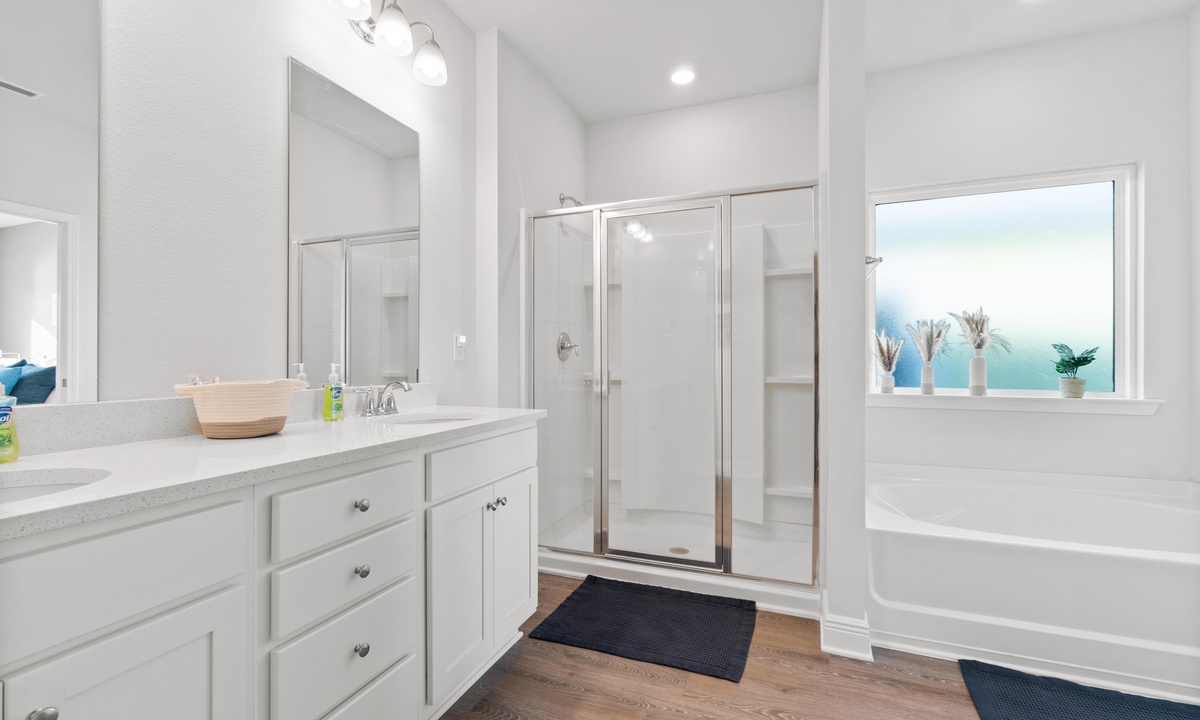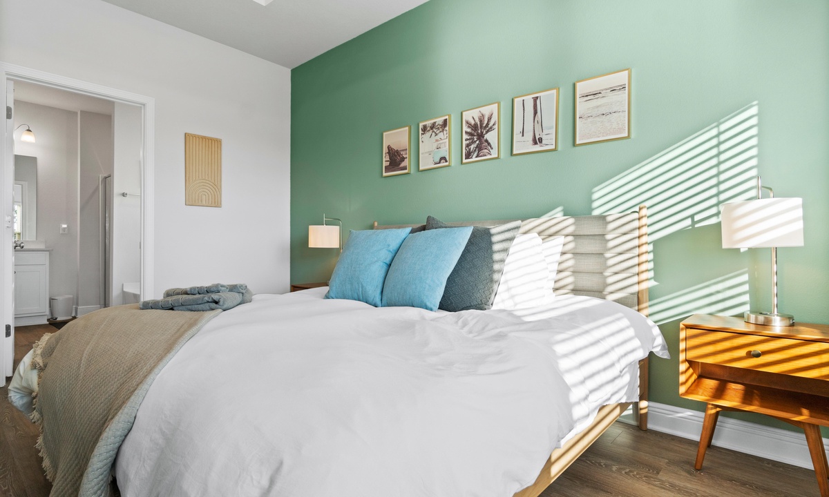 -Bedroom 1: Sleeps 2 -Primary suite with king bed, ceiling fan, wifi smart Roku TV (please log into your own apps and remember to log out upon checkout) walk-in closet, and attached en suite bathroom. The bathroom has a walk-in shower, soaking tub, double vanity, and water closet.
