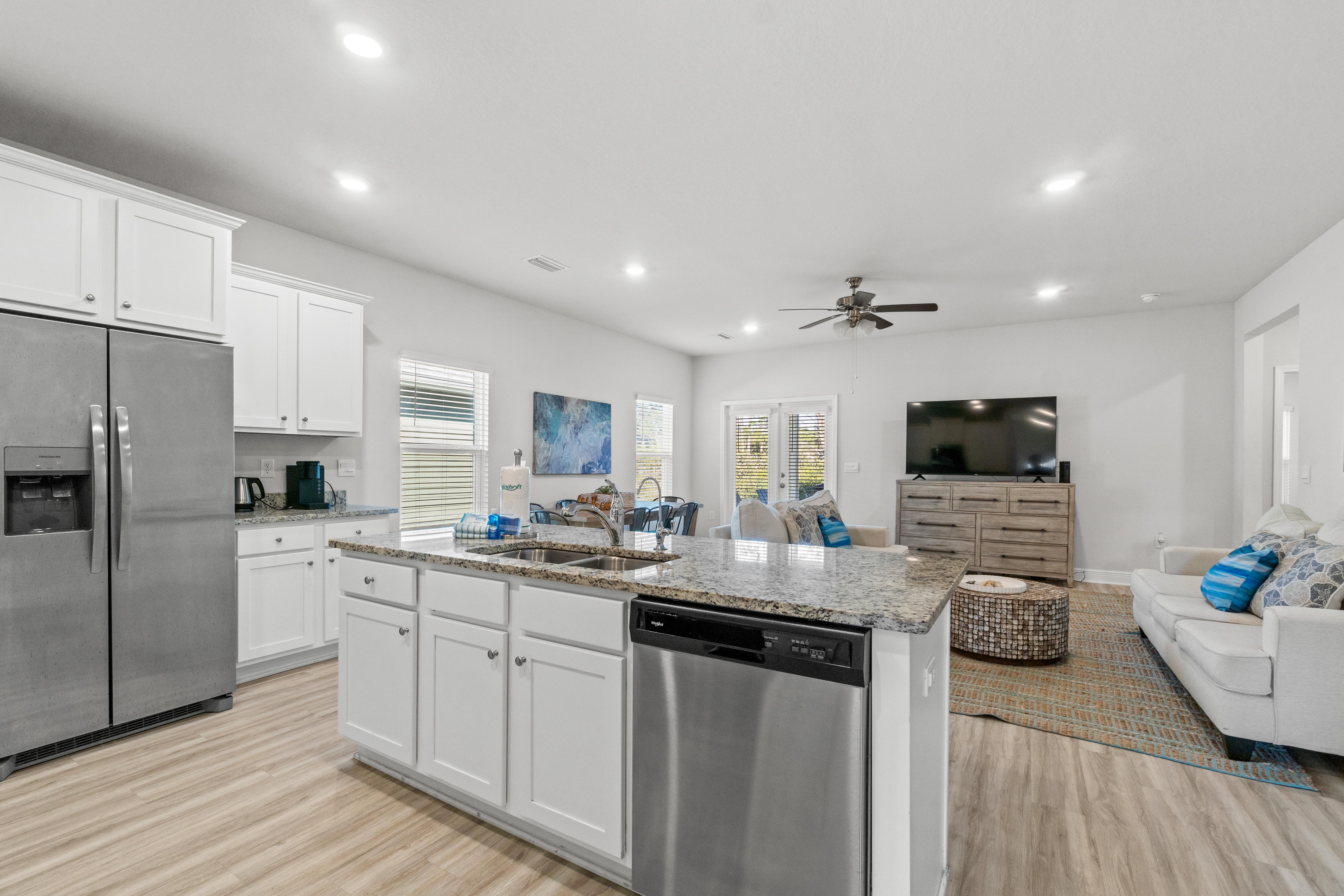 The living space will draw you in with its abundant, natural light, calming touches of sand and sea, and natural fabrics and textures. With space for 14, this stylish home is ideal for families traveling together. This single level home will beckon you with its bright, pristine kitchen stocked with essentials, dining area, breakfast bar, and inviting living room hues. Doors from the living room lead out to a porch with Adirondack chairs where you can kick back and relax.
