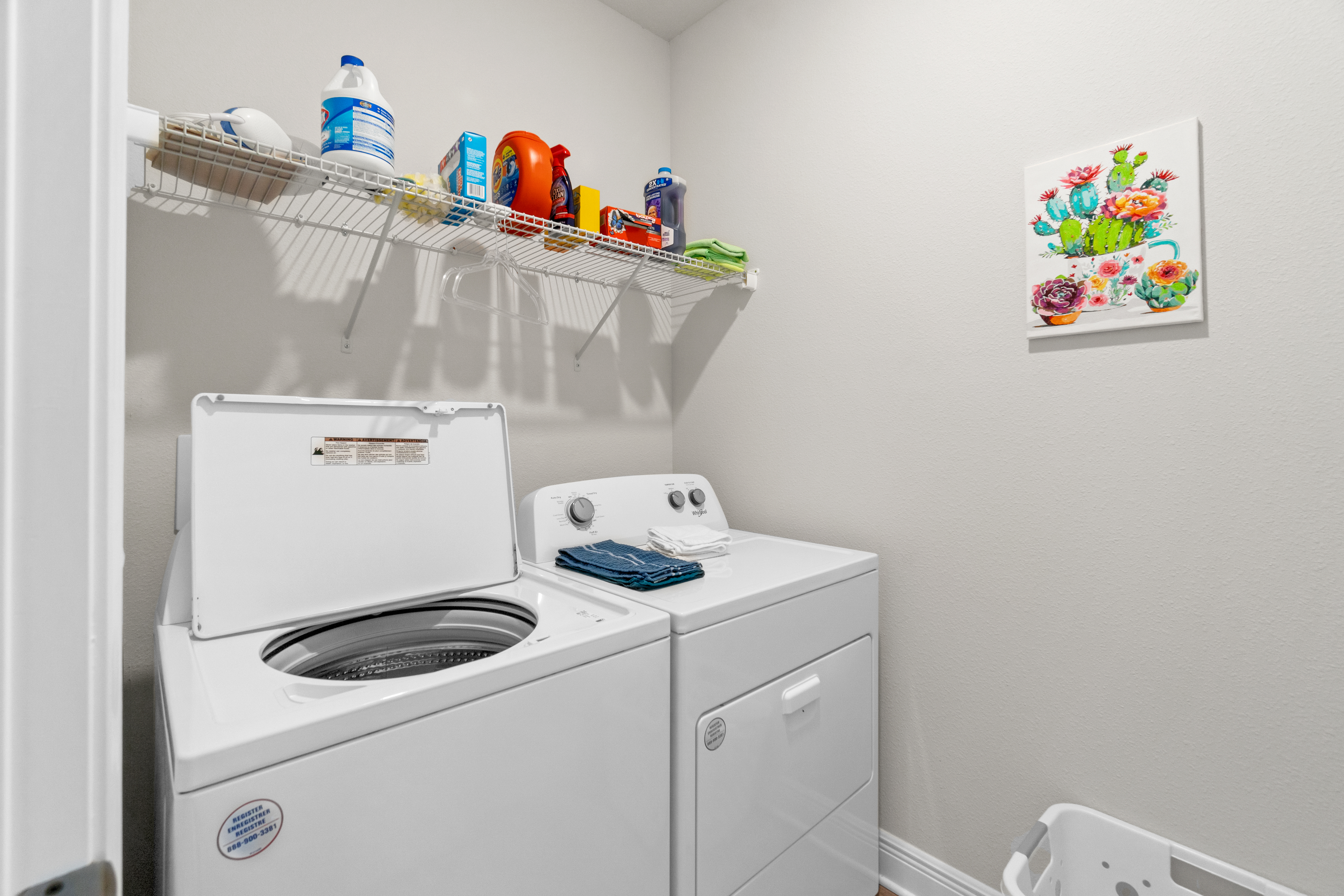 Essentials: Bath towel and washcloth per guest are provided. Starter supply of soap, shampoo, conditioner, toilet paper, paper towels, trash bags, dish soap, laundry soap and dryer sheet.