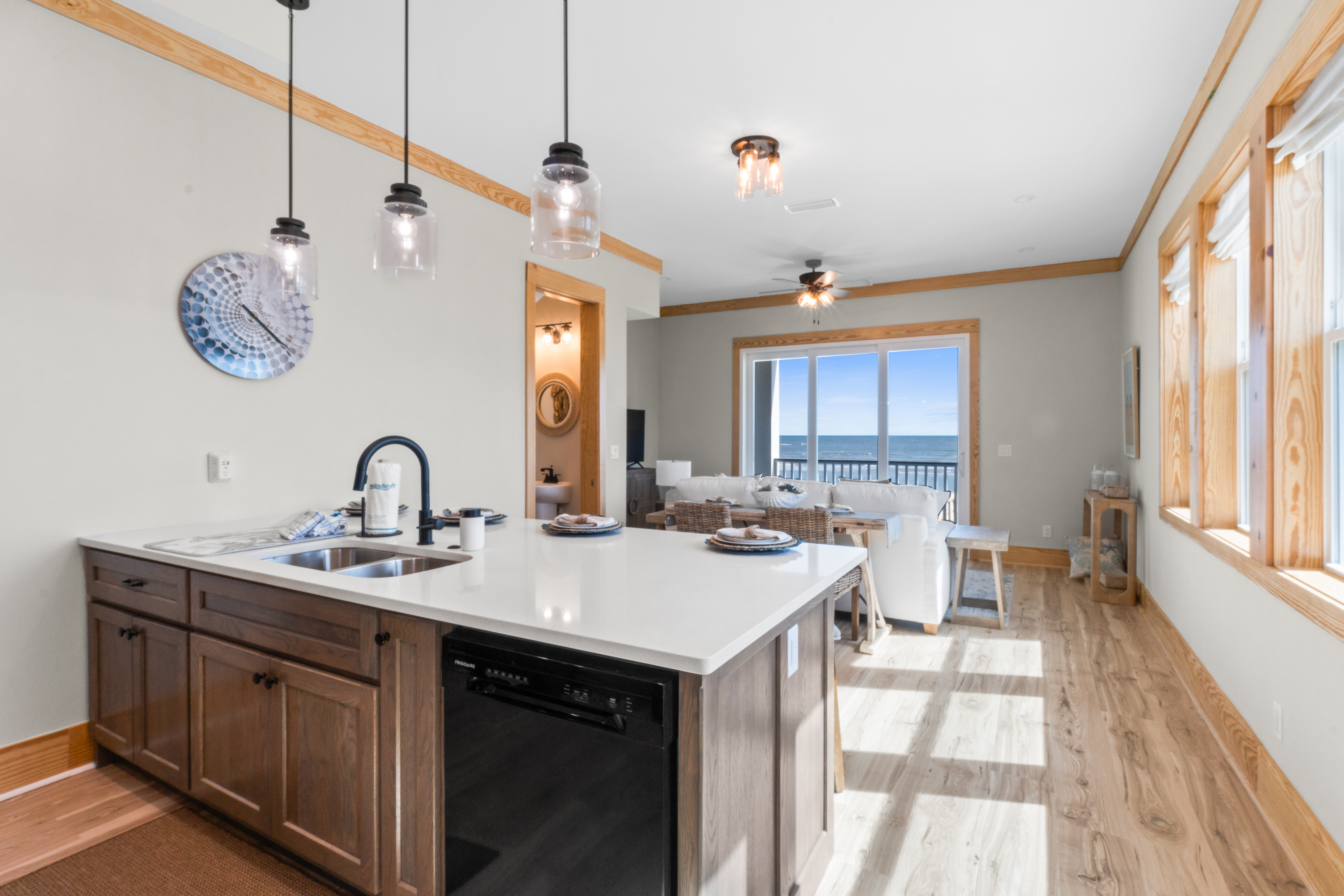 Whether you're whipping up a fresh seafood feast or prepping snacks for a beach day, the kitchen has everything you need — stocked for up to 12 guests, including kid-friendly dishware. Appliances include a 10-cup coffee maker, blender, toaster, and thoughtful safety features on every level like fire extinguishers and fire safety blankets.