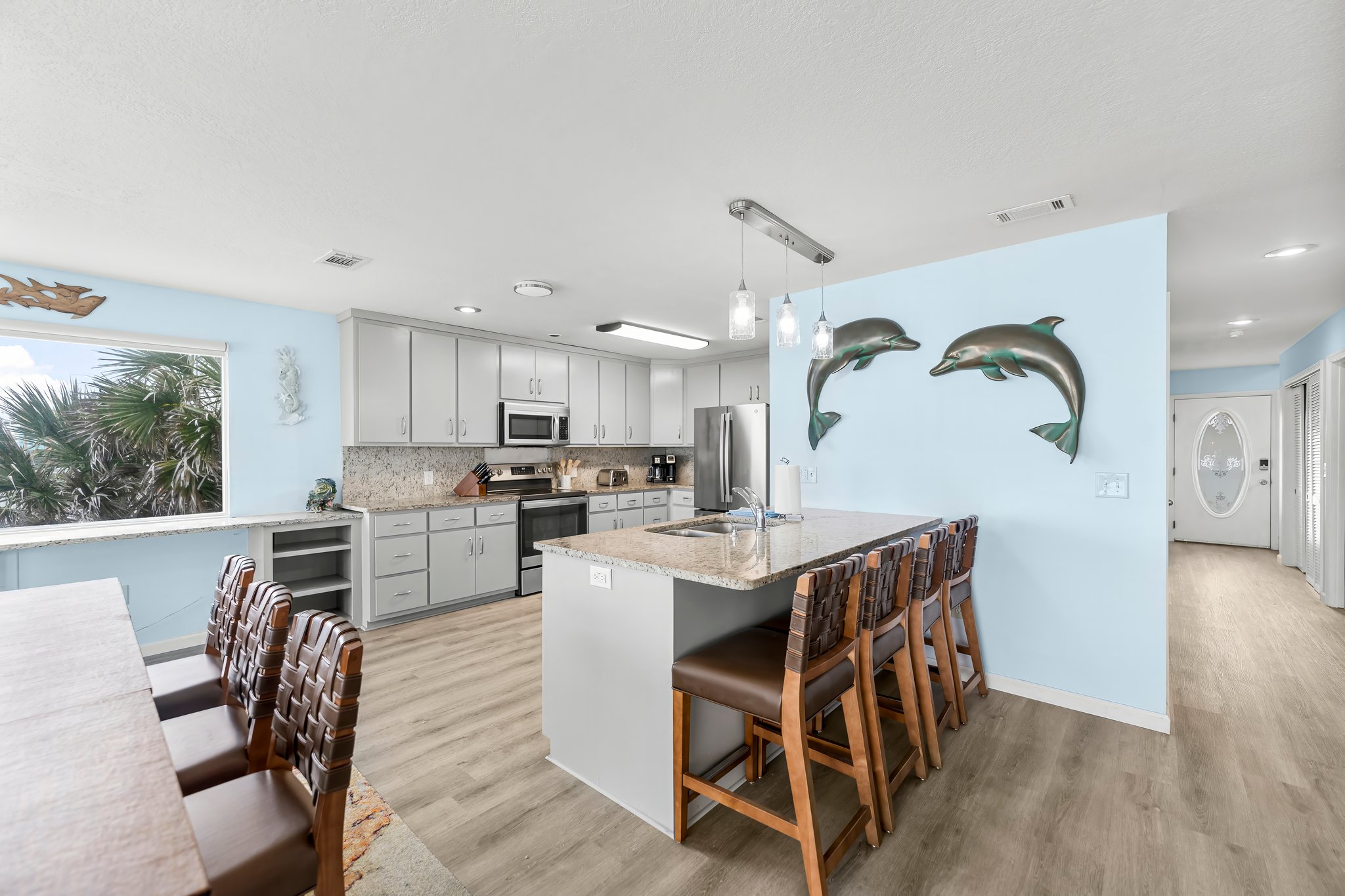 On the second floor, the open-plan living area is perfect for group gatherings, with a dining table that seats 8, additional seating at the peninsula counter and bar, and a fully equipped kitchen with granite countertops and stainless steel appliances. The living room includes a large-screen TV and a Queen sleeper sofa. There's also a king bedroom with Bay views and an en suite bath; a bunk room with a Twin over Full bed and Twin trundle, and a full bath with a shower.