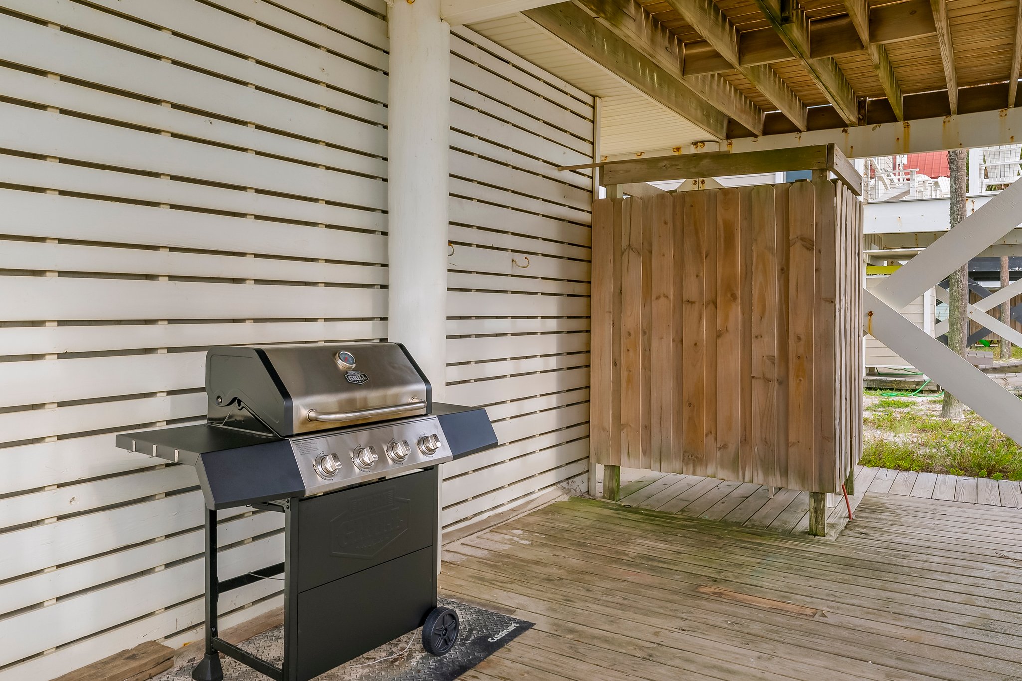 - Gas grill and deck table provided for outdoor meals.