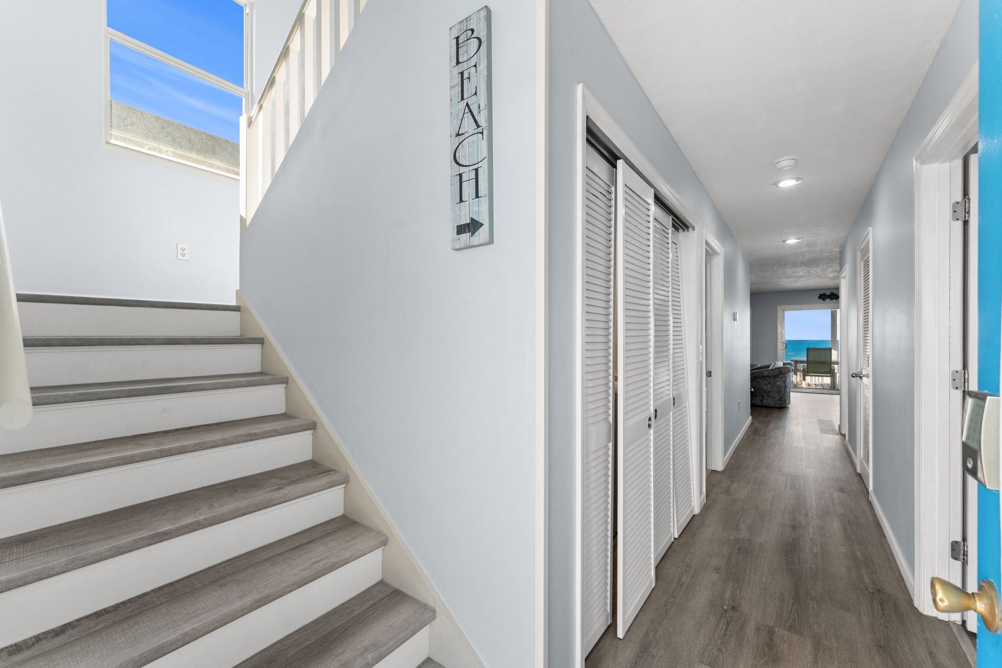 The first level of the home features convenient parking for 4-6 cars, an enclosed outdoor shower with a foot and pet wash station, and a Gas Grill. Stairs lead you to the main entrance, where you'll find easy access to the private beach boardwalk.