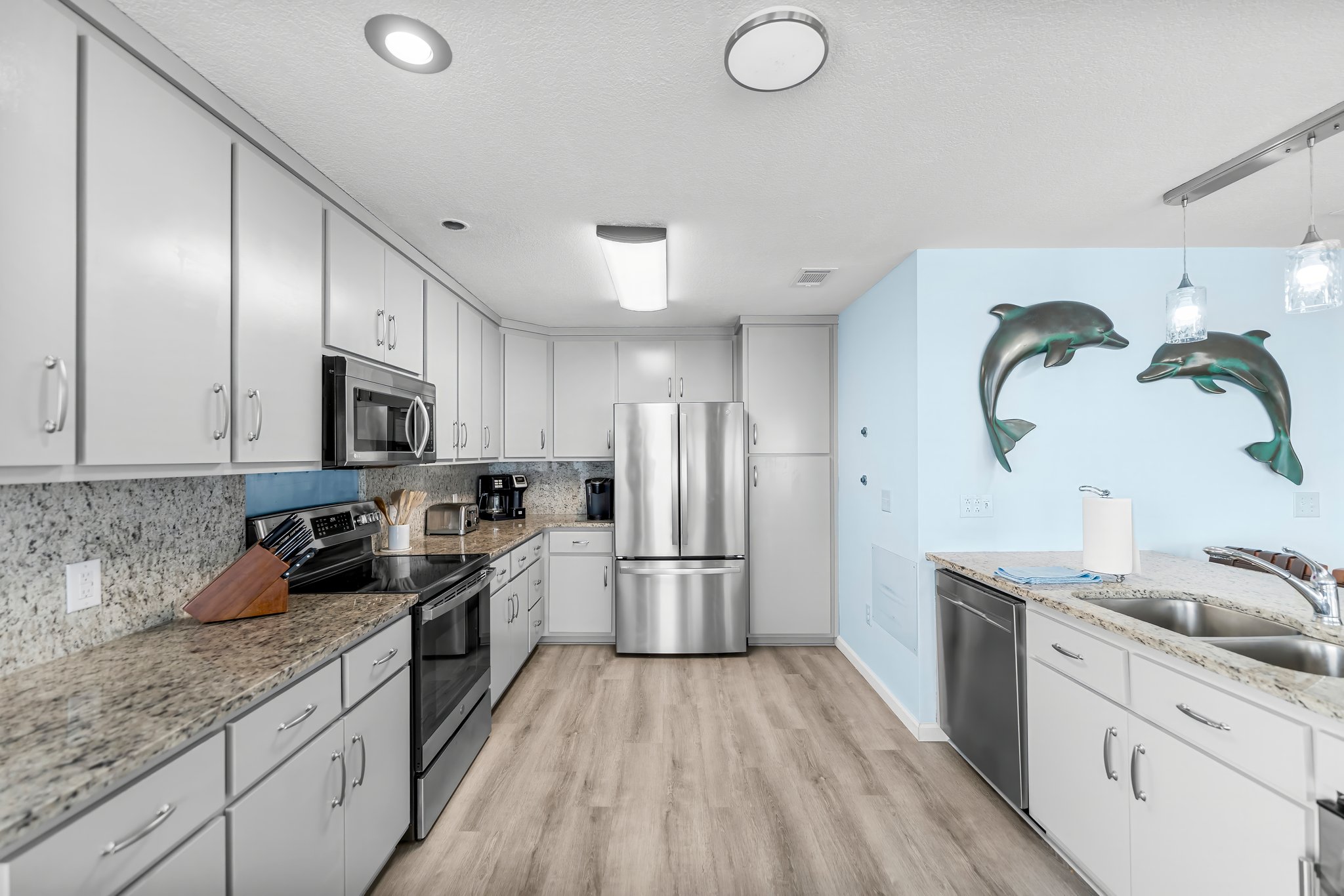 - Fully equipped kitchen with granite countertops and stainless steel appliances.