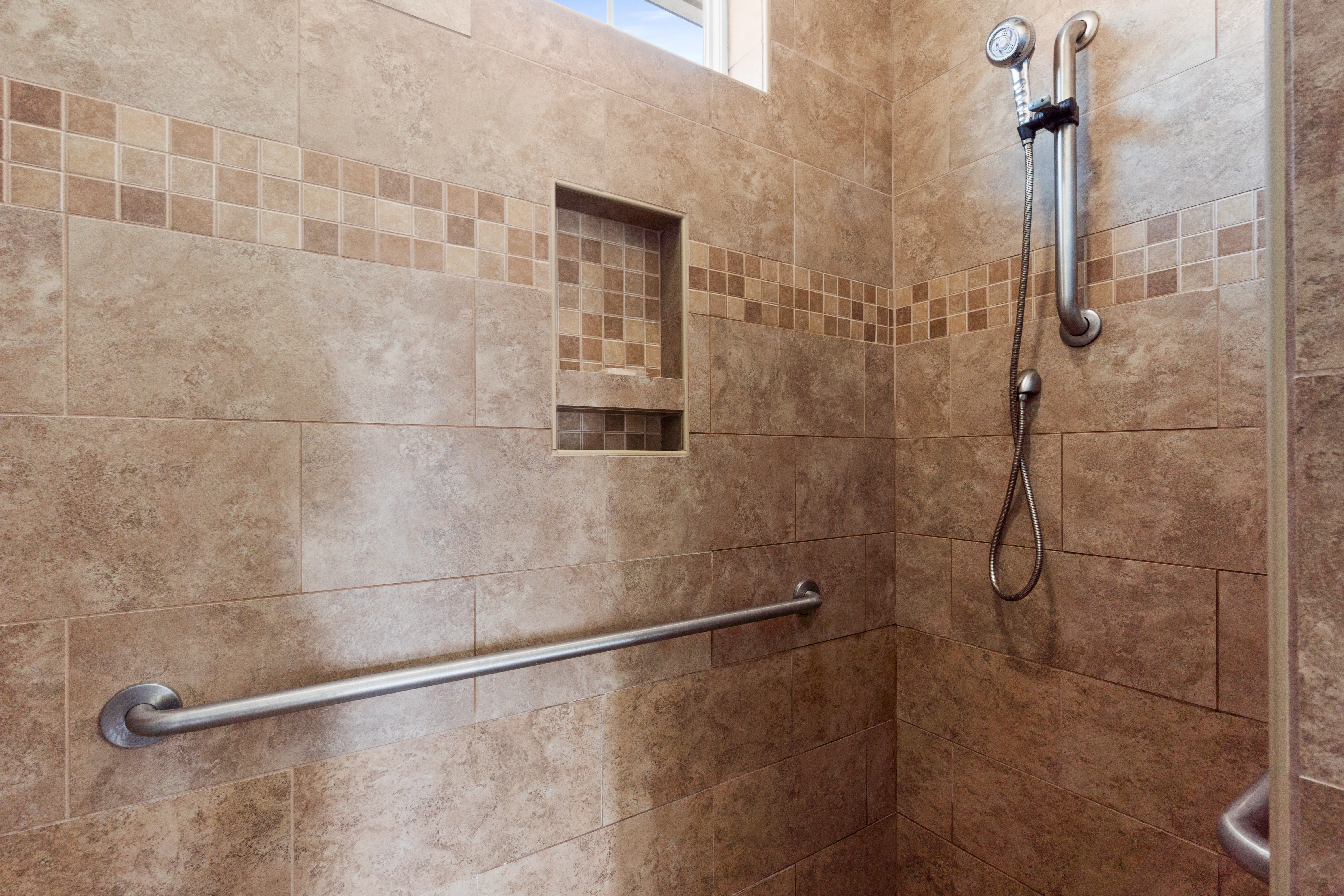 Wheelchair Accessible Shower-Roll-in / Curbless Entry offering no threshold or a very low (=½ inch) one to allow easy wheelchair entry. Shower has grab bars and handheld shower head.