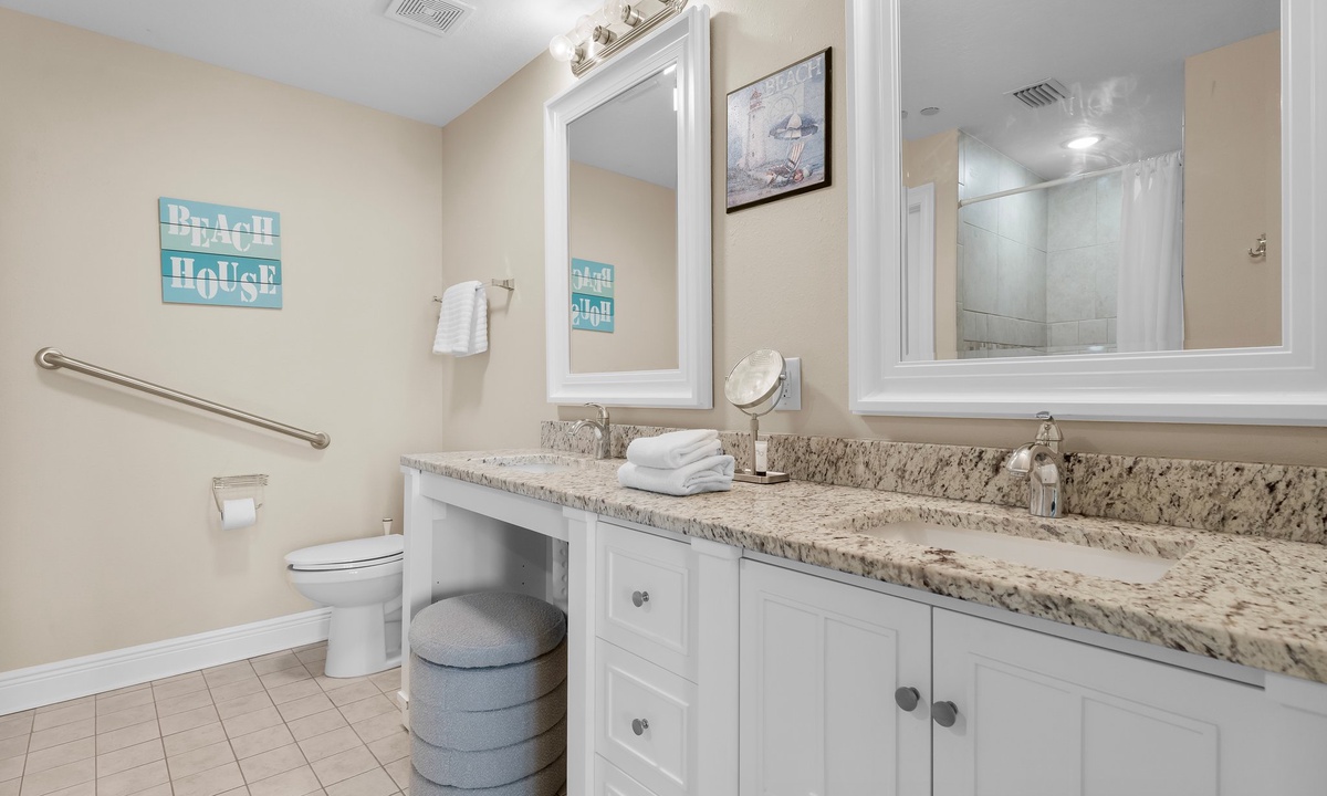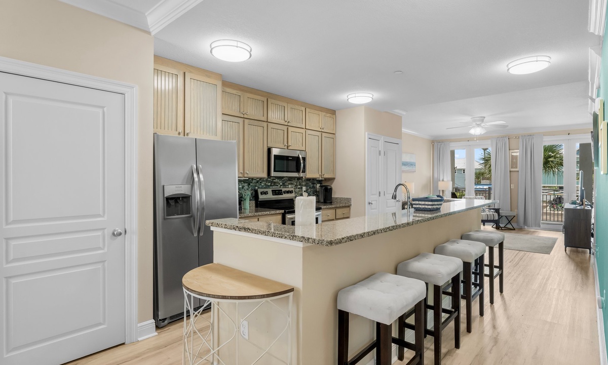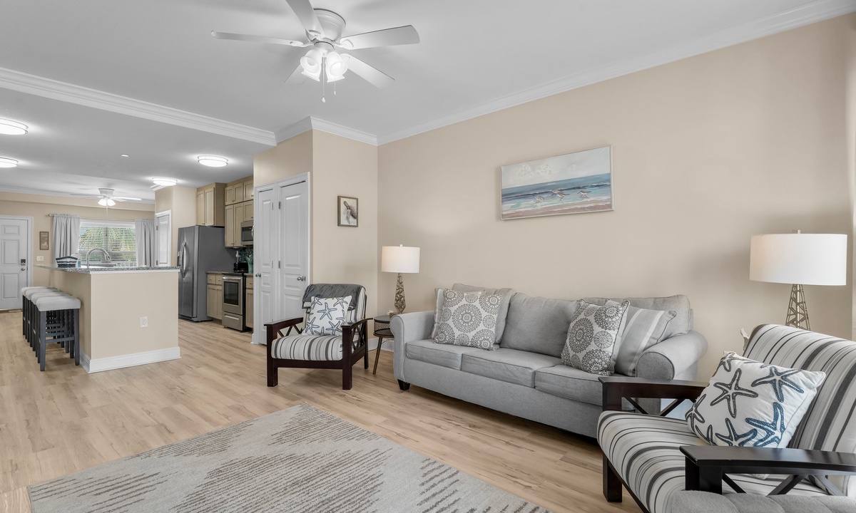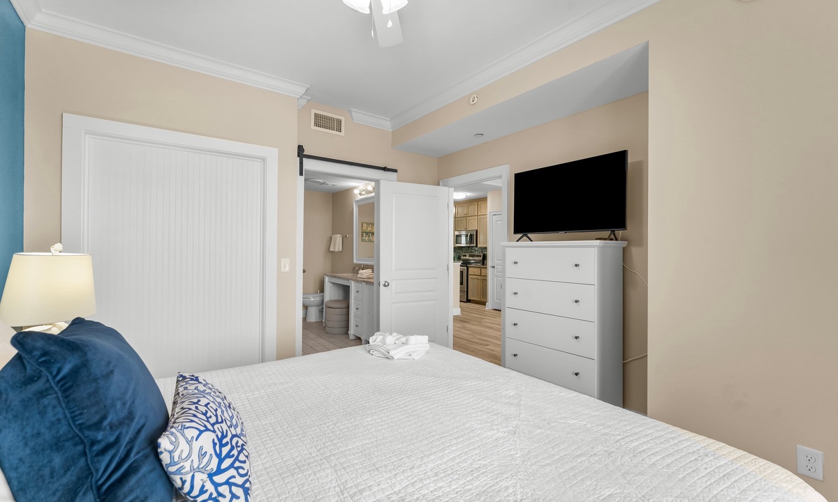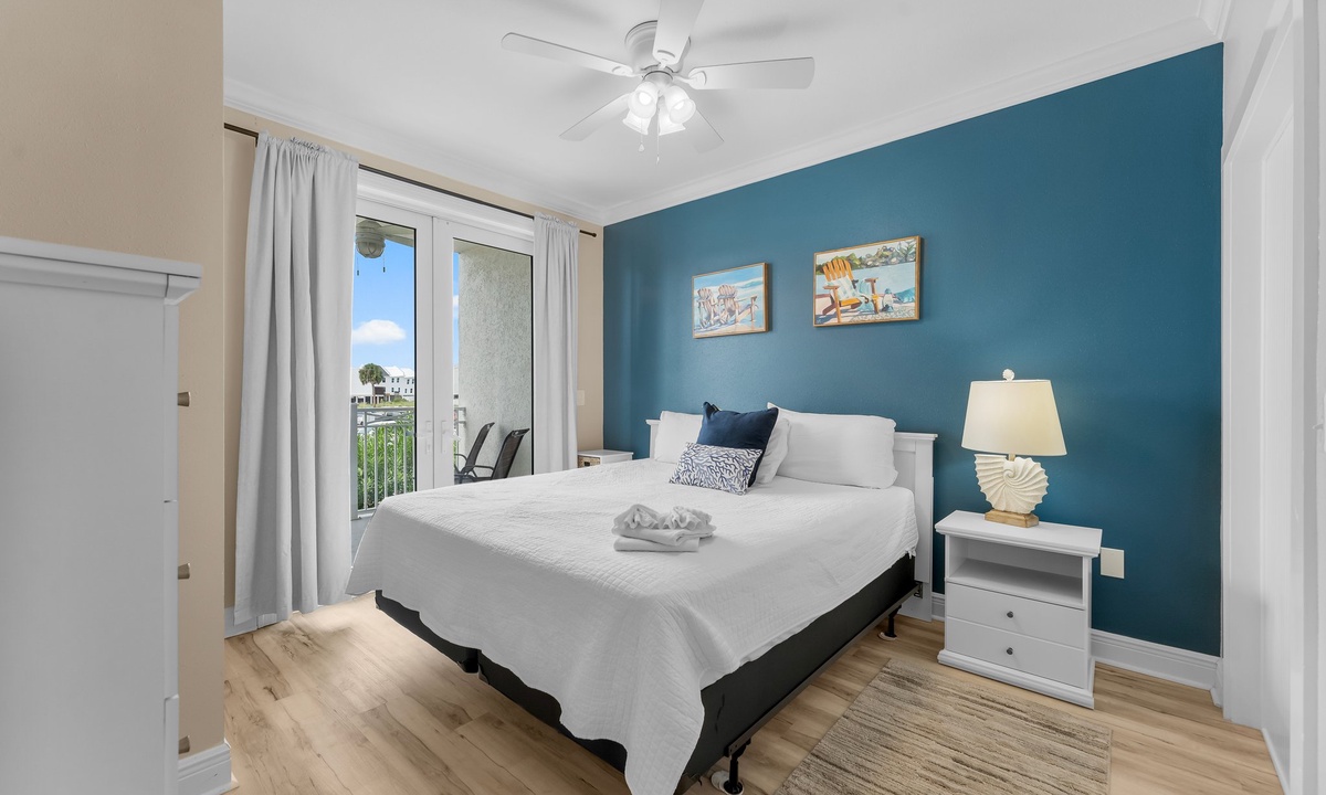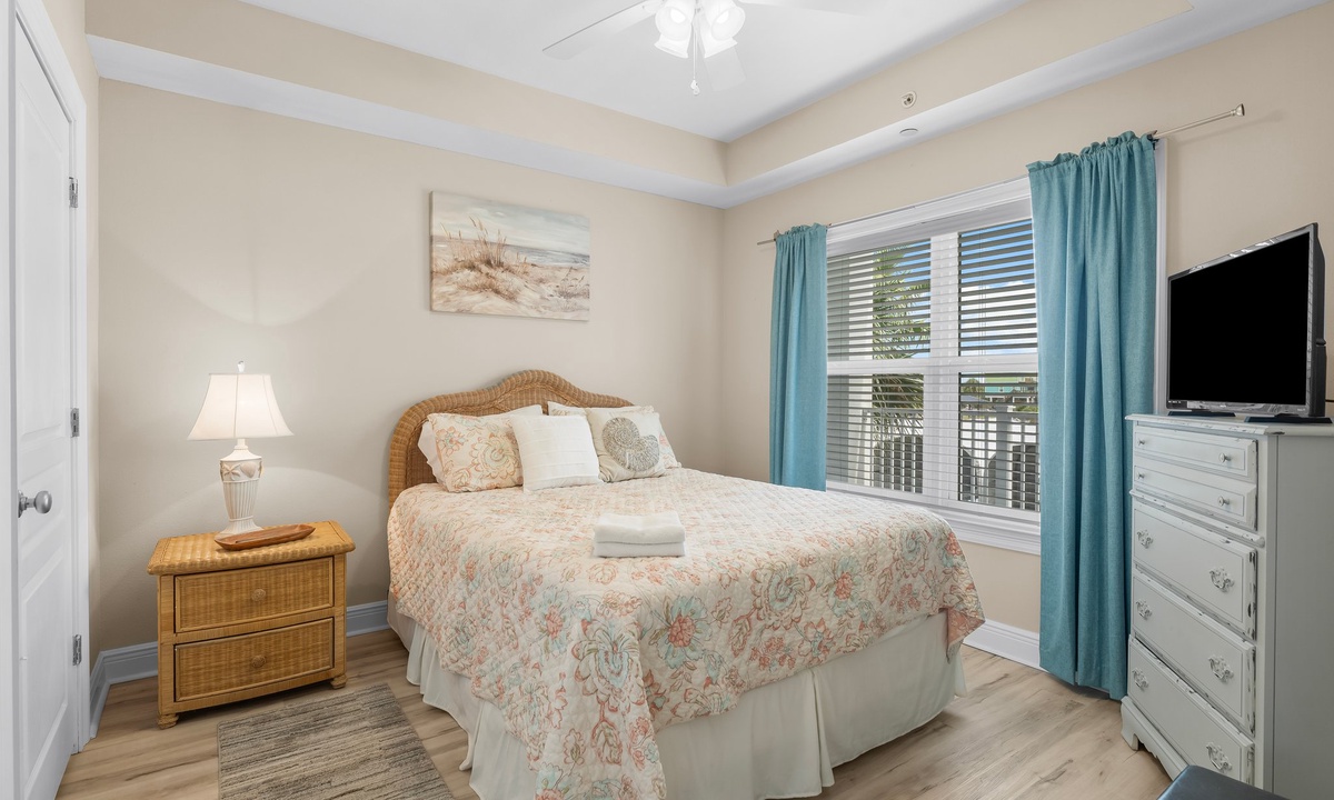 The two bedrooms exude tranquility, with the master bedroom featuring a king-size bed, ensuite bathroom, and a private balcony overlooking the Gulf. The second bedroom offers a cozy queen-size bed and convenient access to the second bathroom.