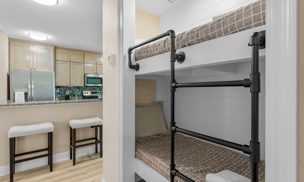 Discover the epitome of coastal living in this 2-bedroom, plus bunks, condo in Mexico Beach, Florida. This sunlit retreat, with its open-concept living space and panoramic windows, offers stunning views of the Gulf of Mexico just steps away. The living room provides a comfortable haven for relaxation, while the well-equipped kitchen boasts modern amenities for easy meal preparation. The beach is only two-minutes from this condo and includes access to the shared pool and hot tub (pictured).