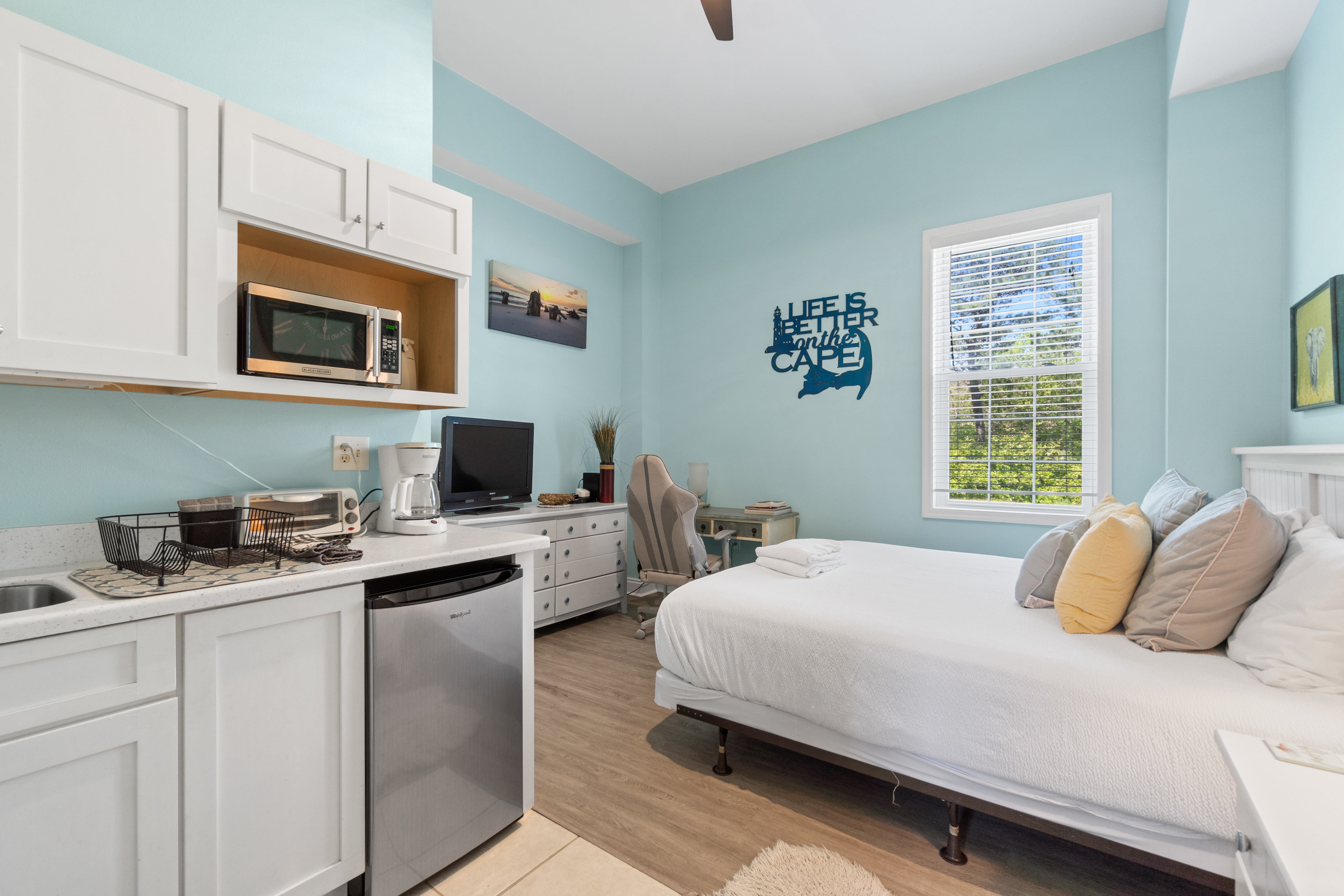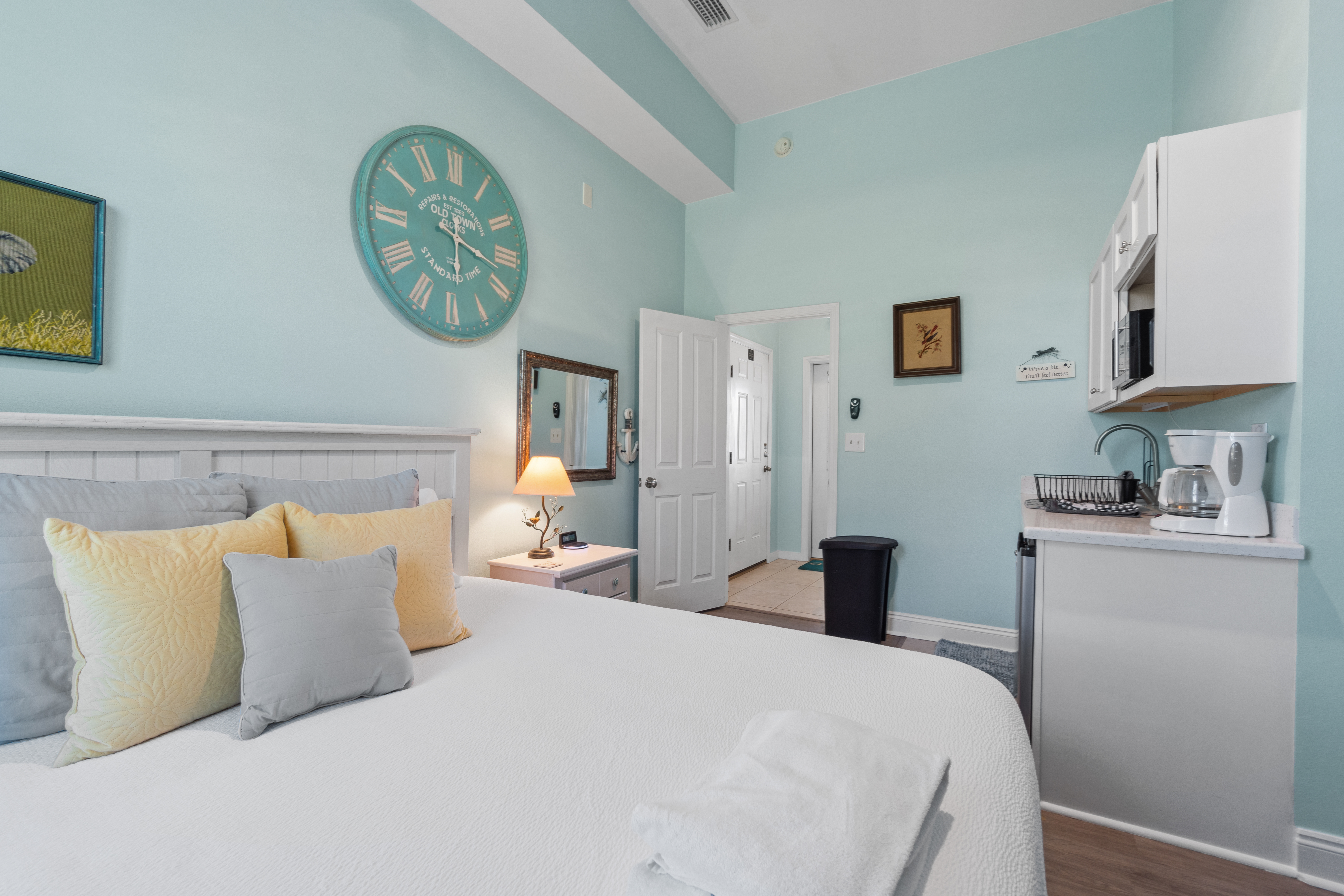 King Suite: This private bedroom is a tranquil retreat, located separate from the main house. It features a king-size bed, a kitchenette for convenience, a desk with a chair for work or creativity, and a full bath with a spacious shower. The room opens directly to the private pool area, providing easy access to both relaxation and fun.