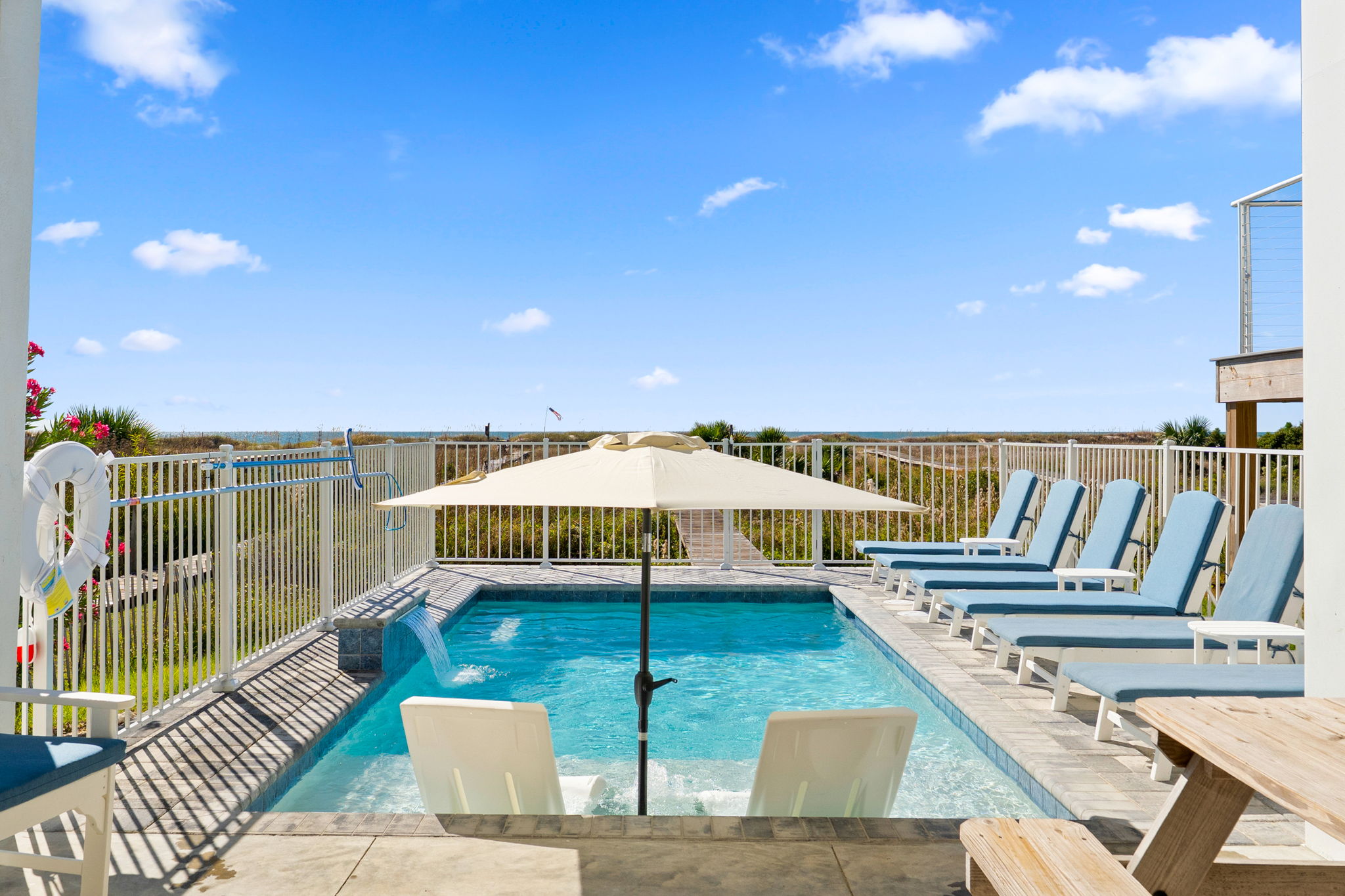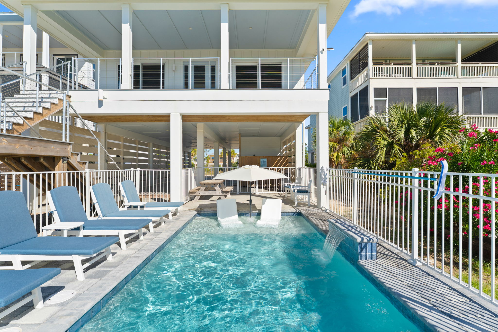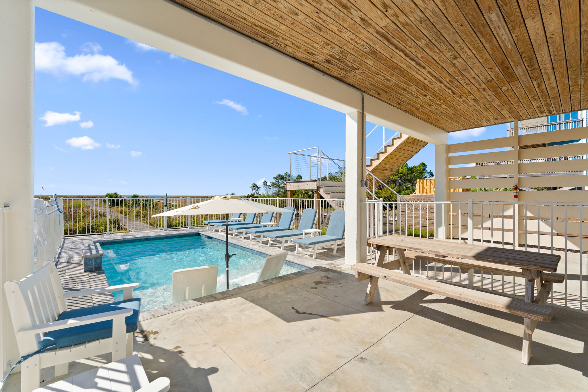 Outside, lounge by the private pool, unwind on the covered balcony with loungers, or enjoy a cookout with the grill and picnic table. After a day at the beach, rinse off in the full outdoor bath before settling in for a sunset on the balcony. With parking for up to 6 cars, everything you need for a carefree stay is right here.