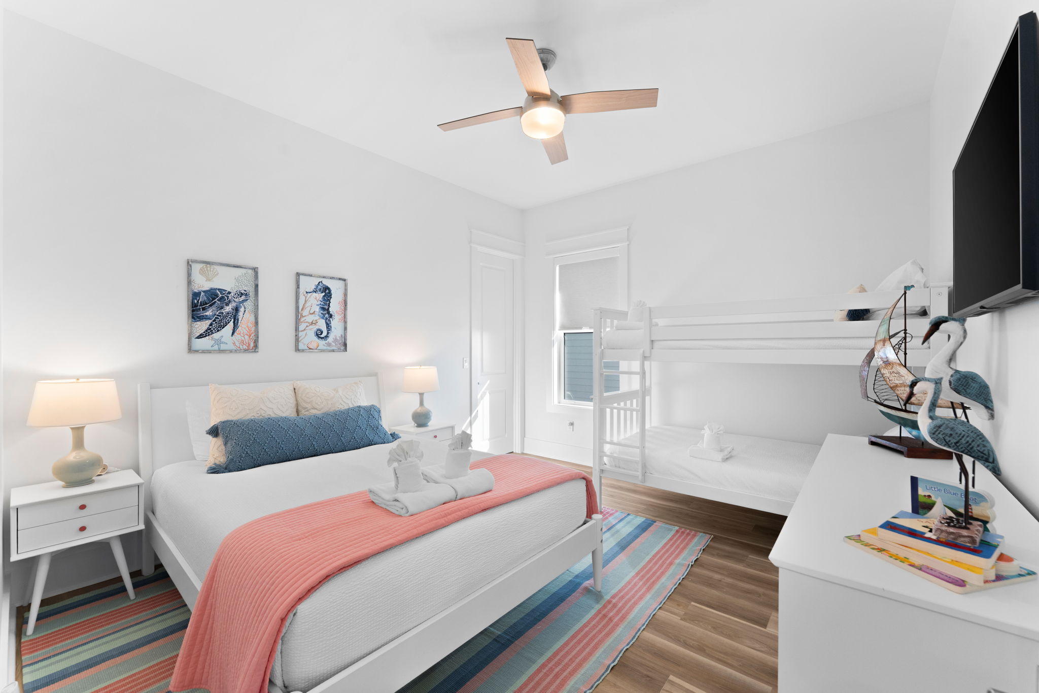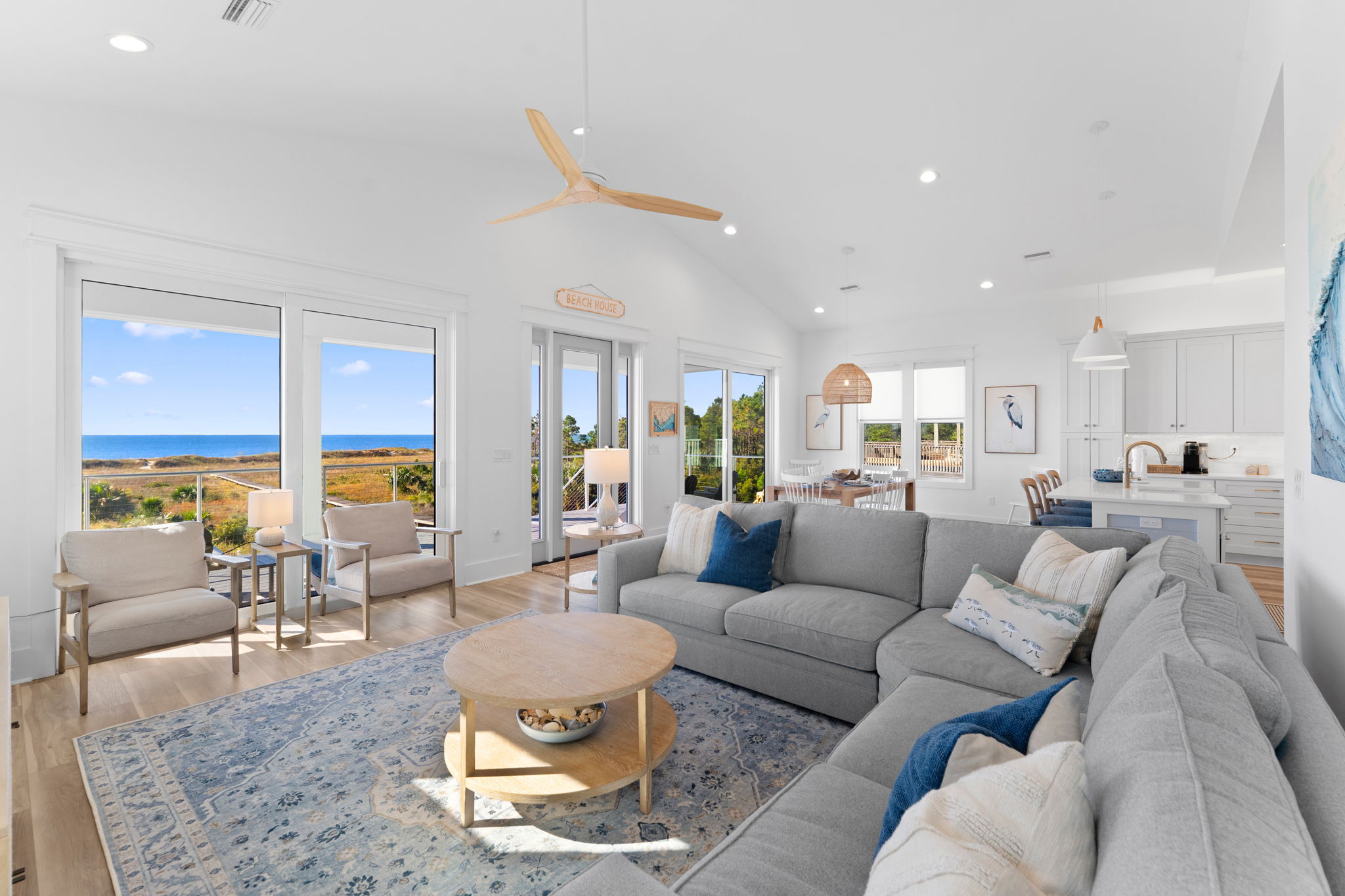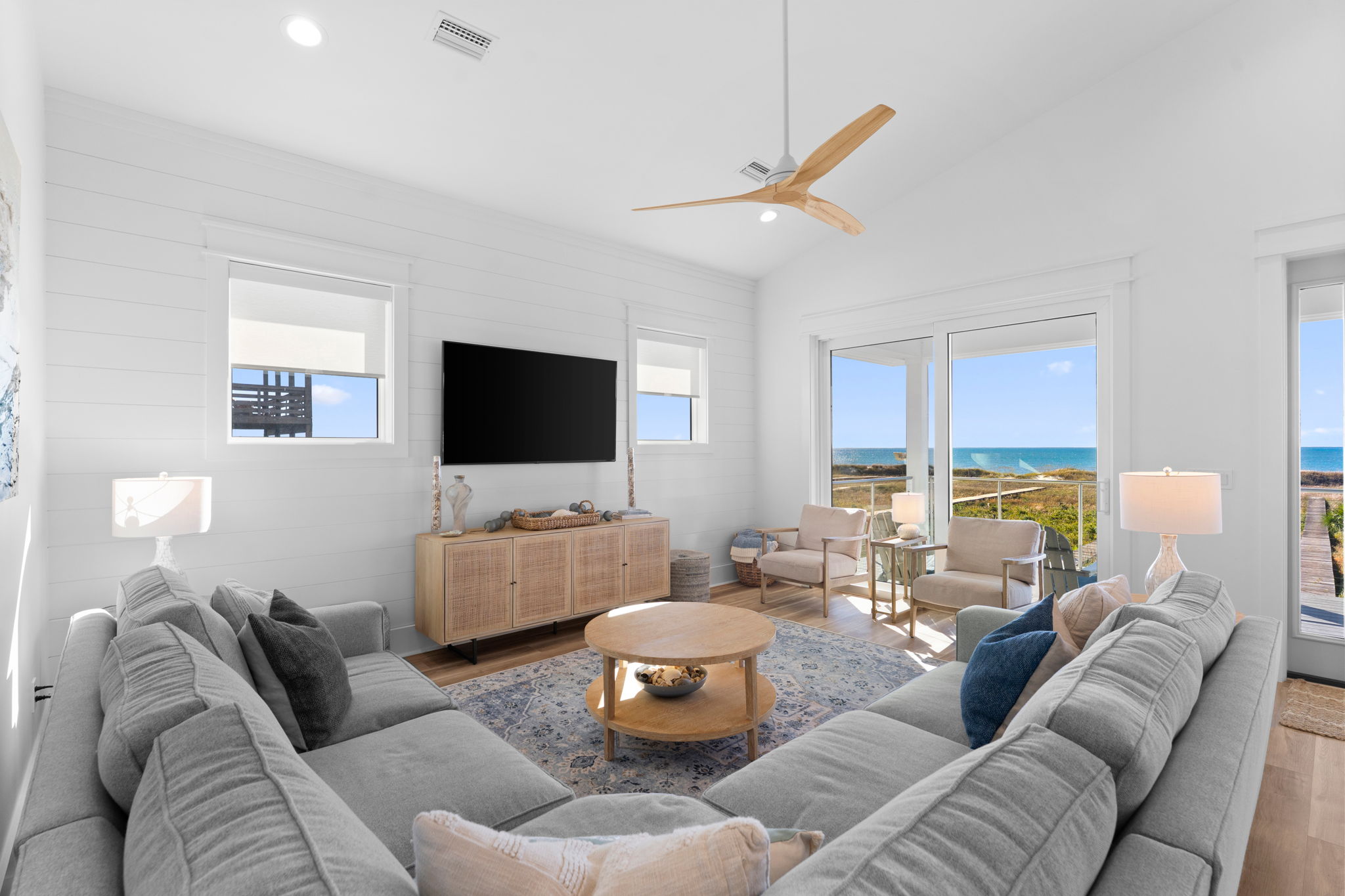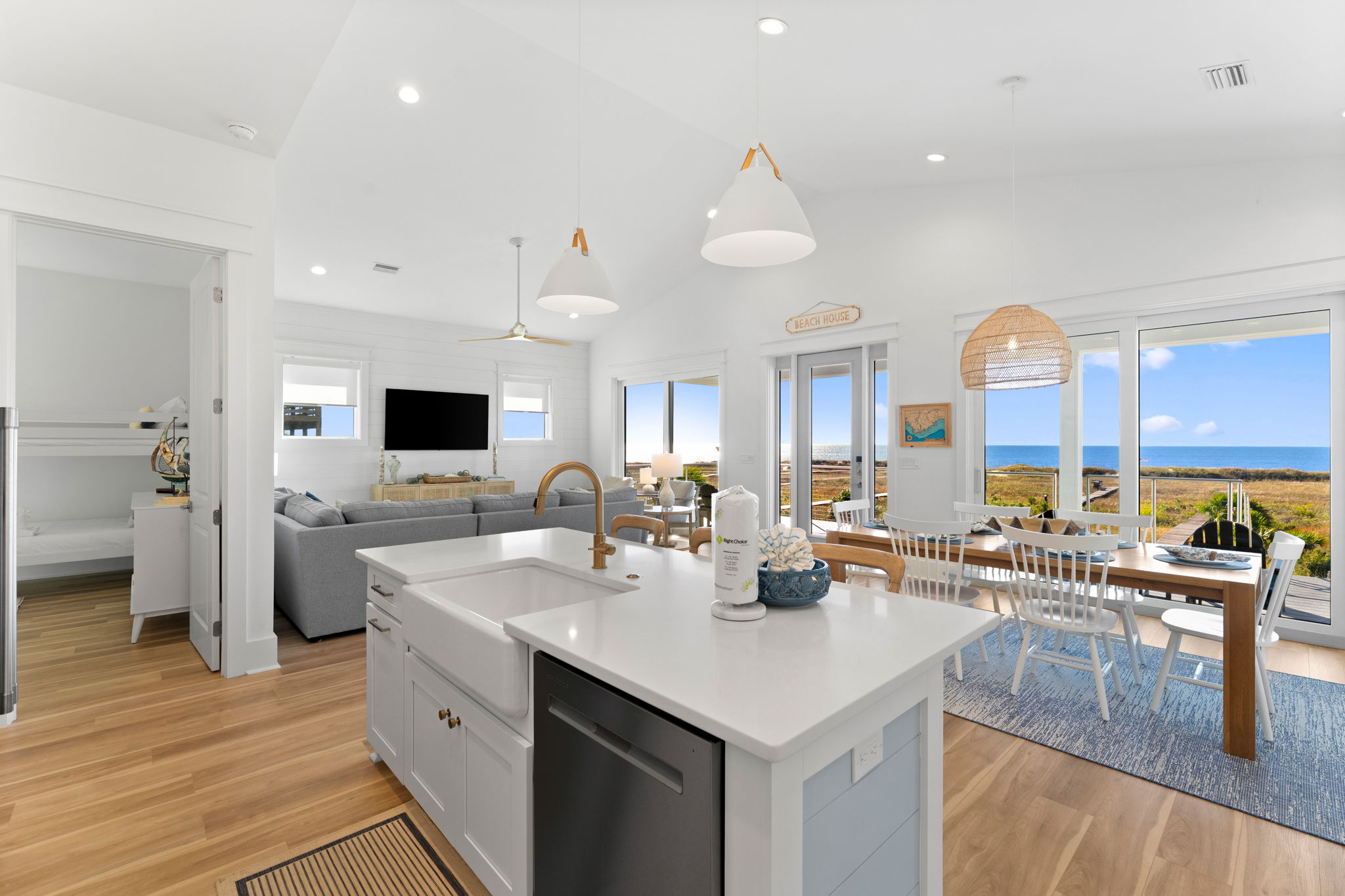 Step inside to an open living and kitchen area with large French windows overlooking the Gulf, filling the home with natural light and coastal charm. Each bedroom includes its own TV, ensuring everyone can relax in comfort.