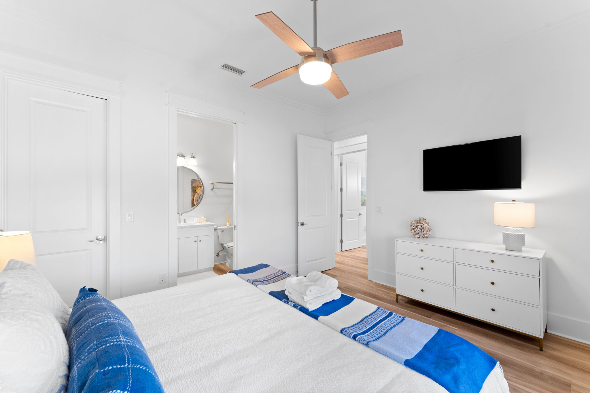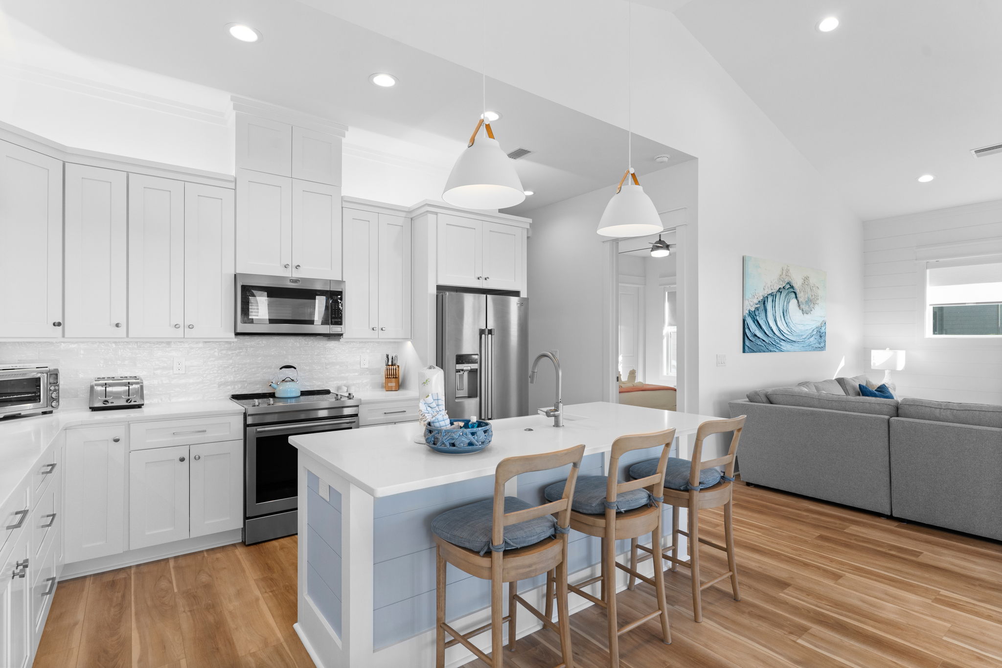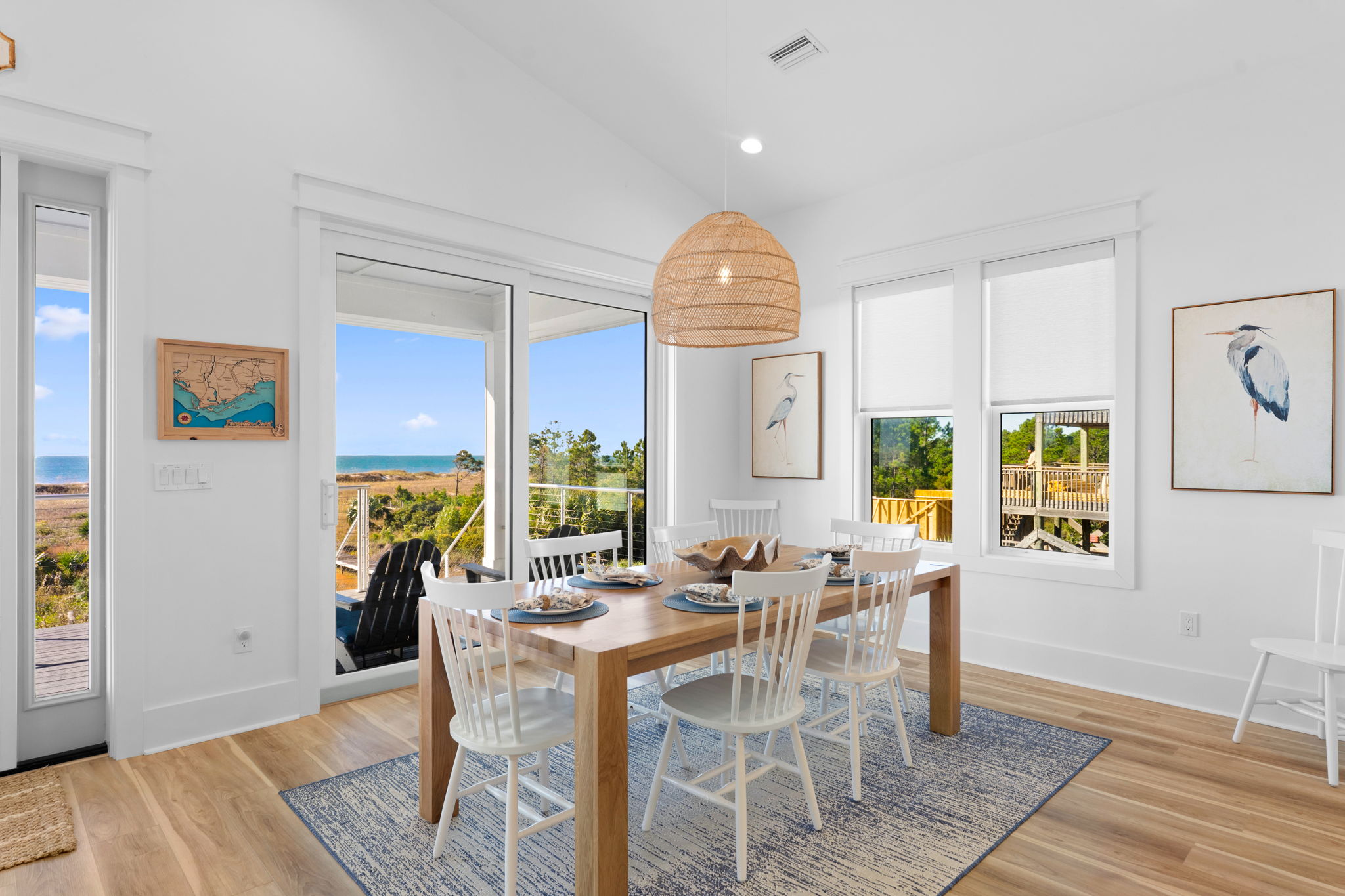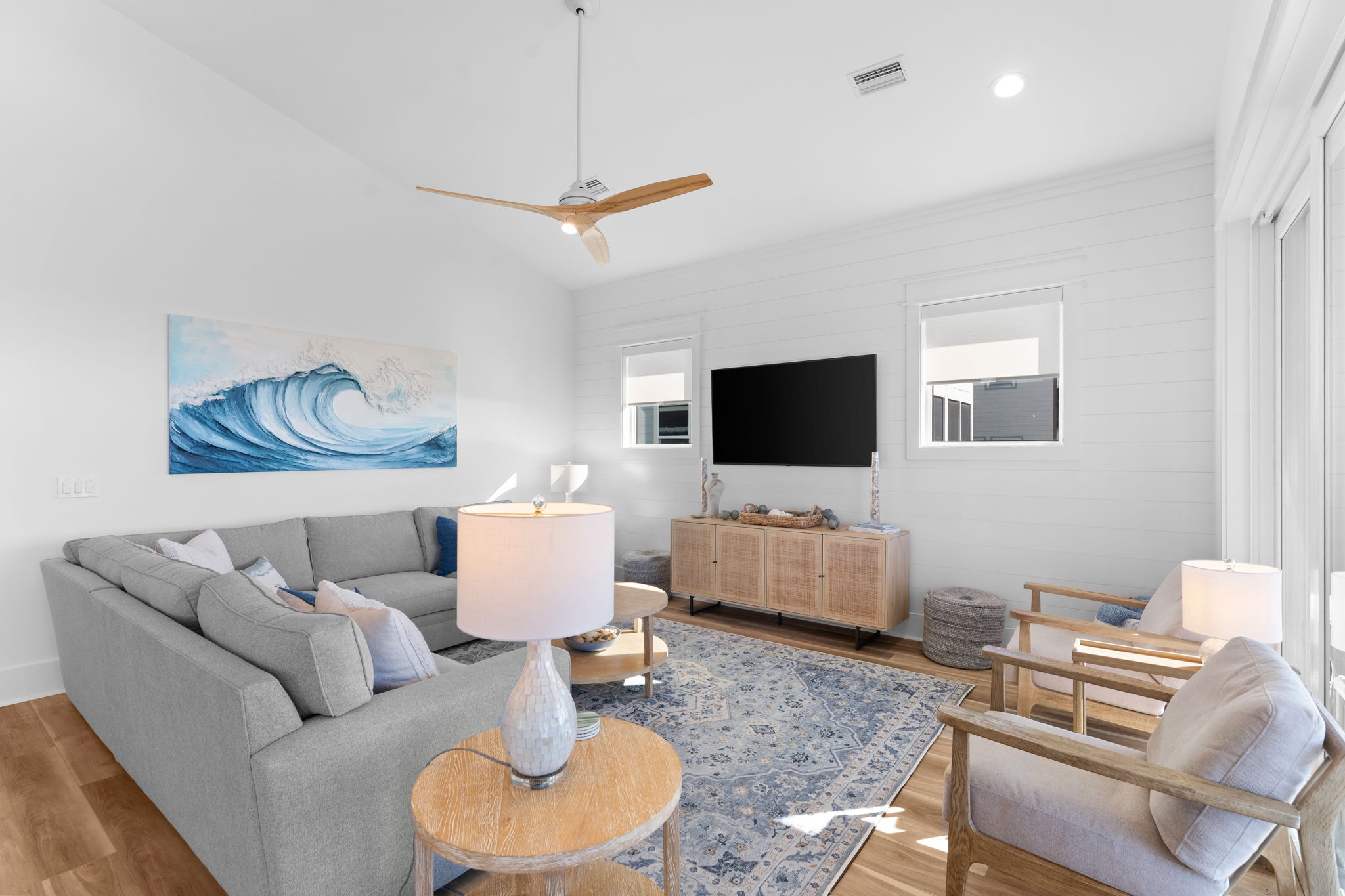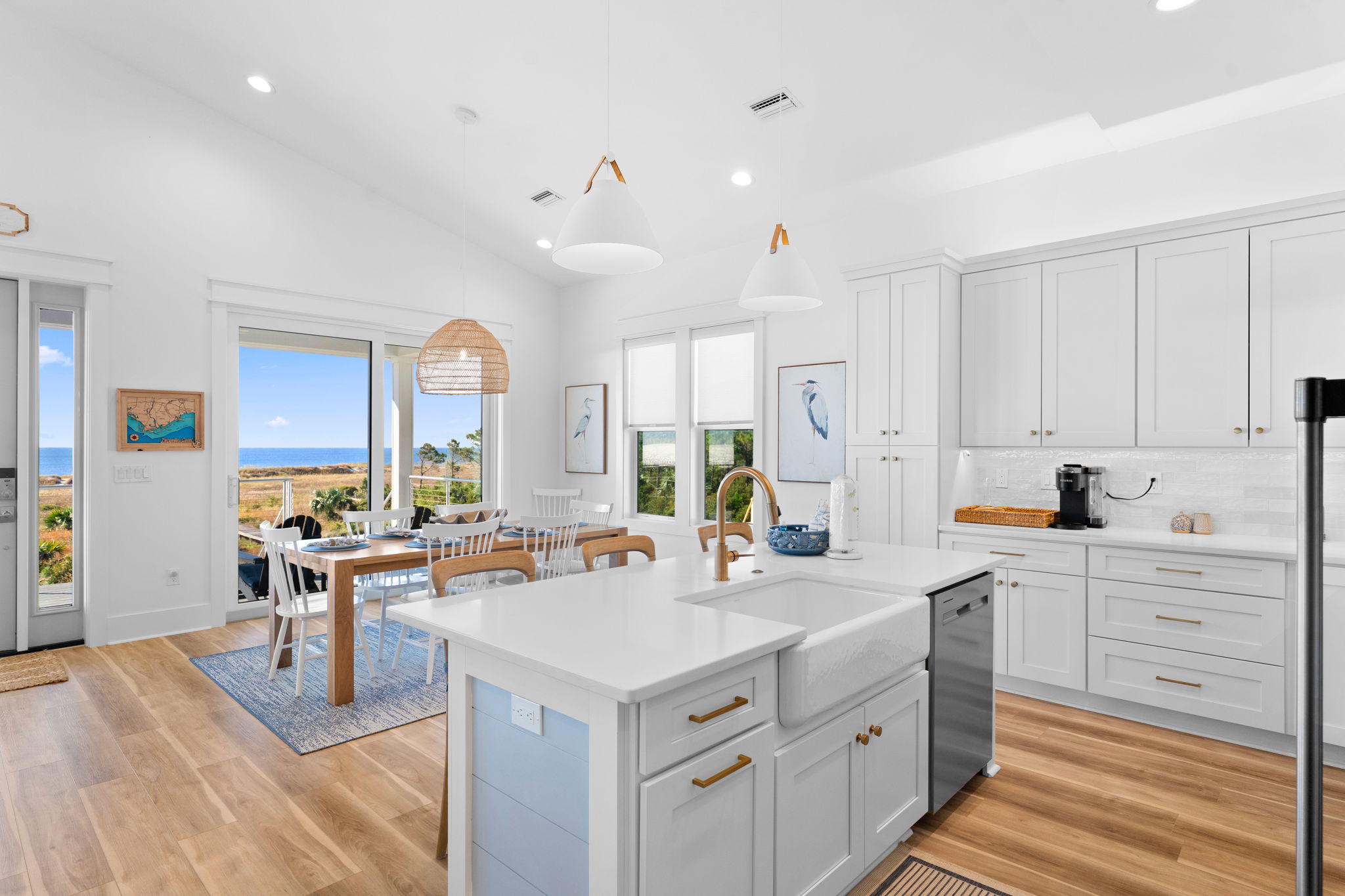 Step inside to an open living and kitchen area with large French windows overlooking the Gulf, filling the home with natural light and coastal charm. Each bedroom includes its own TV, ensuring everyone can relax in comfort.