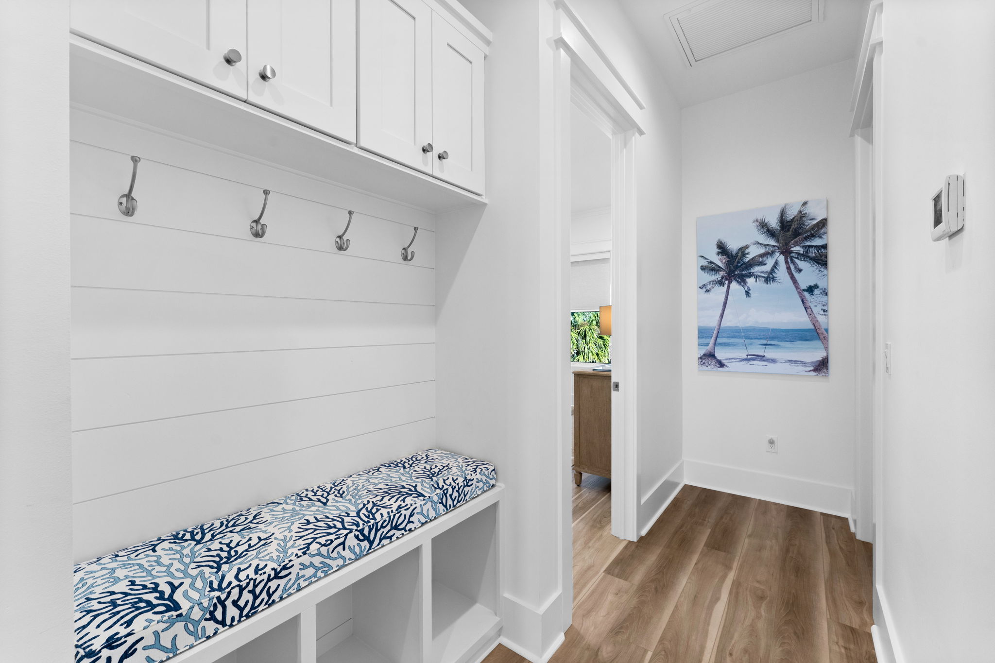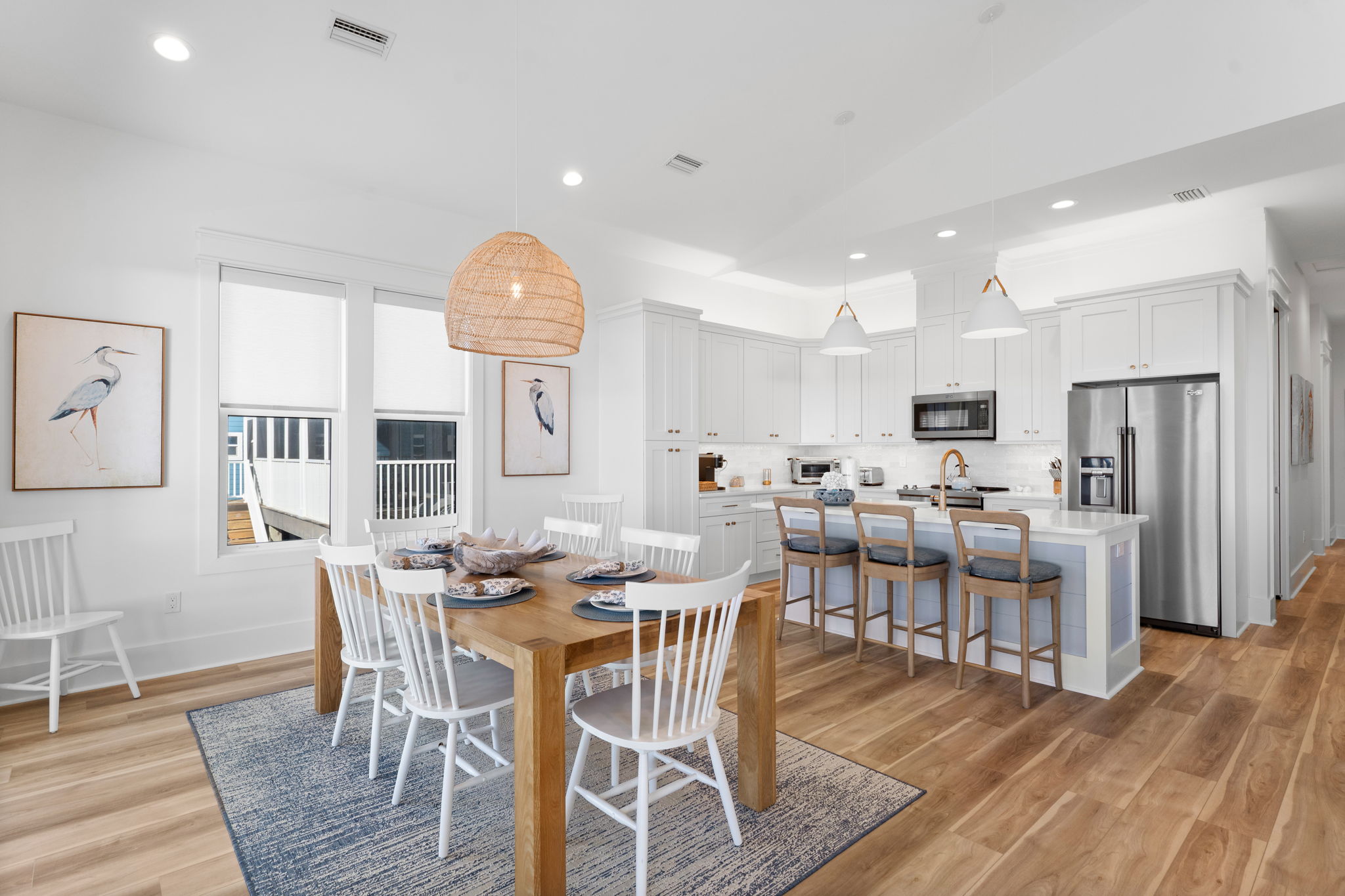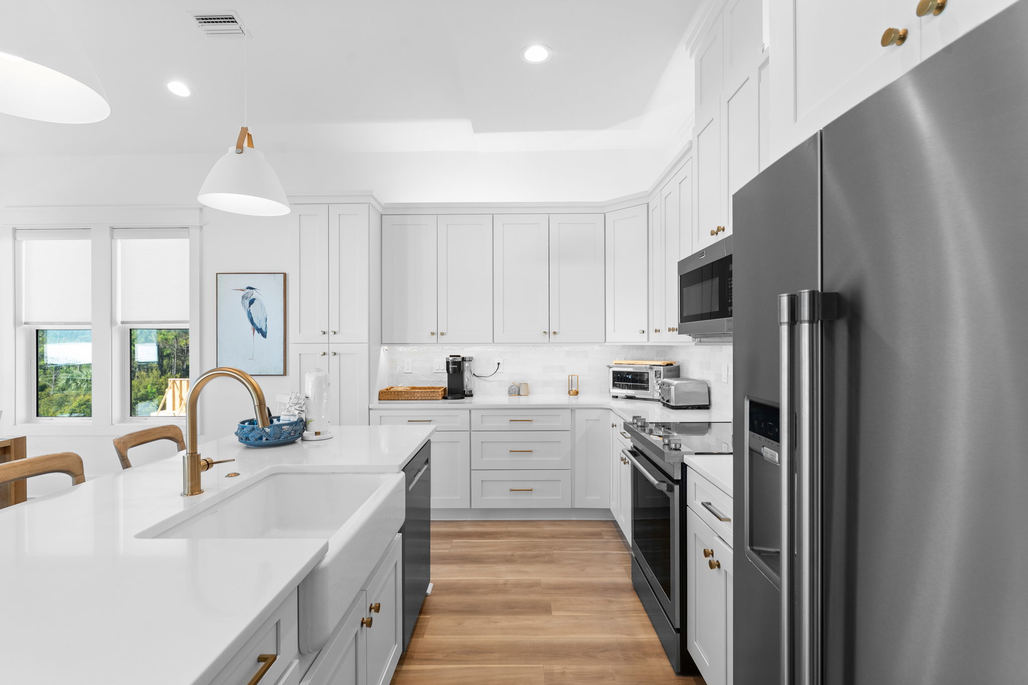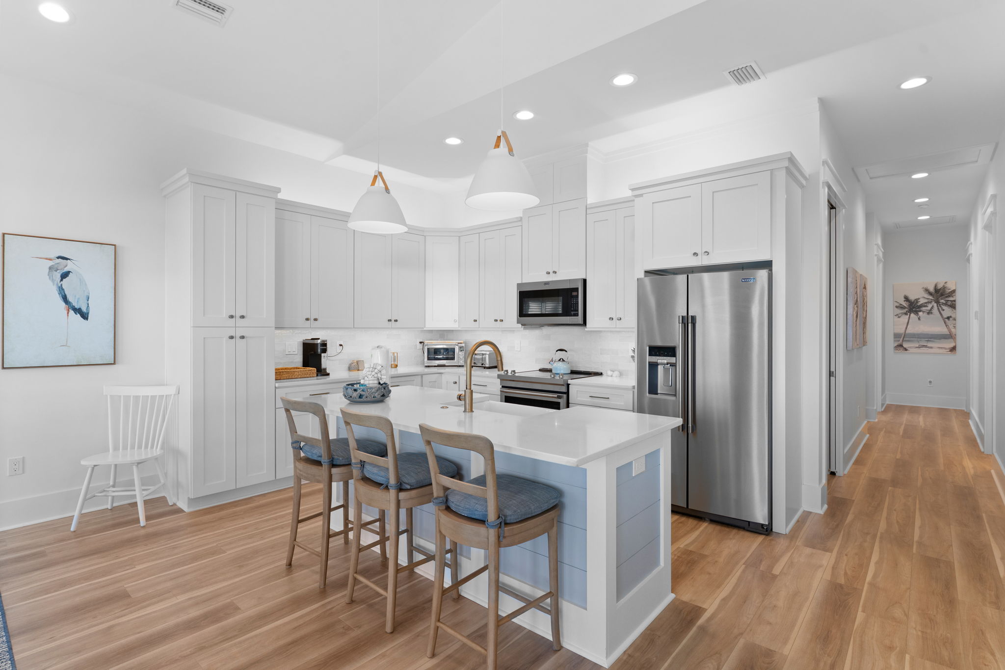 Step inside to an open living and kitchen area with large French windows overlooking the Gulf, filling the home with natural light and coastal charm. Each bedroom includes its own TV, ensuring everyone can relax in comfort.