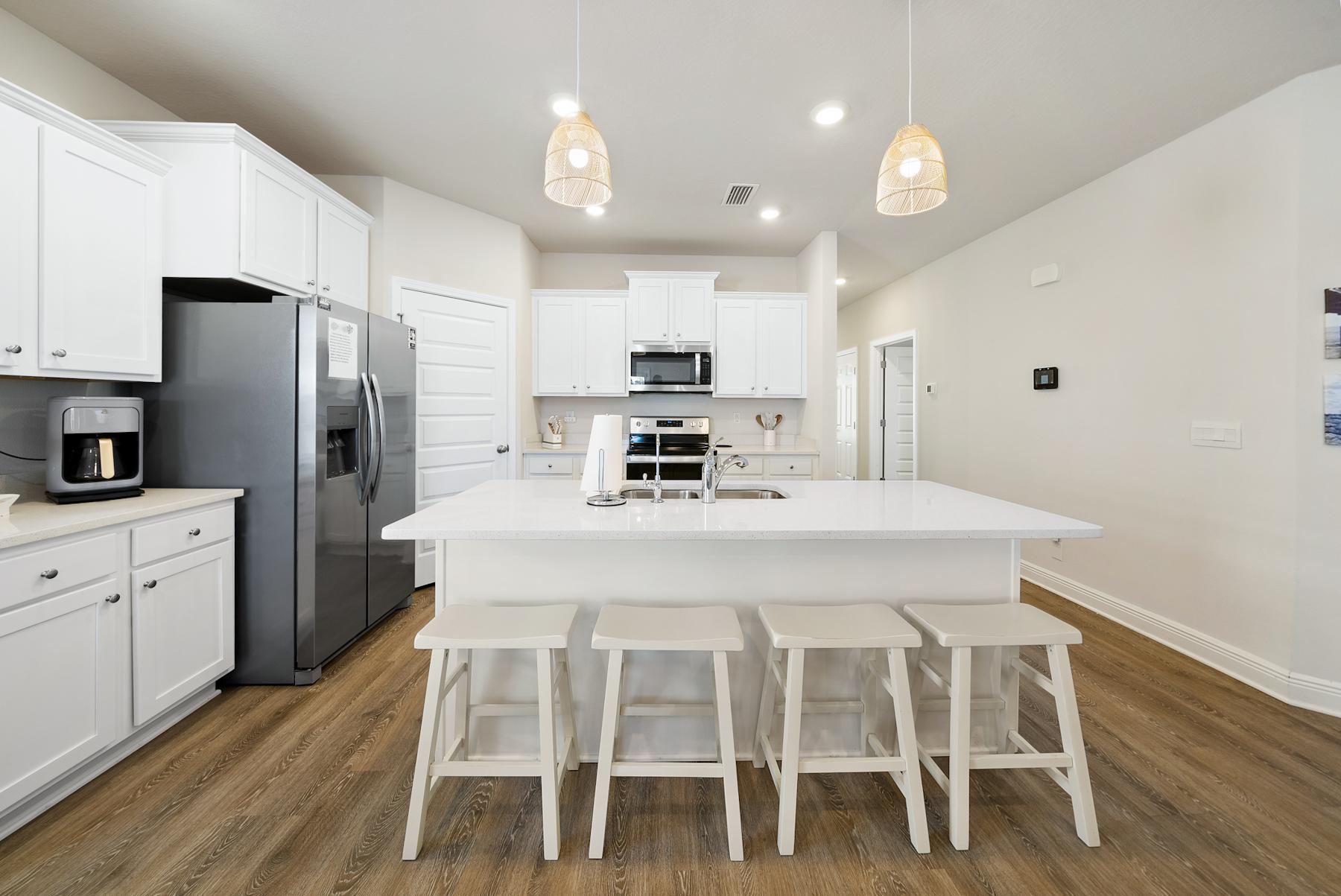 You'll discover an oasis in the primary bedroom with a king bed, and its dazzling en-suite bathroom. Here, you can relax in the large soaking tub. A second primary bedroom is available with a king bed, a third bedroom with a queen bed, and a fourth bedroom with bunk beds. Additional interior perks