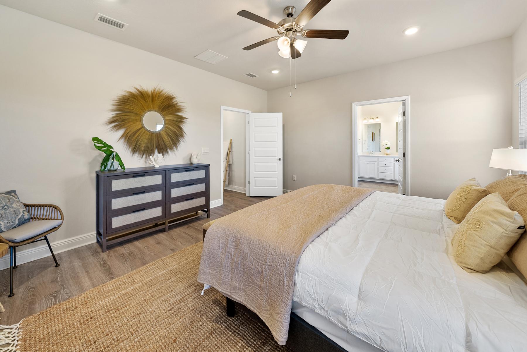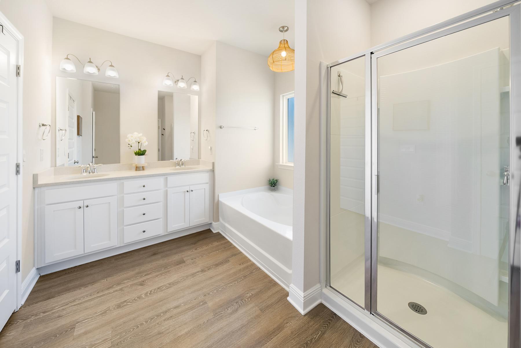 -Bedroom 1: King Bed, en-suite bathroom with tub and shower.