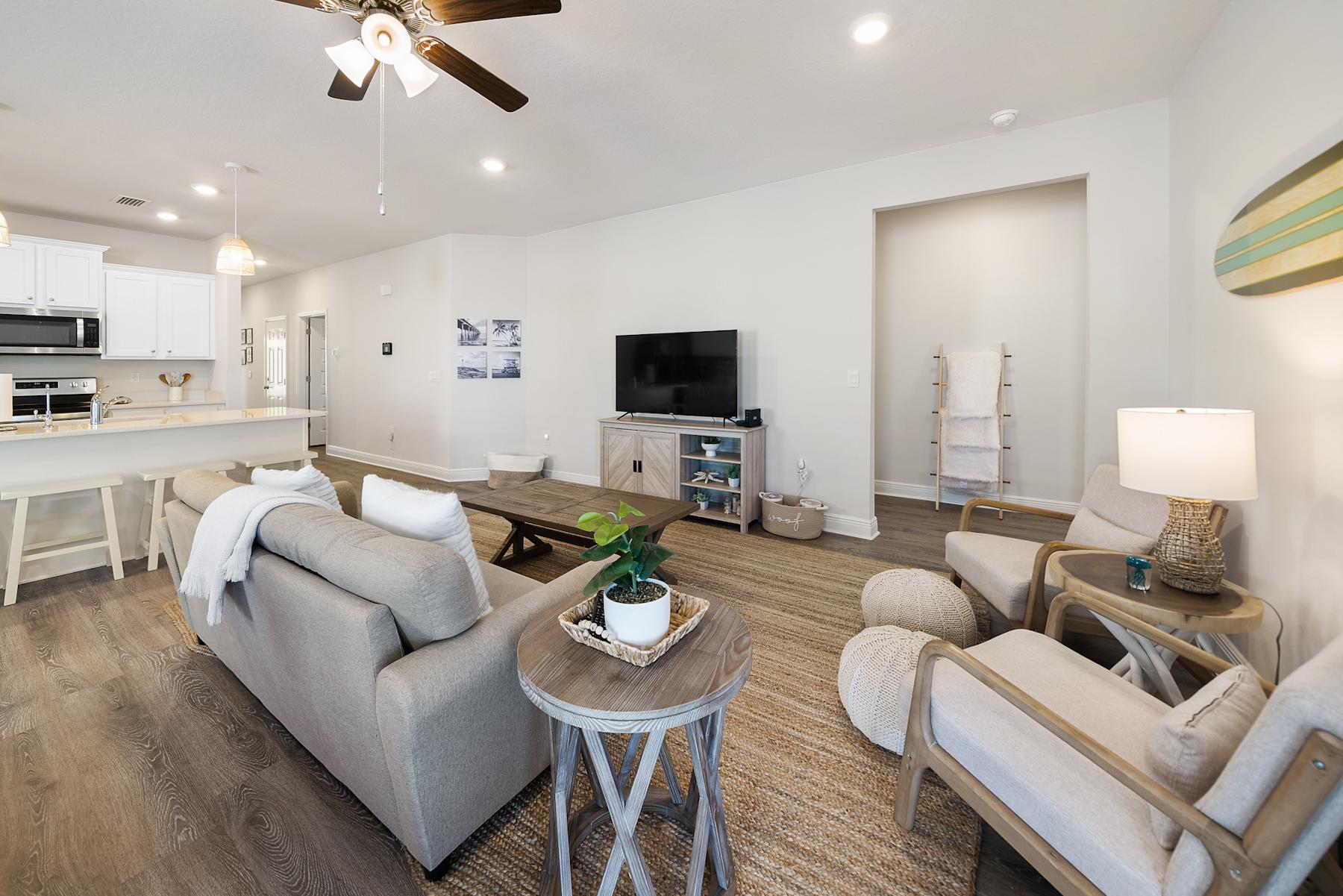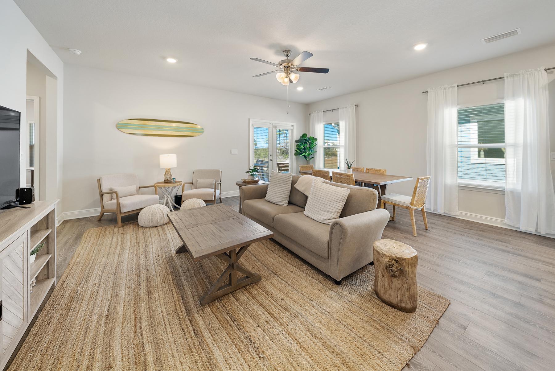 After a day in the sun, rinse off in the outdoor shower and then find yourself lounging in the spacious living room where plenty of seating and a large TV await your relaxation to lounge. An additional TV