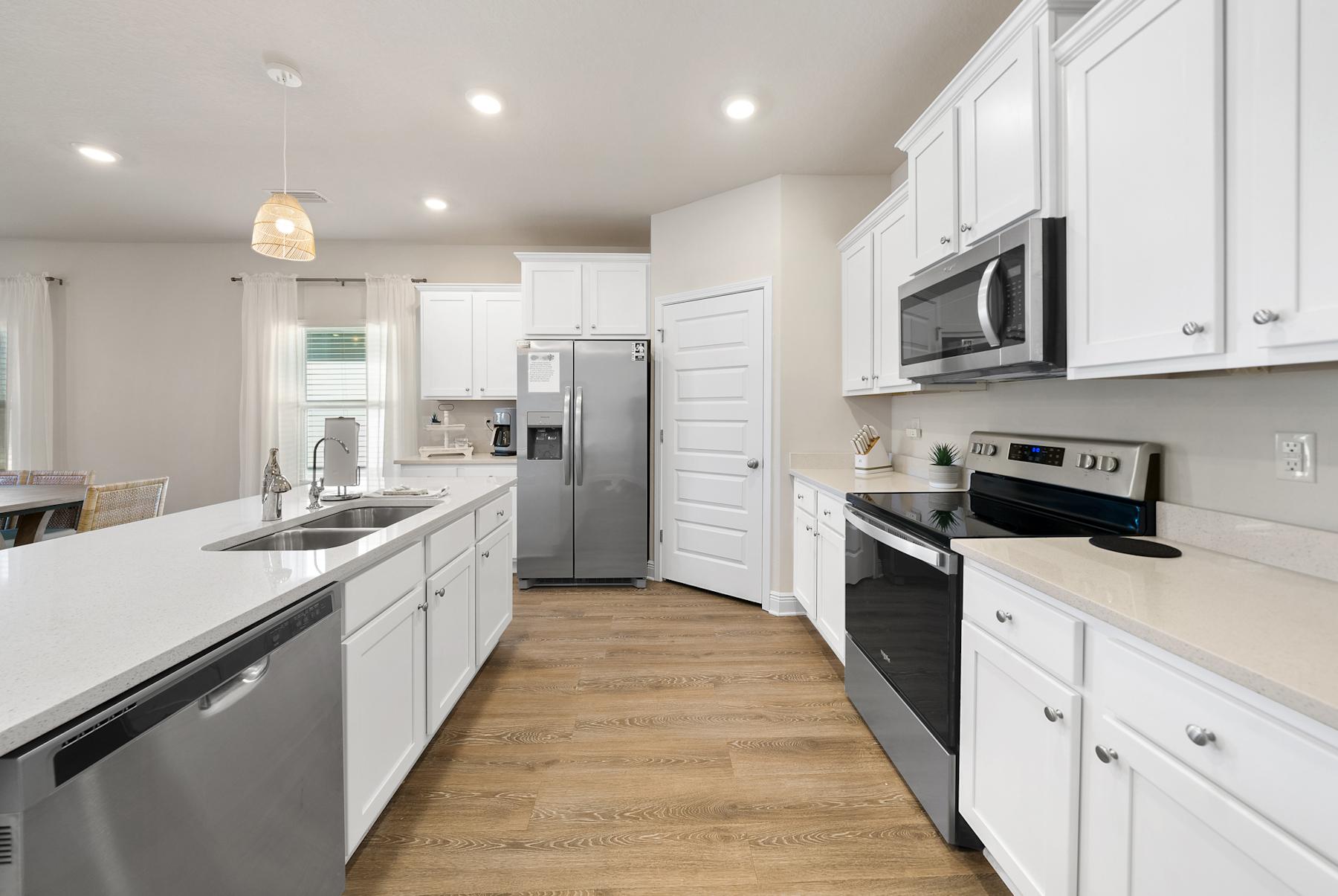 room ensures all family members can be tuned into their favorite shows or sports games. Whip up delicious meals in the well-equipped kitchen with large island and bar seating. Fire up the outdoor gas grill to assist in preparing your meals. Have your morning cup of coffee on the patio, with ample seating, or eat your evening meal while watching the sunset. A second kitchen area is available with stainless steel appliances and additional seating.