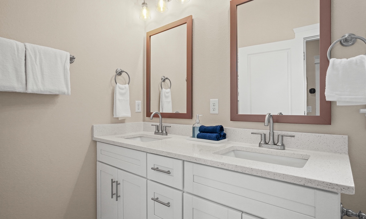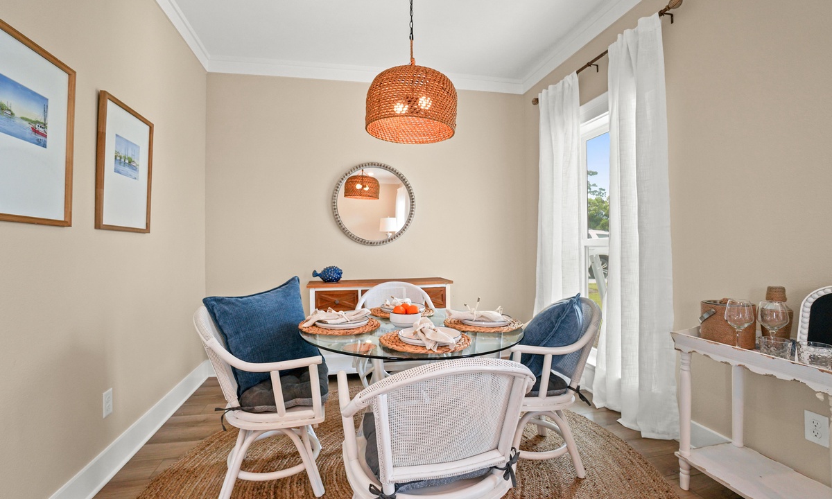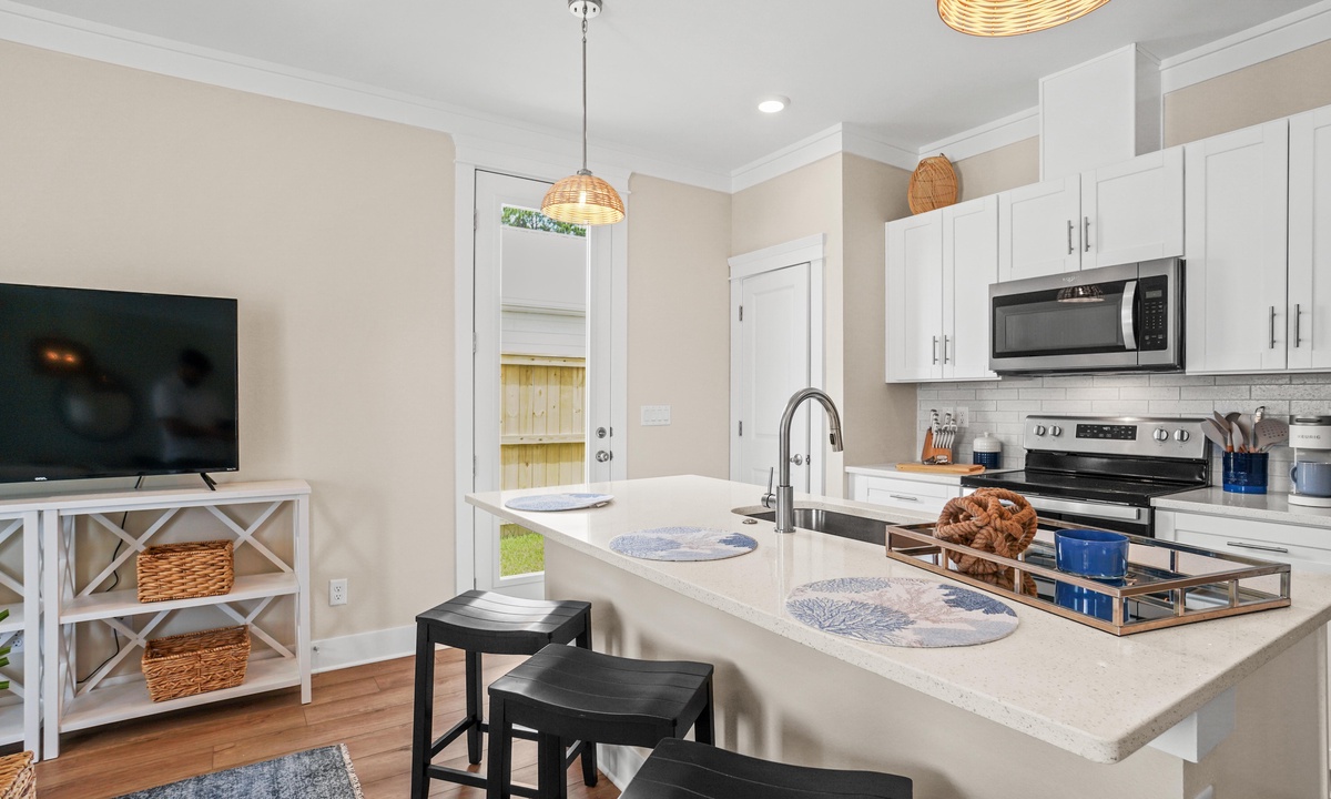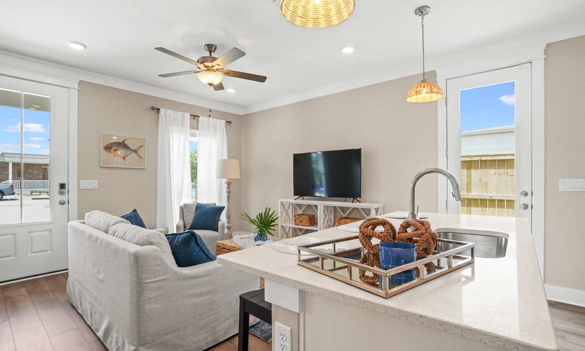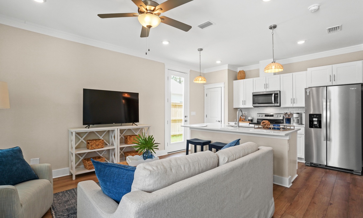 The interior welcomes guests with tasteful coastal decor, creating a serene ambiance throughout. The living area is inviting, offering enough space for relaxation and entertainment, whether watching movies or enjoying lively conversations.