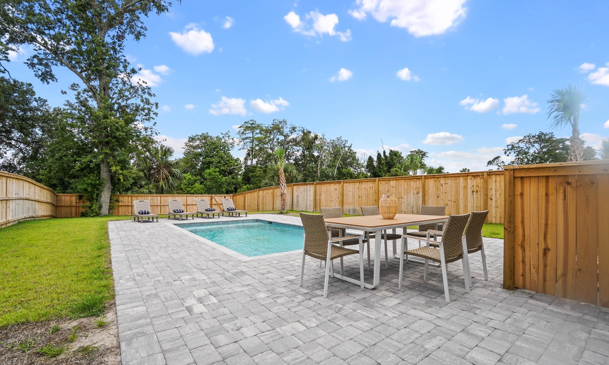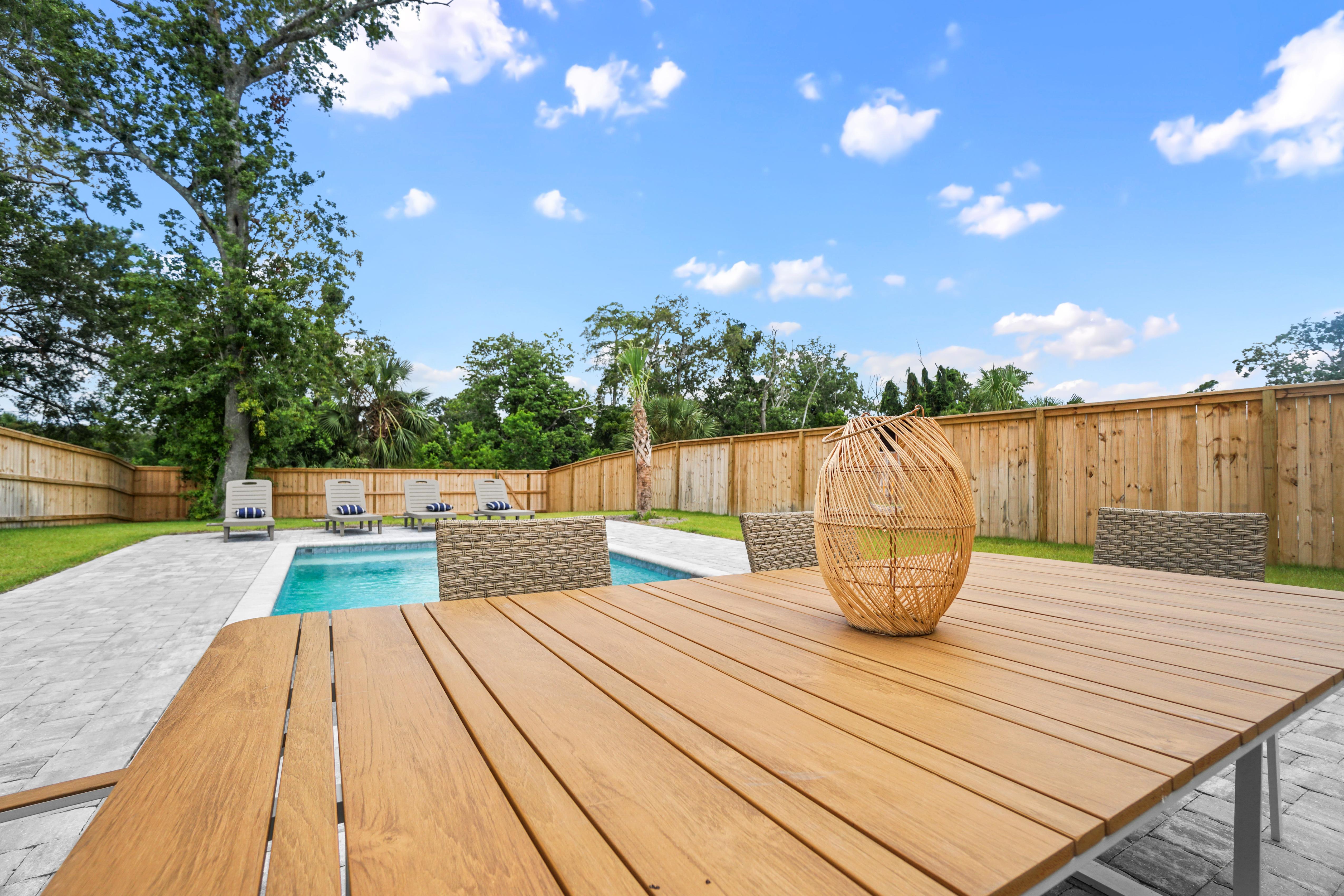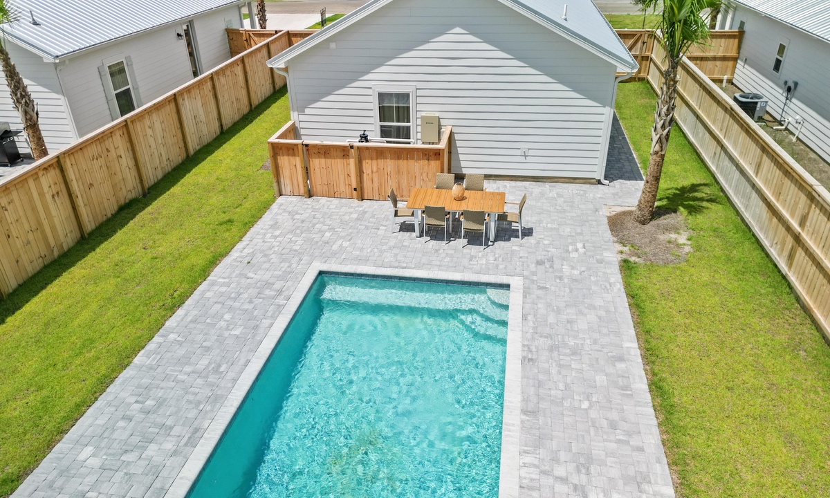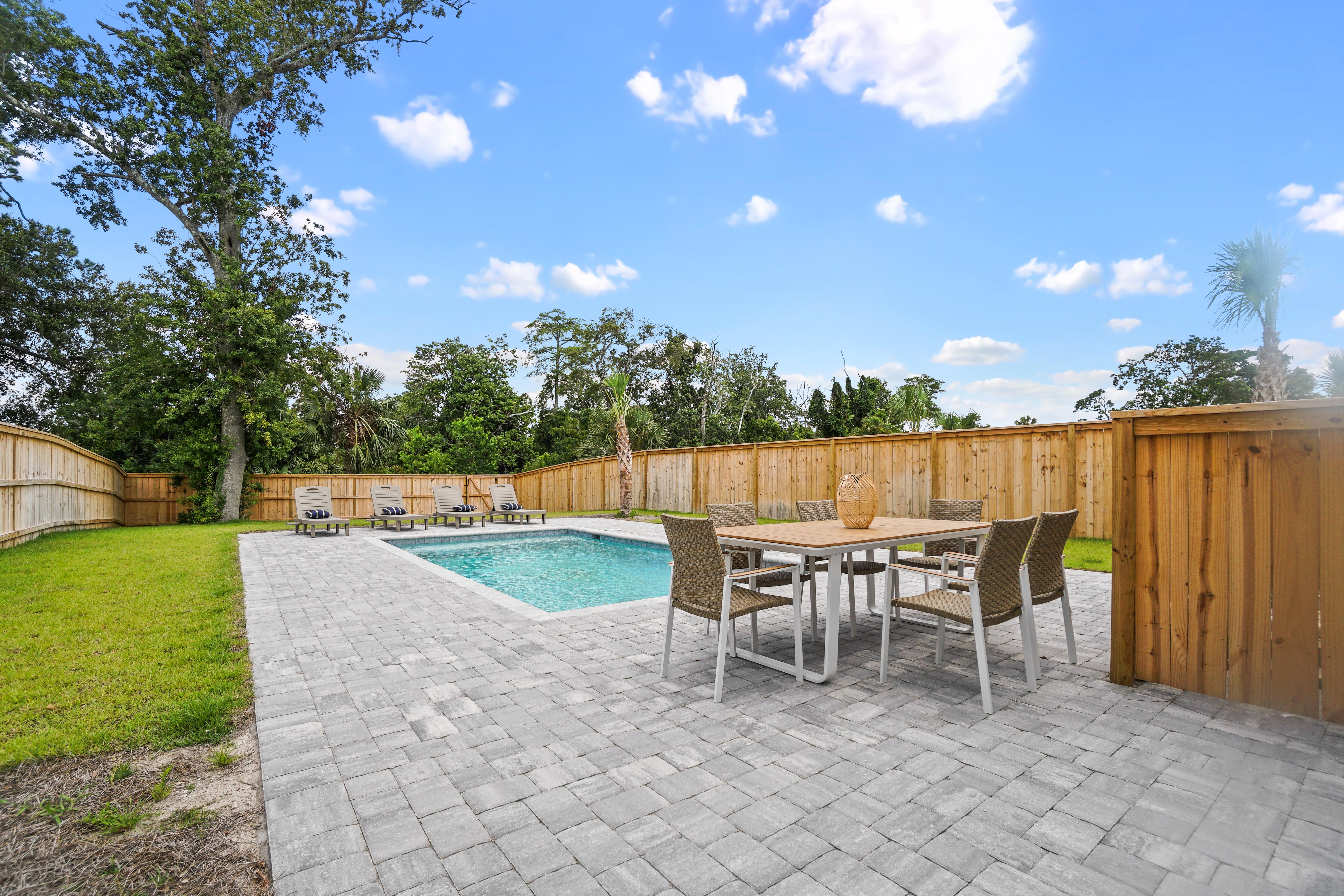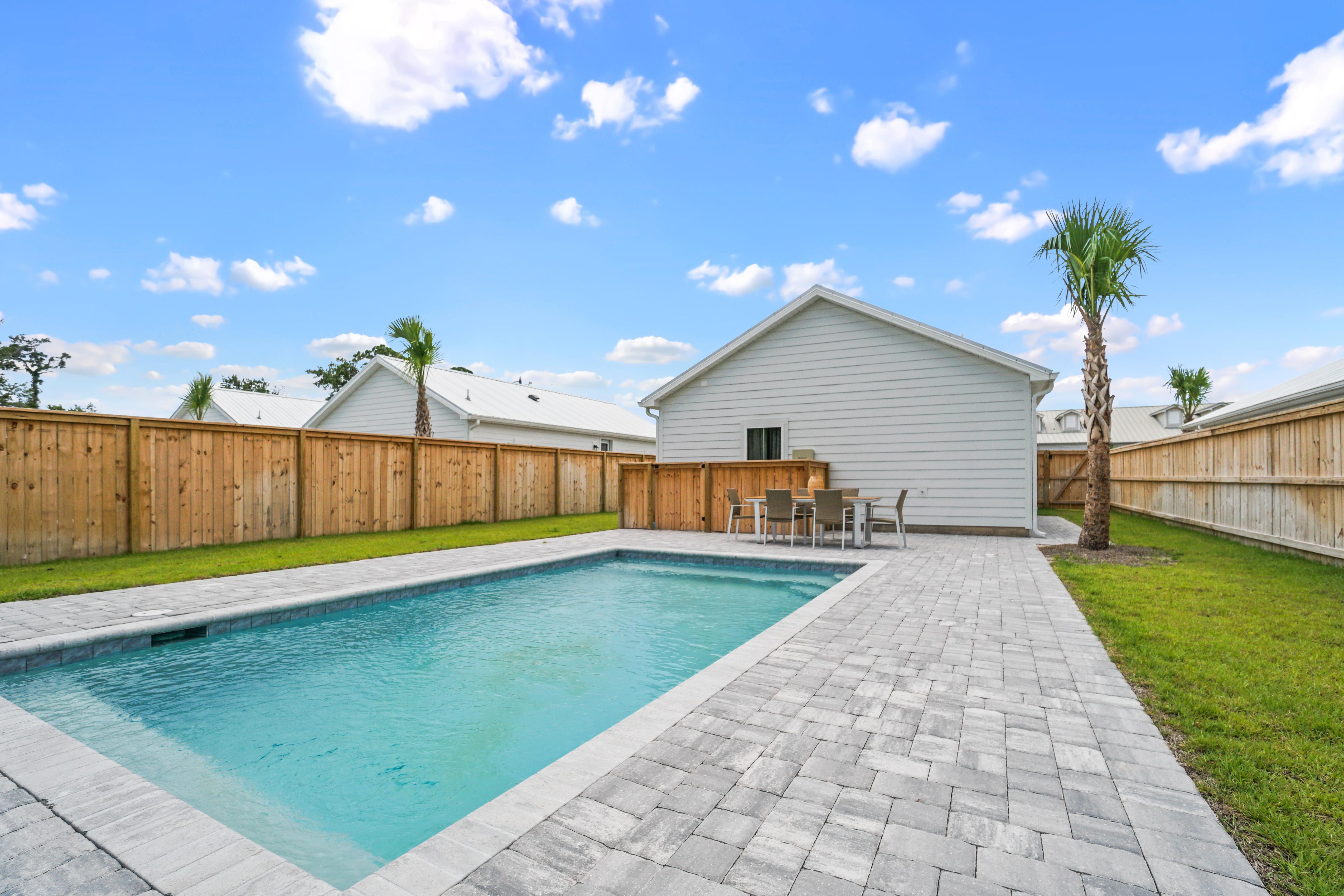 A true highlight of this retreat is its backyard sanctuary, complete with a private pool. This tranquil oasis invites guests to unwind beneath the Florida sun, offering a refreshing escape for both relaxation and rejuvenation. It's an idyllic setting for morning coffee or evening cocktails before planning a day of shopping or beach going.