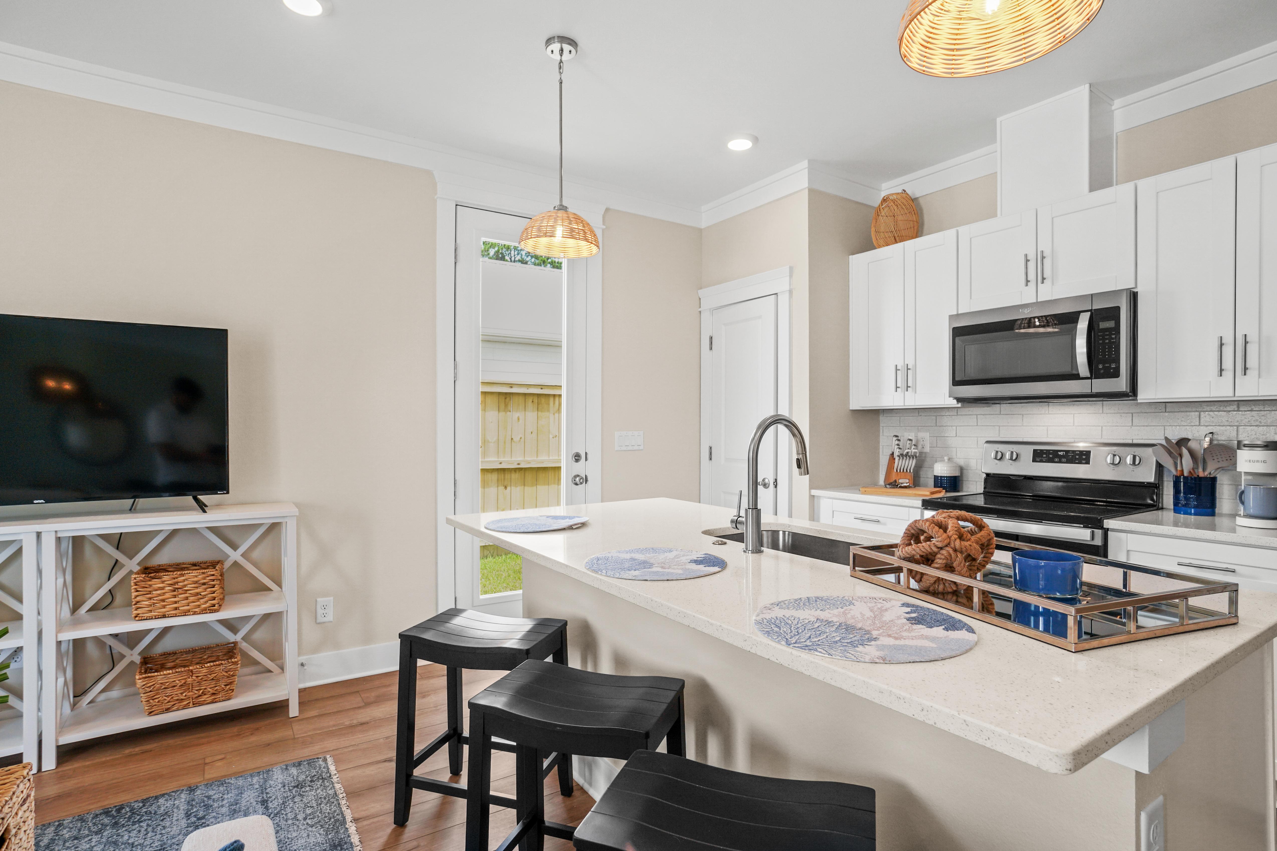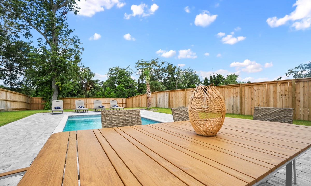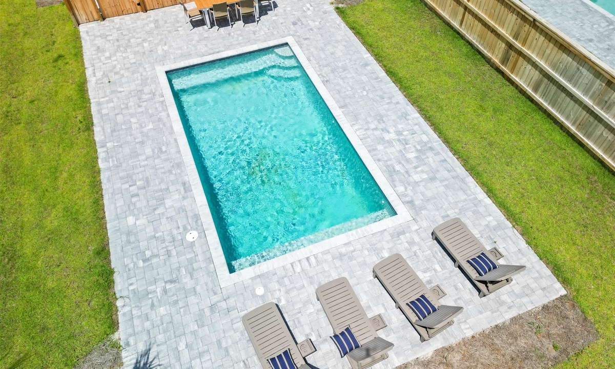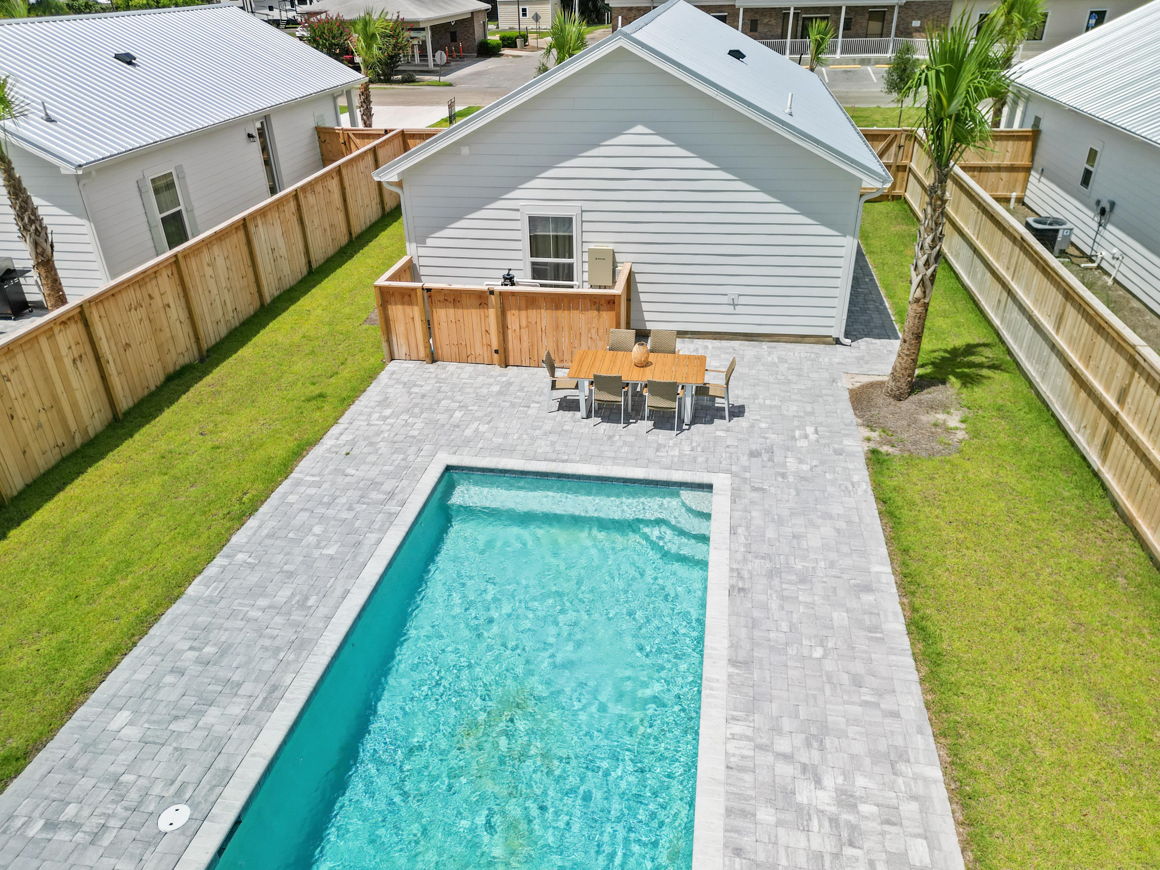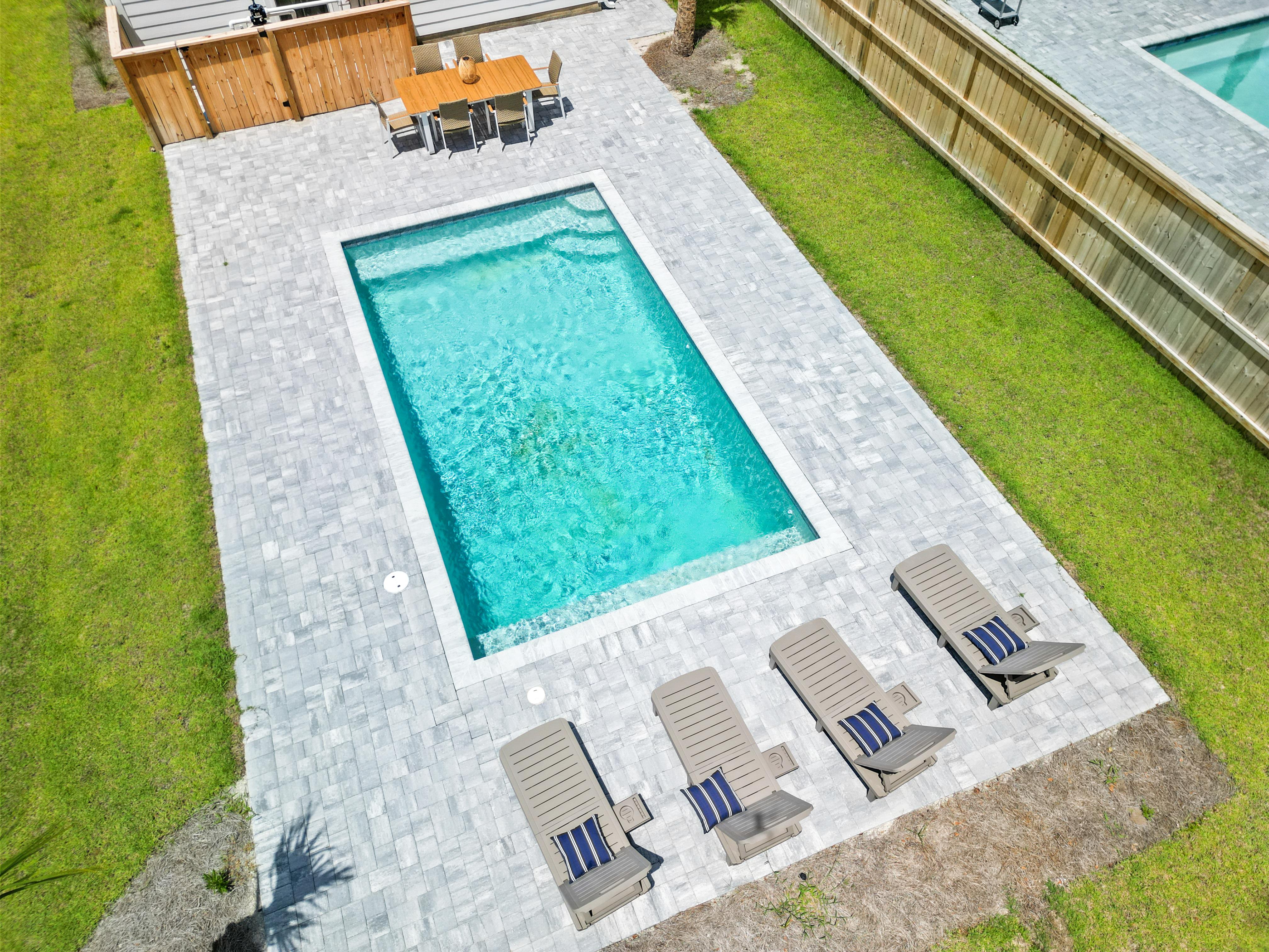 A true highlight of this retreat is its backyard sanctuary, complete with a private pool. This tranquil oasis invites guests to unwind beneath the Florida sun, offering a refreshing escape for both relaxation and rejuvenation. It's an idyllic setting for morning coffee or evening cocktails before planning a day of shopping or beach going.