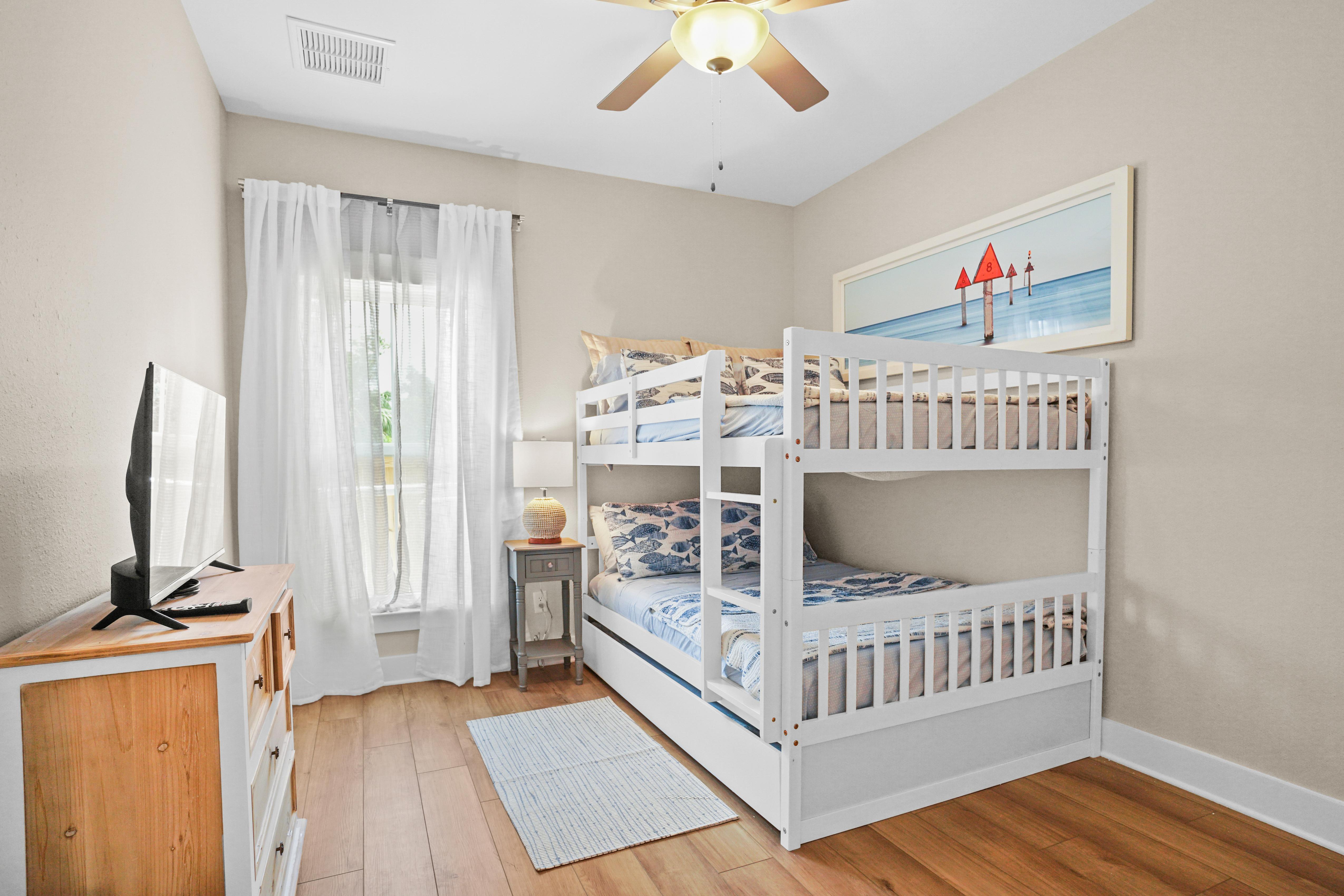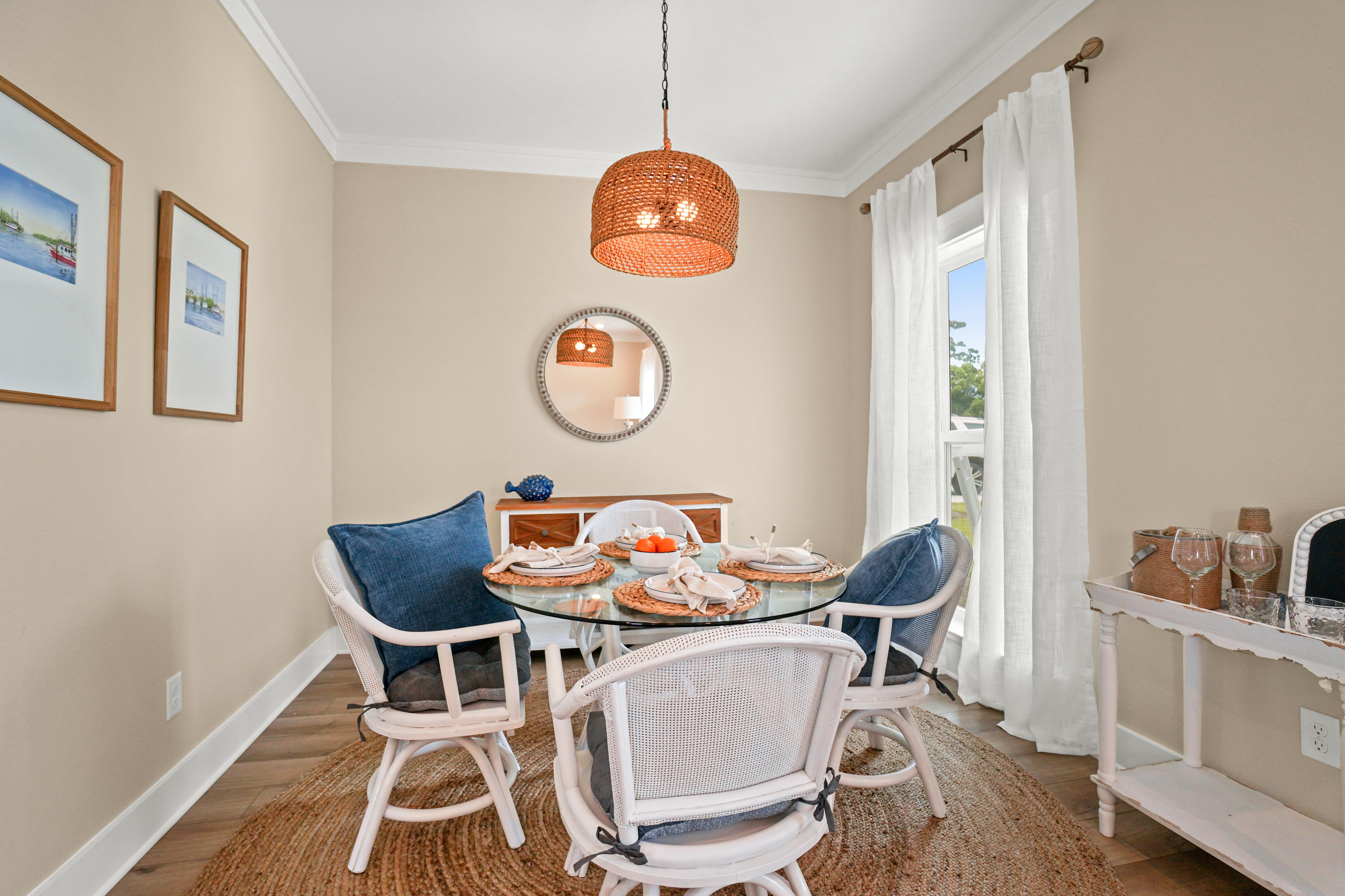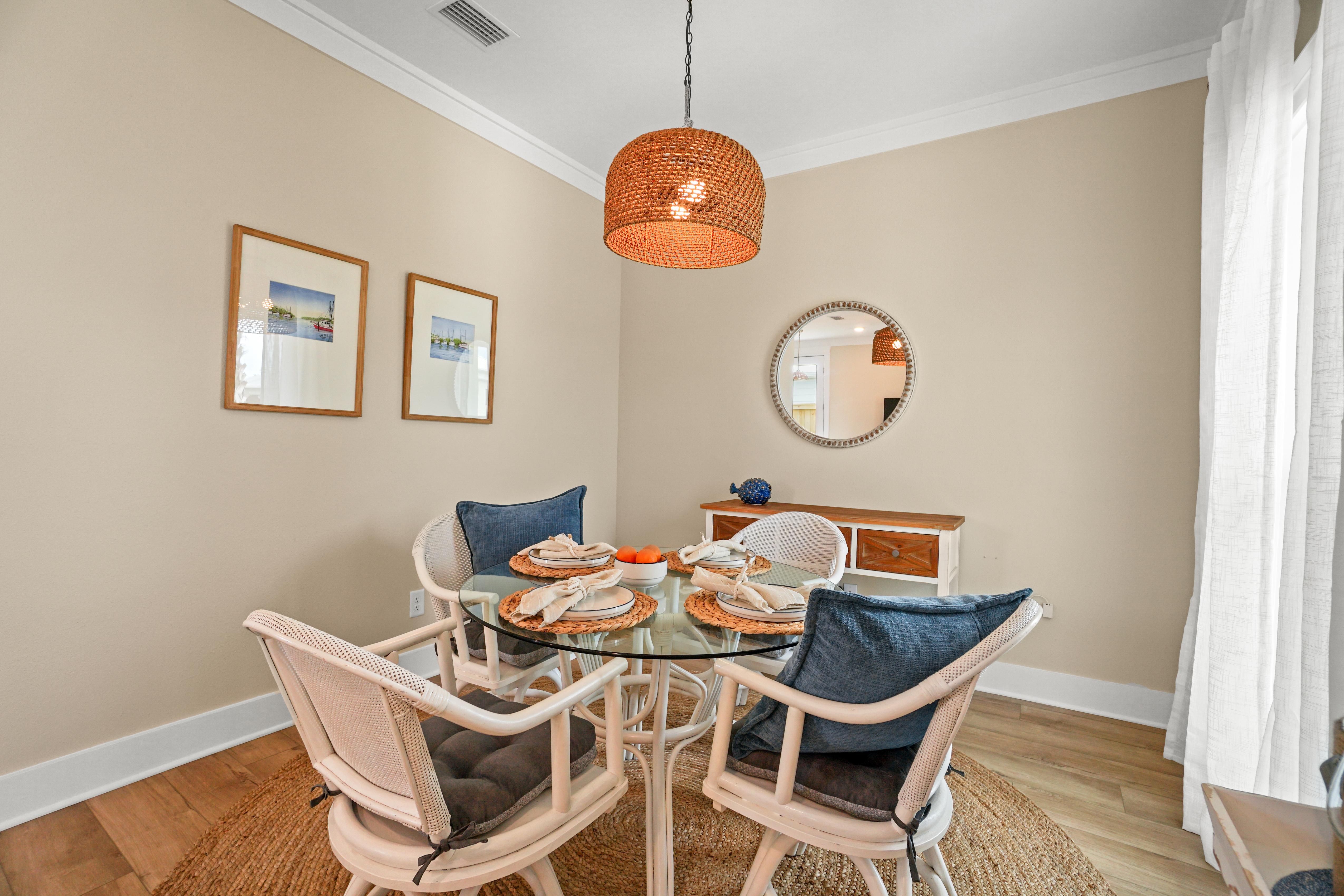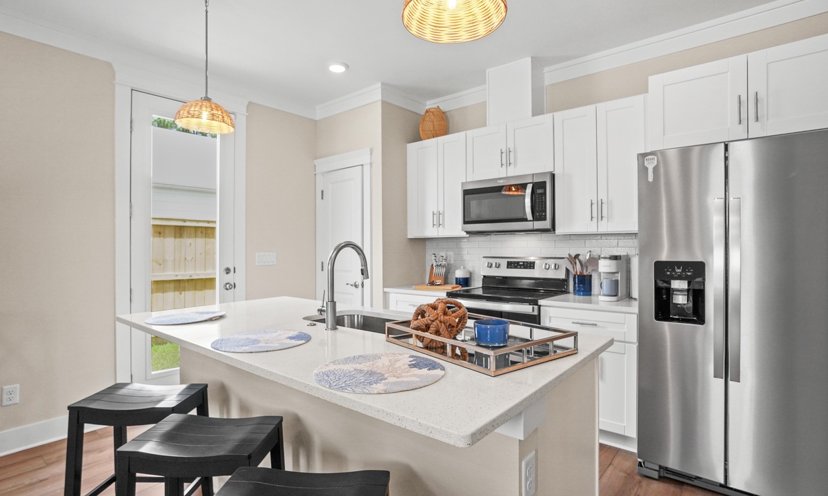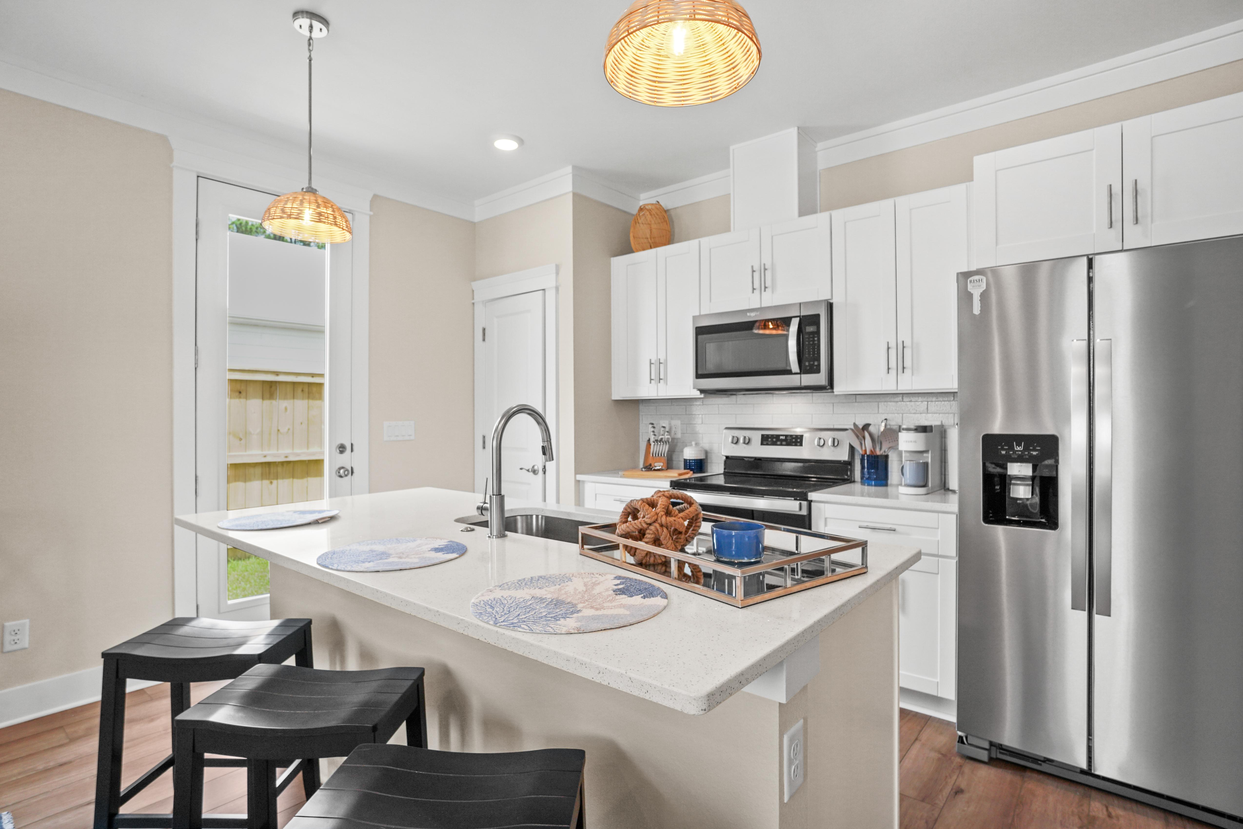 A true highlight of this retreat is its backyard sanctuary, complete with a private pool. This tranquil oasis invites guests to unwind beneath the Florida sun, offering a refreshing escape for both relaxation and rejuvenation. It's an idyllic setting for morning coffee or evening cocktails before planning a day of shopping or beach going.