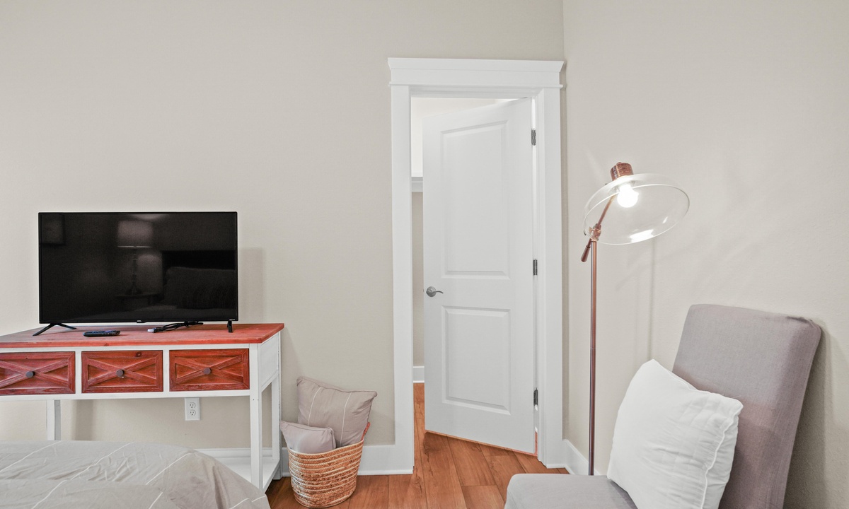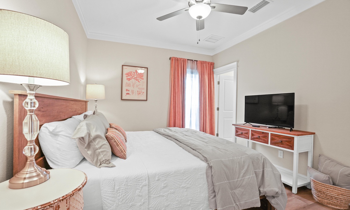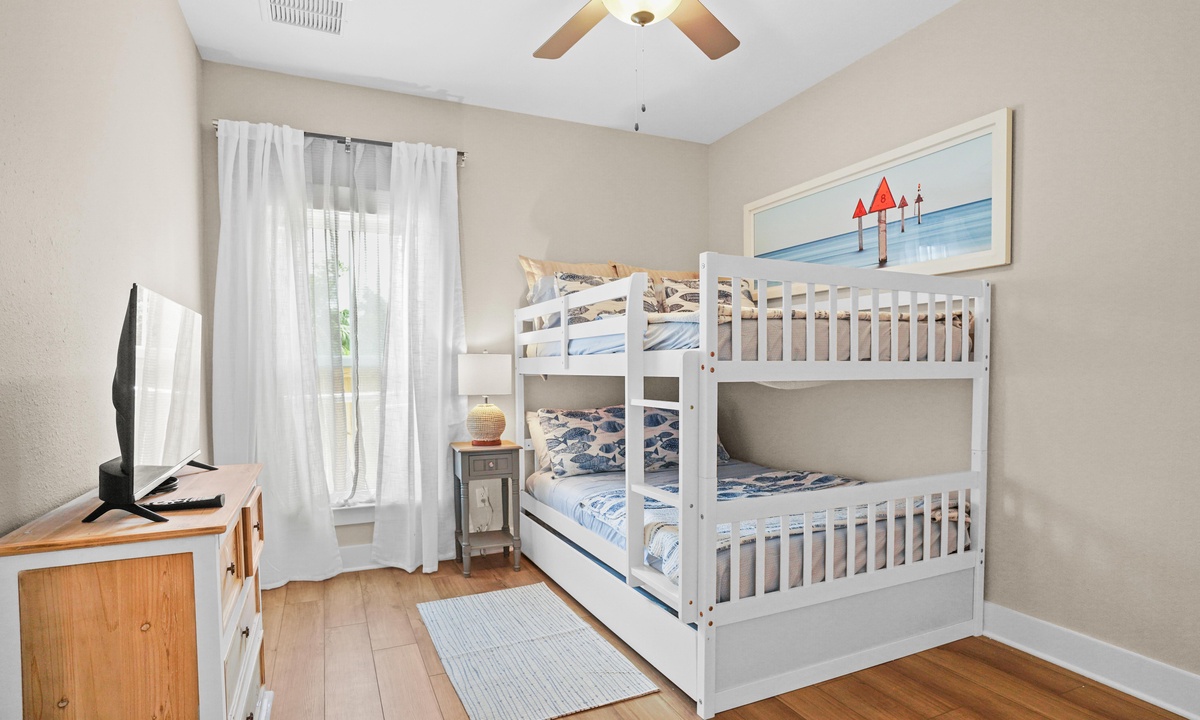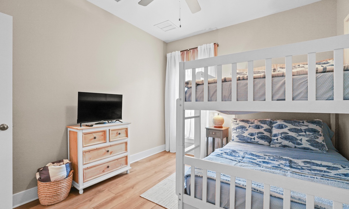 Nestled in the heart of downtown Port St. Joe, Florida, this enchanting cottage exudes coastal elegance and promises a delightful retreat. Featuring two distinctively styled bedrooms, one adorned with a cozy bunk bed (full over full, listed as queen over queen on airbnb) arrangement and the other boasting a luxurious king-sized bed, it caters perfectly to families or small groups seeking comfort and charm.