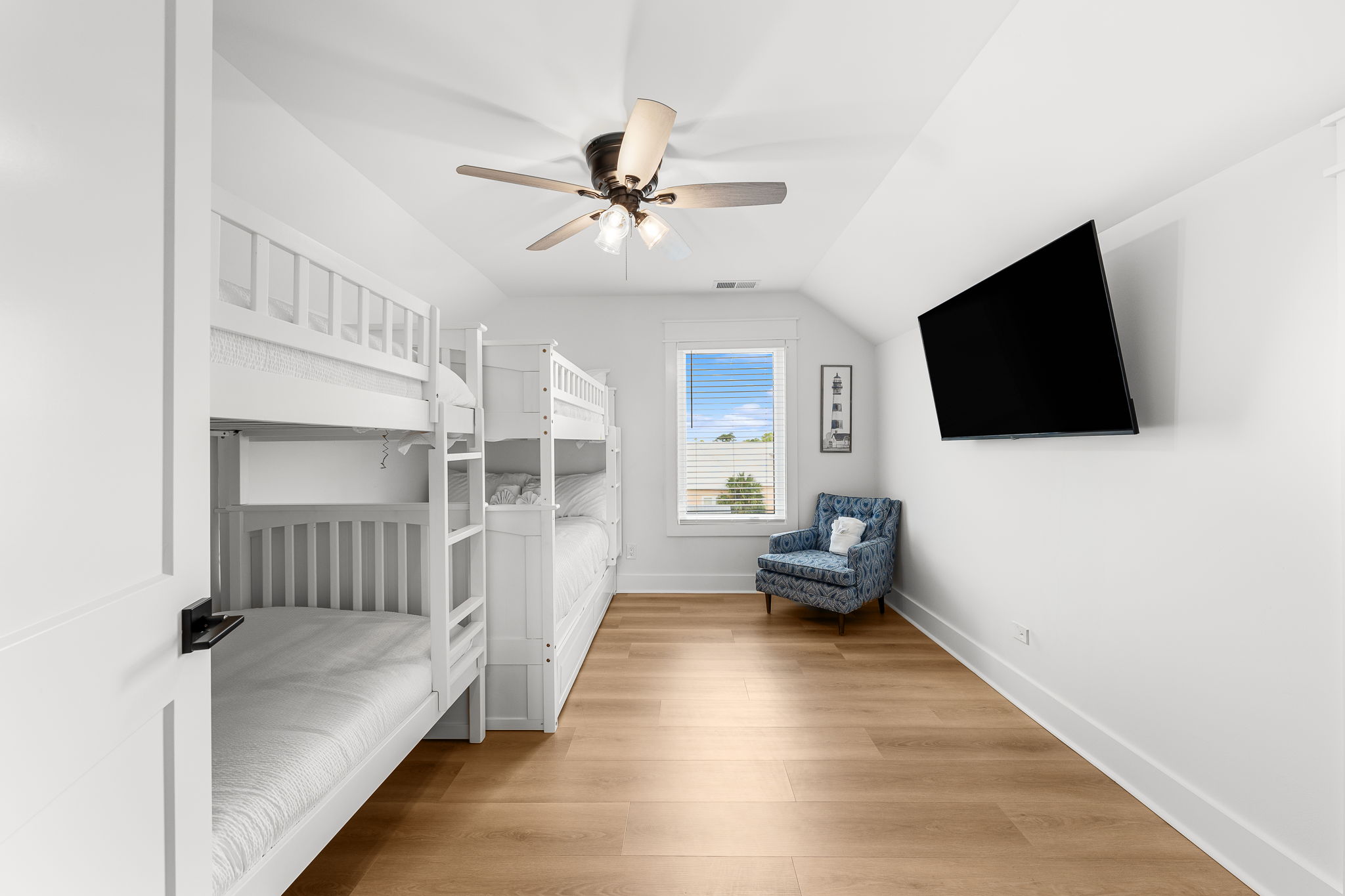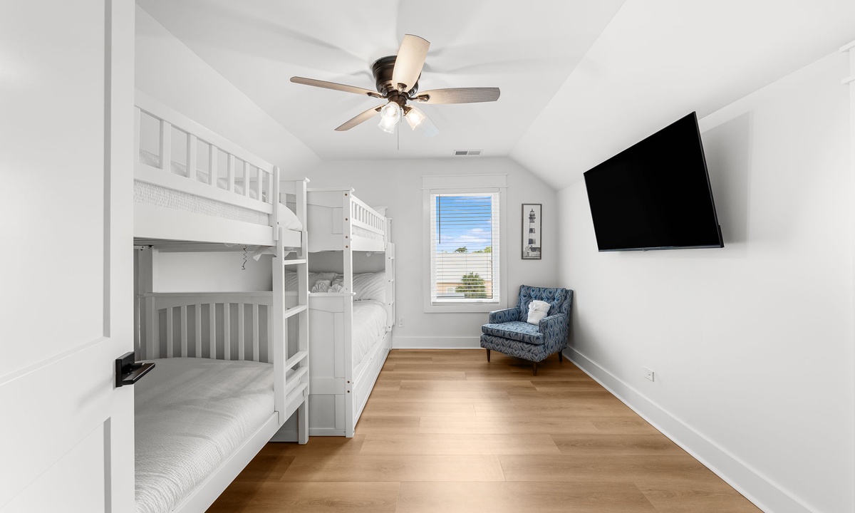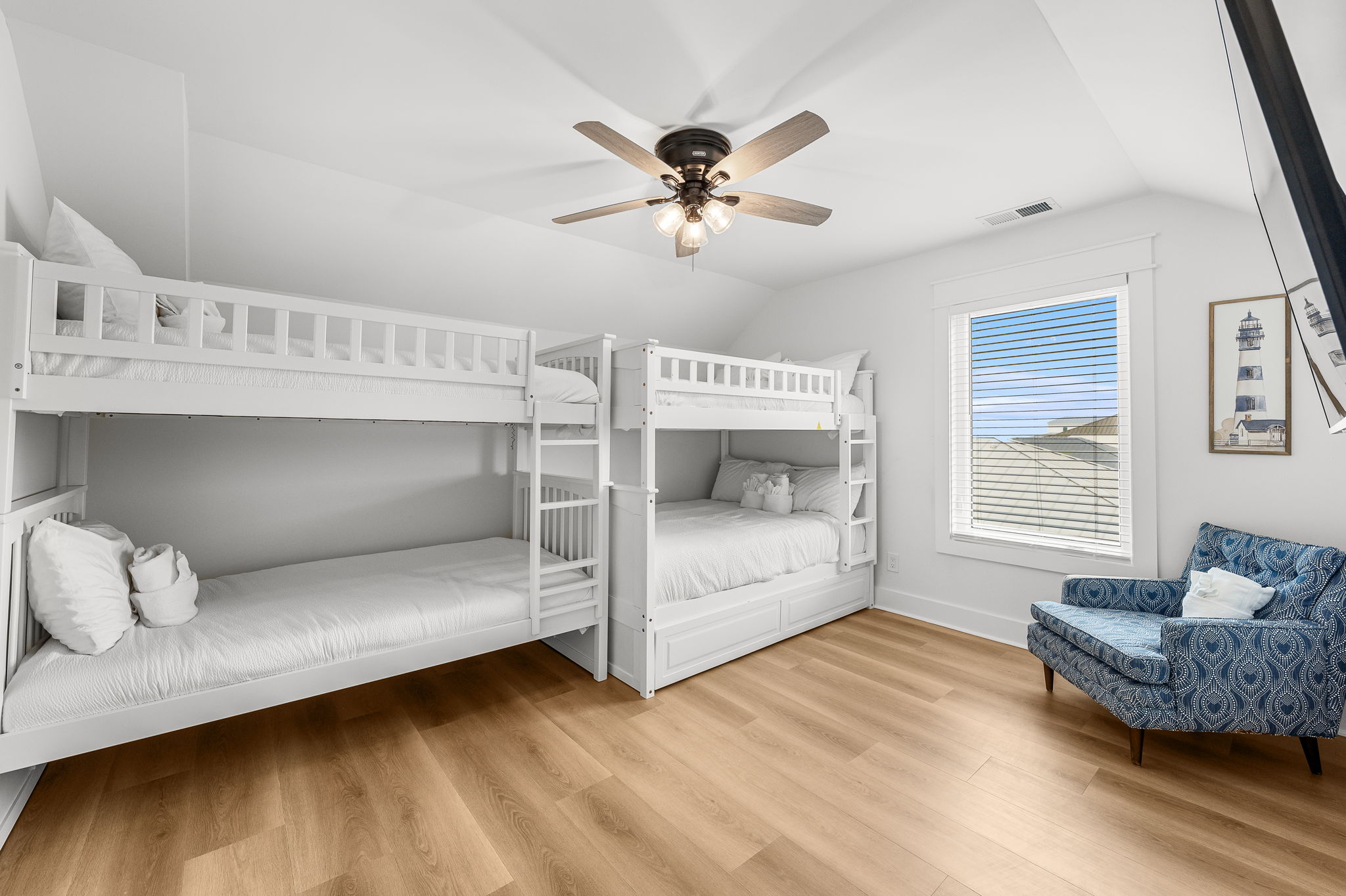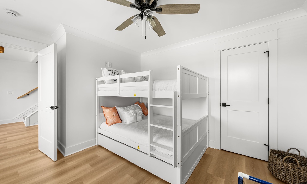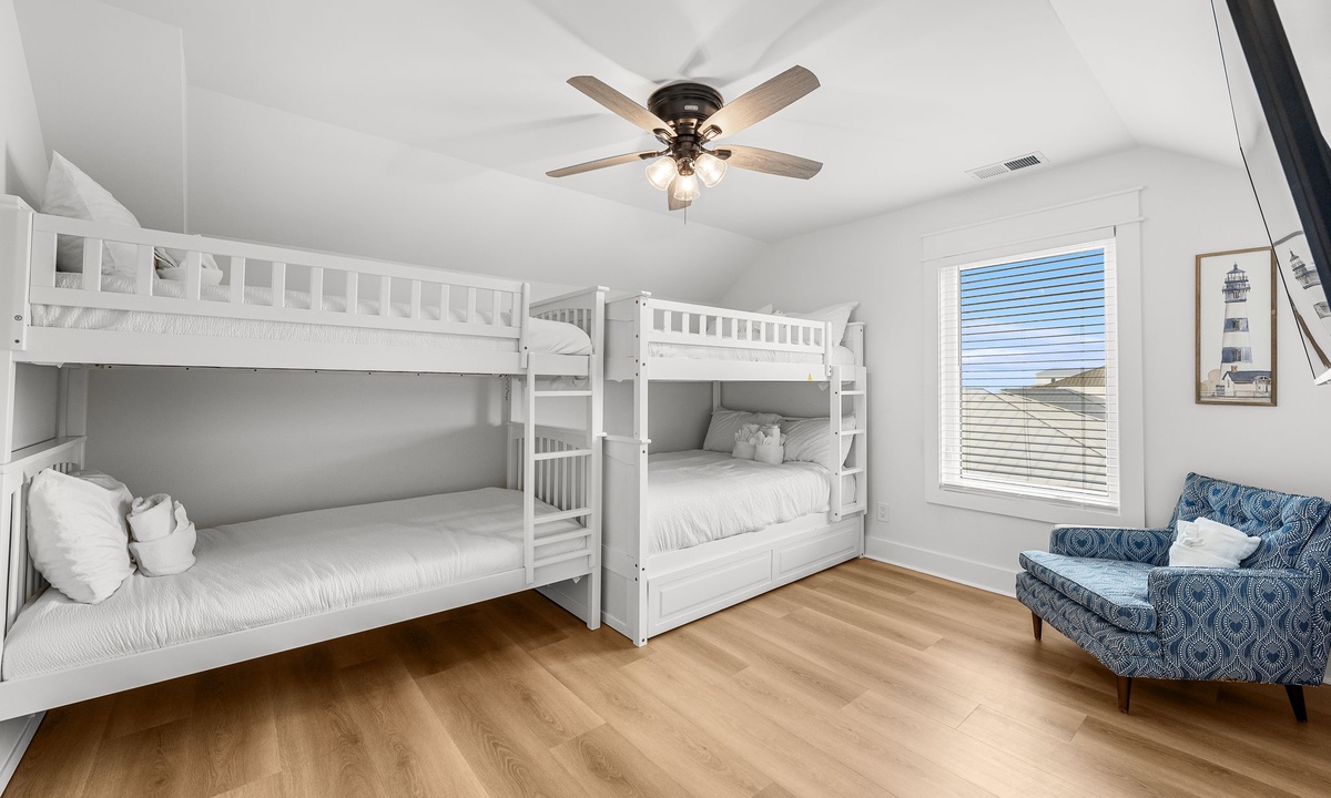 Third Floor: 1 King + Twin/Twin bunk room & Full/Full bunk, 1 bath