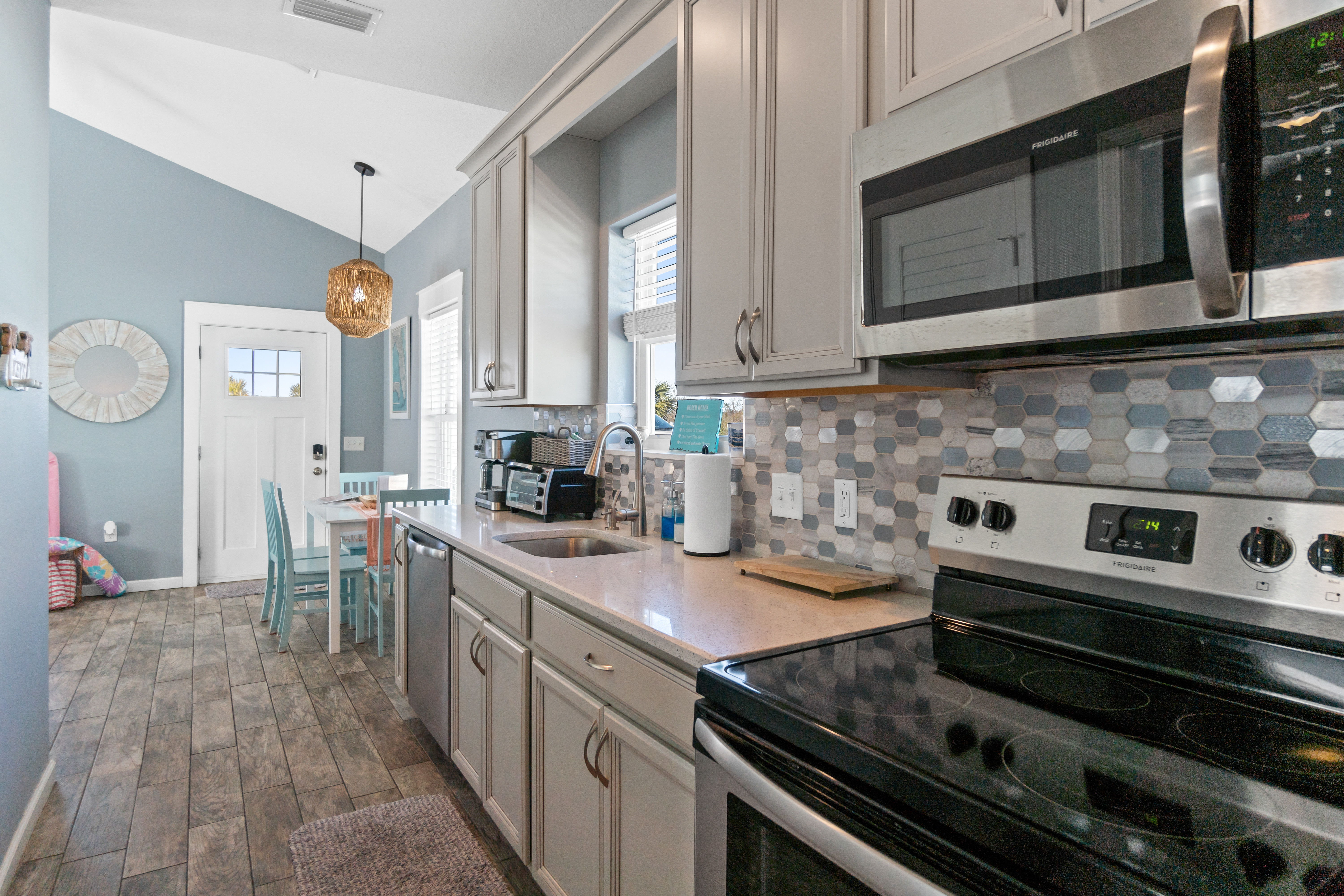 - Kitchen - Kitchen space where guests can cook their own meals. Refrigerator, microwave, pots and pans, dishes and flatware, bowls, plates, cups, freezer, dishwasher, stove, oven, kcup and drip coffee maker, wine glasses, toaster oven, baking sheet, blender, crock pot, dining table, starter paper towels and dish soap